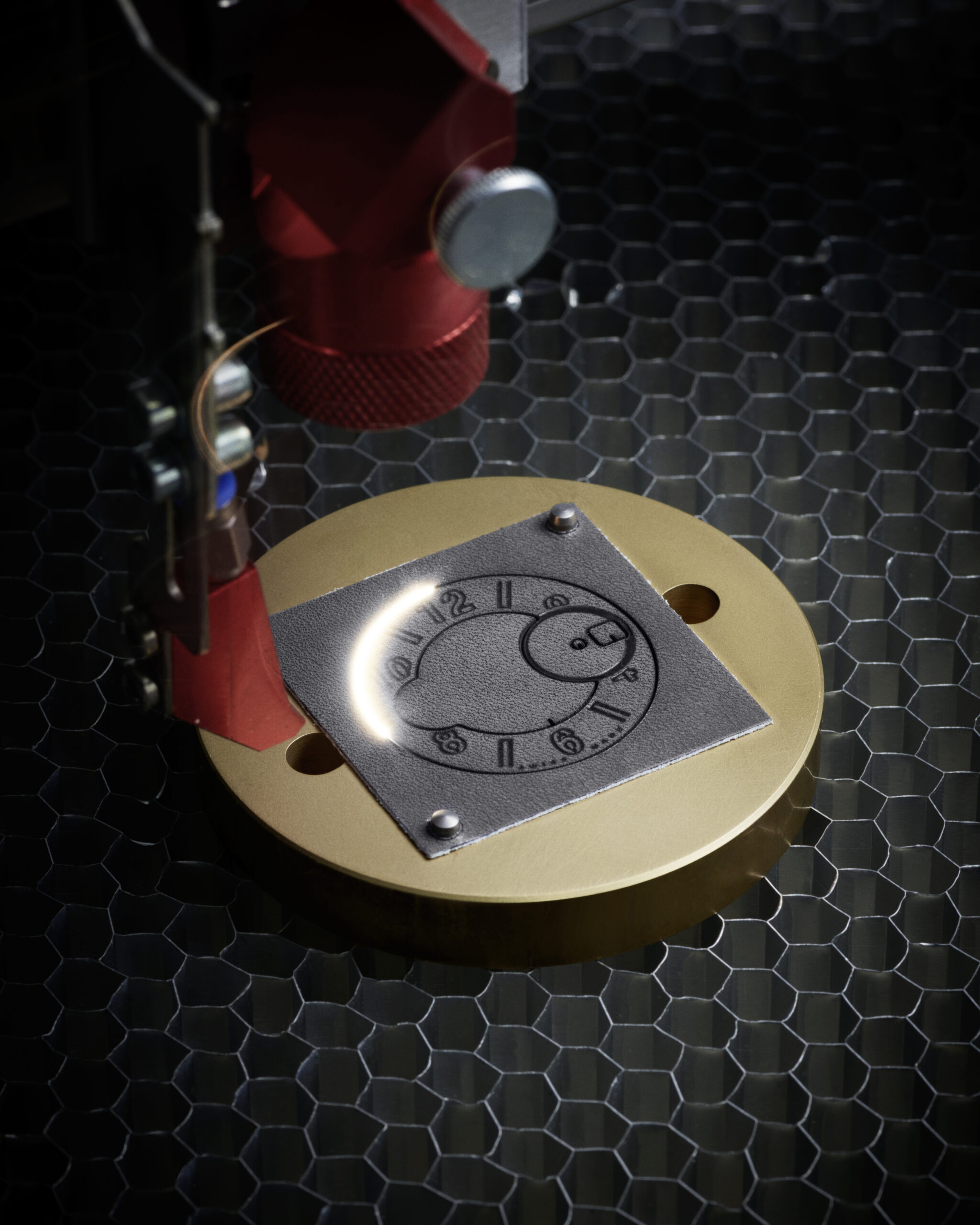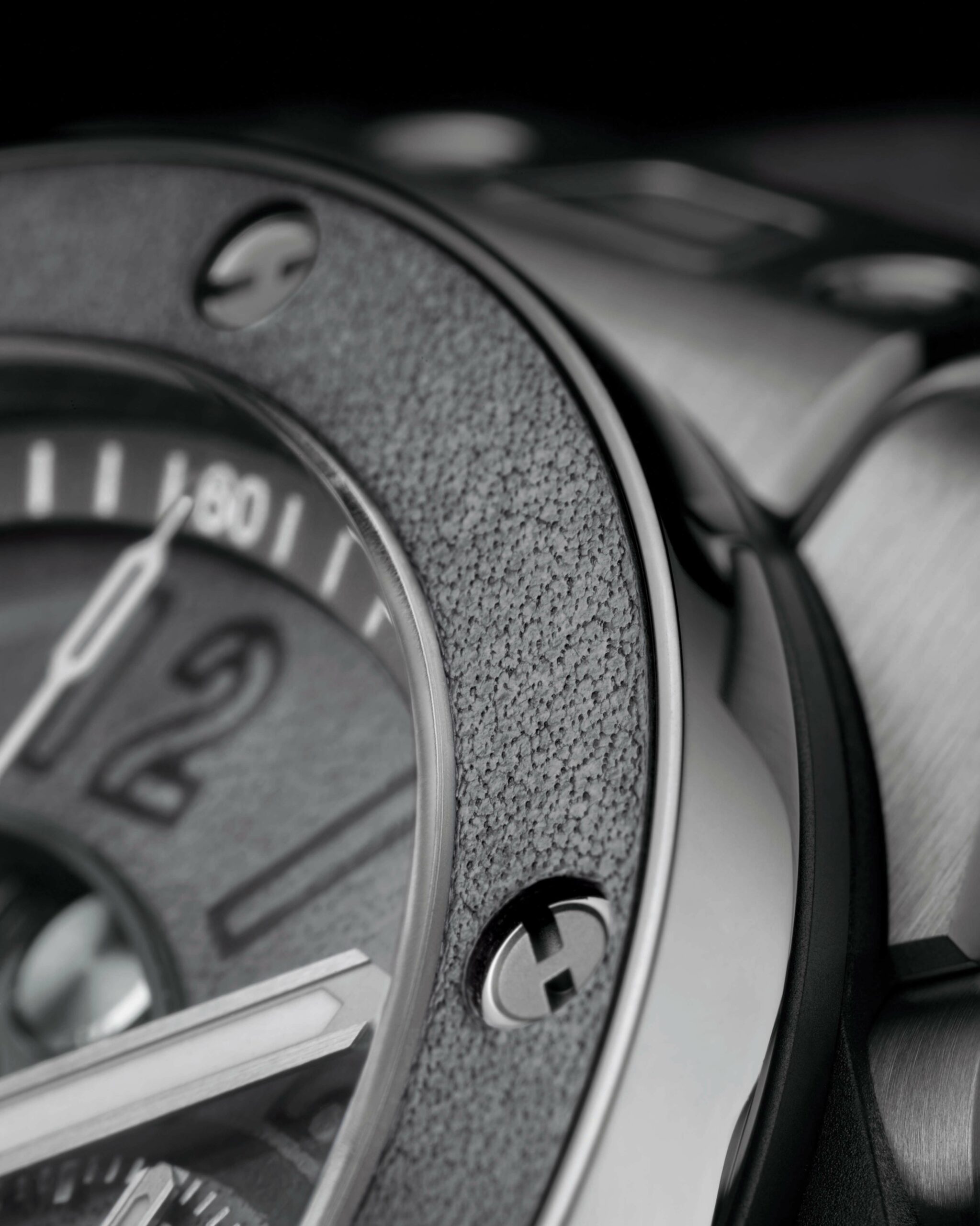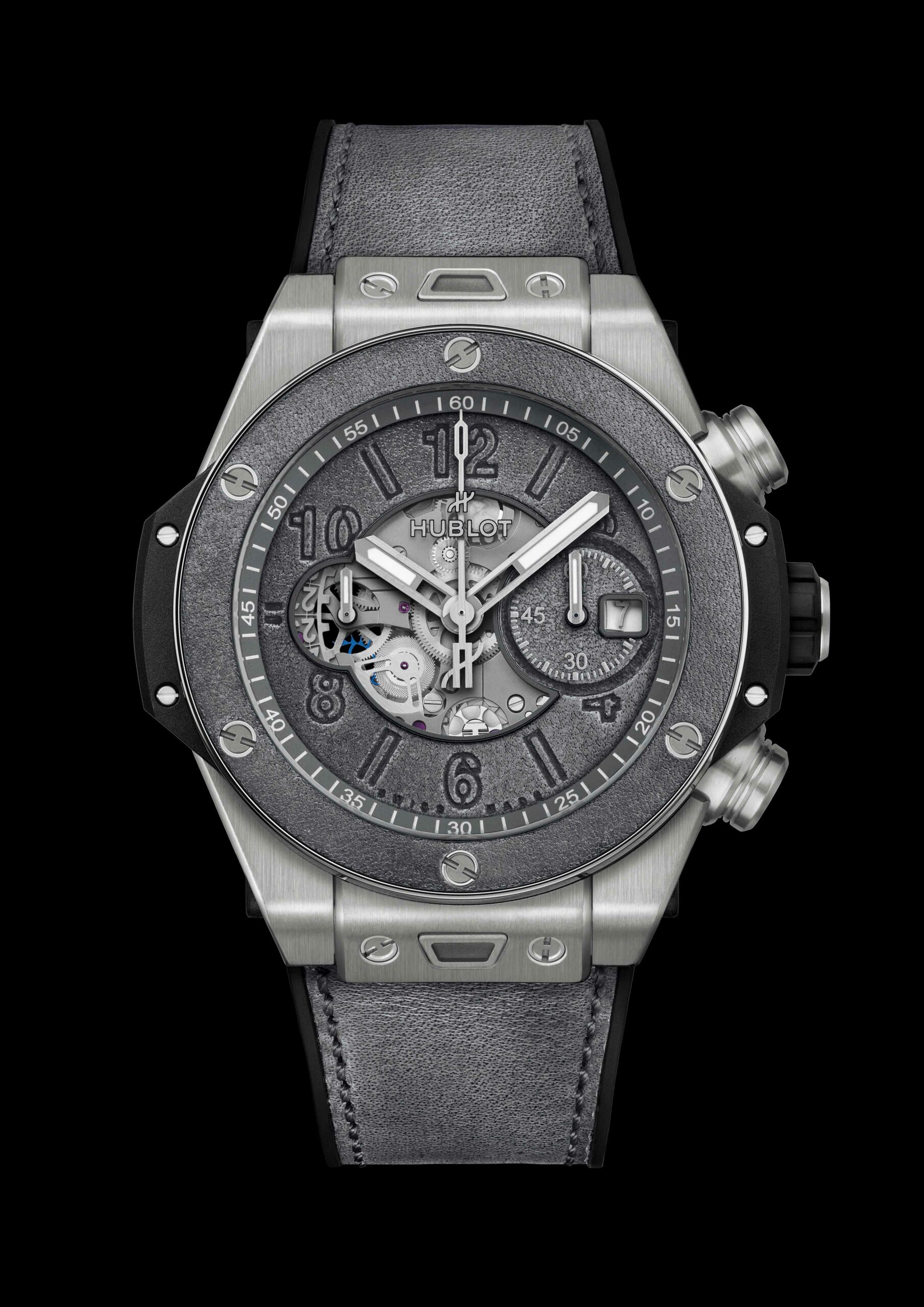 Pour ce modèle, Hublot a repris à son compte sa nouvelle conception de lunette, réalisée en deux parties. À l’aide d’une résine adhésive et rigide, la première pièce de la lunette – en cuir, d’environ 1mm d’épaisseur – est insérée sur la seconde en titane grise, puis vissée sur le boîtier de la montre. La lunette pourra donc continuer à se patiner au fil du temps, tout comme le bracelet.
