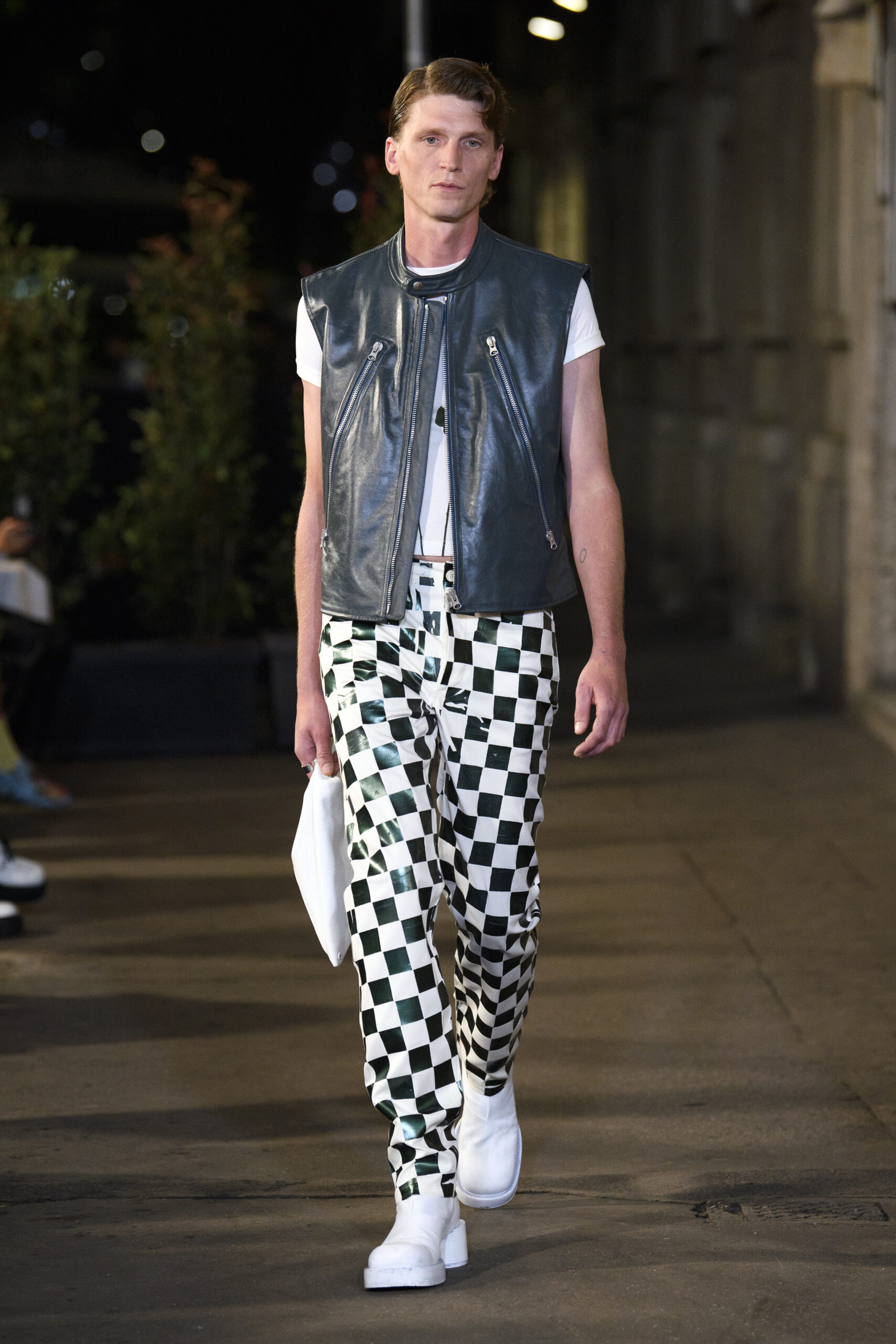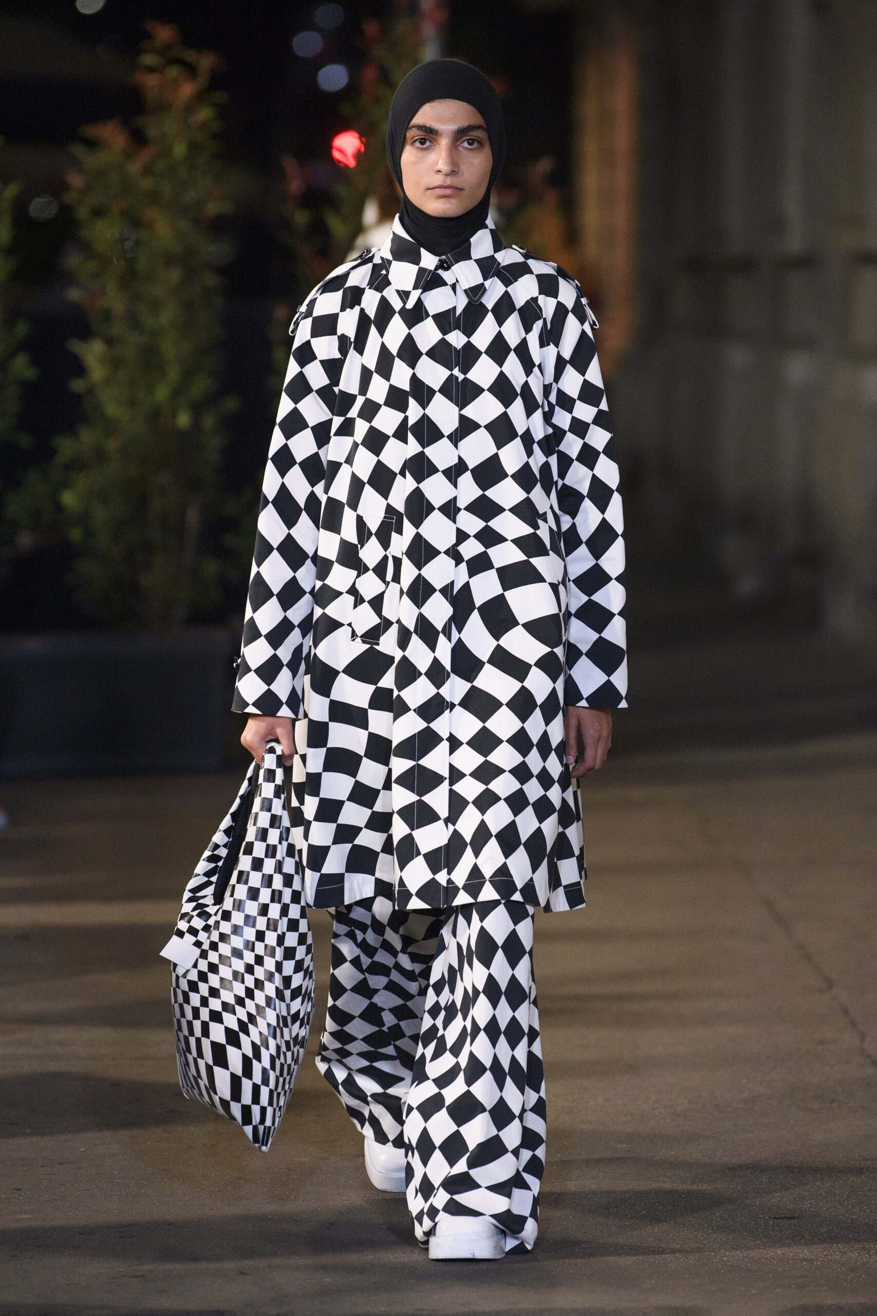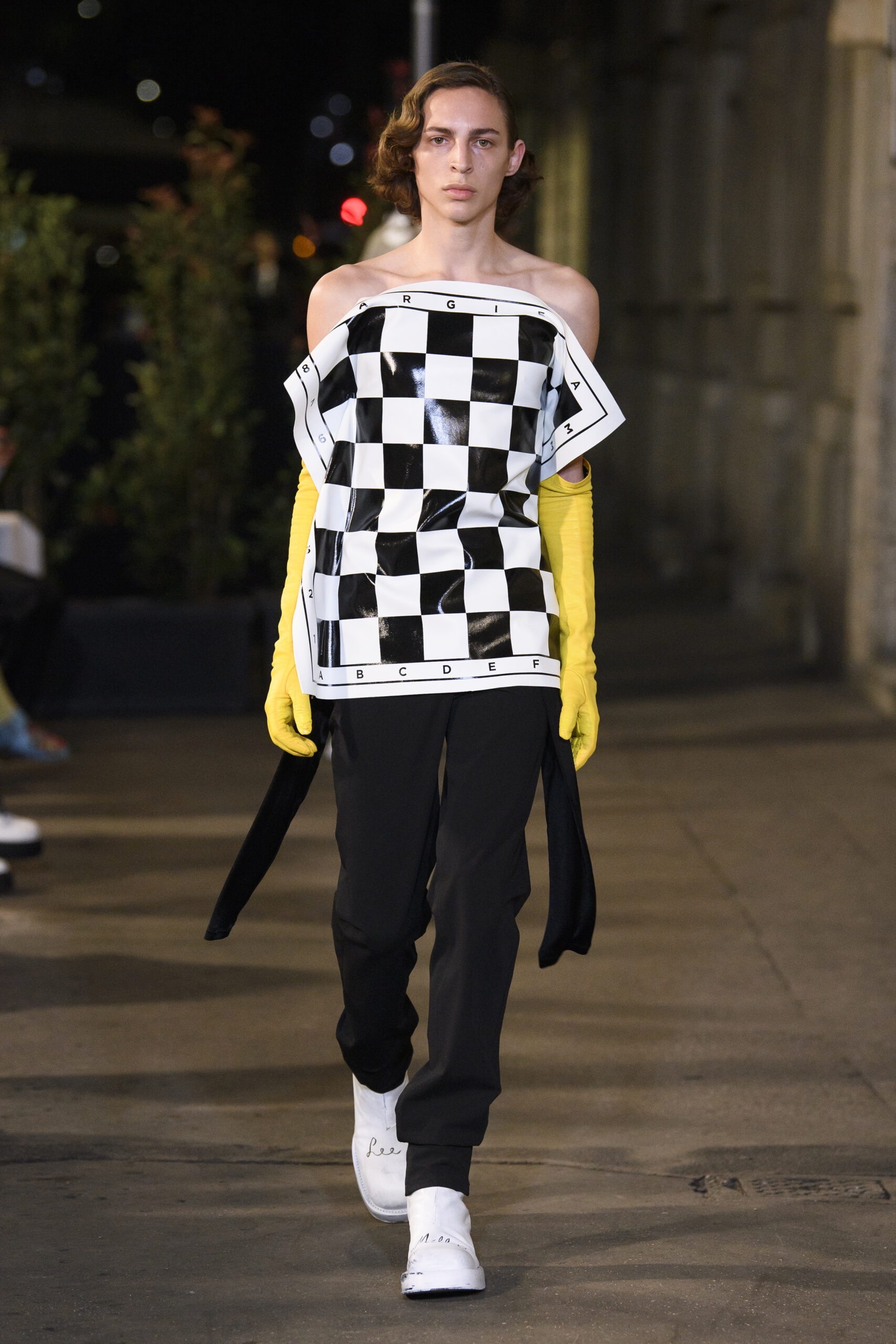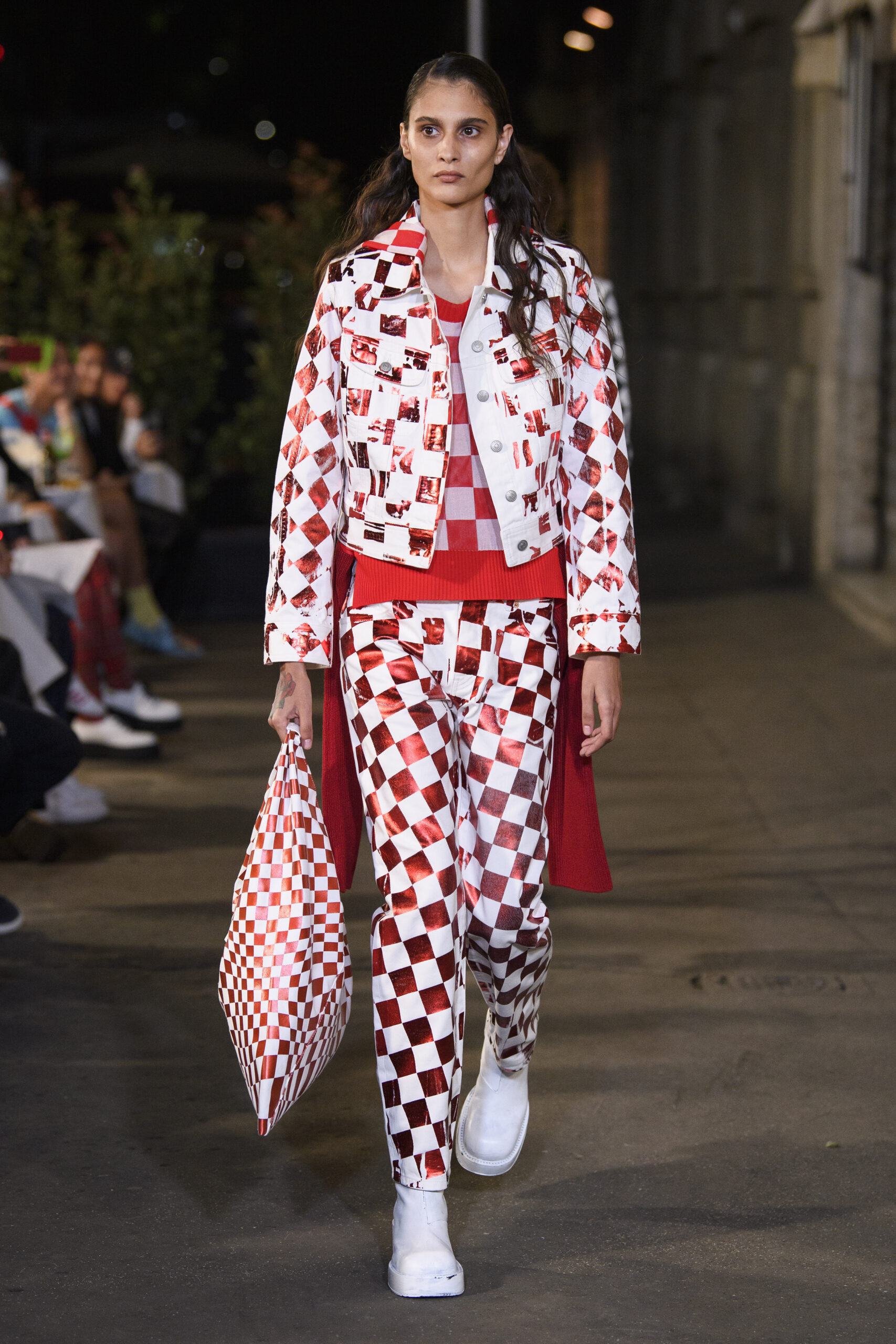 Feelings of giddy joy inform jaunty graphic effects such as red and pine green mylar chessboards printed directly onto denim trousers and wool tailoring. There’s a sense of playful contradiction and subversion. Several leather-effect garments are in fact made of the boiled cotton used for the House’s blouse blanche. It’s a spirit echoed in the rebelliousness of the surrealist women artists that inspired the MM6 Maison Margiela collective this season.