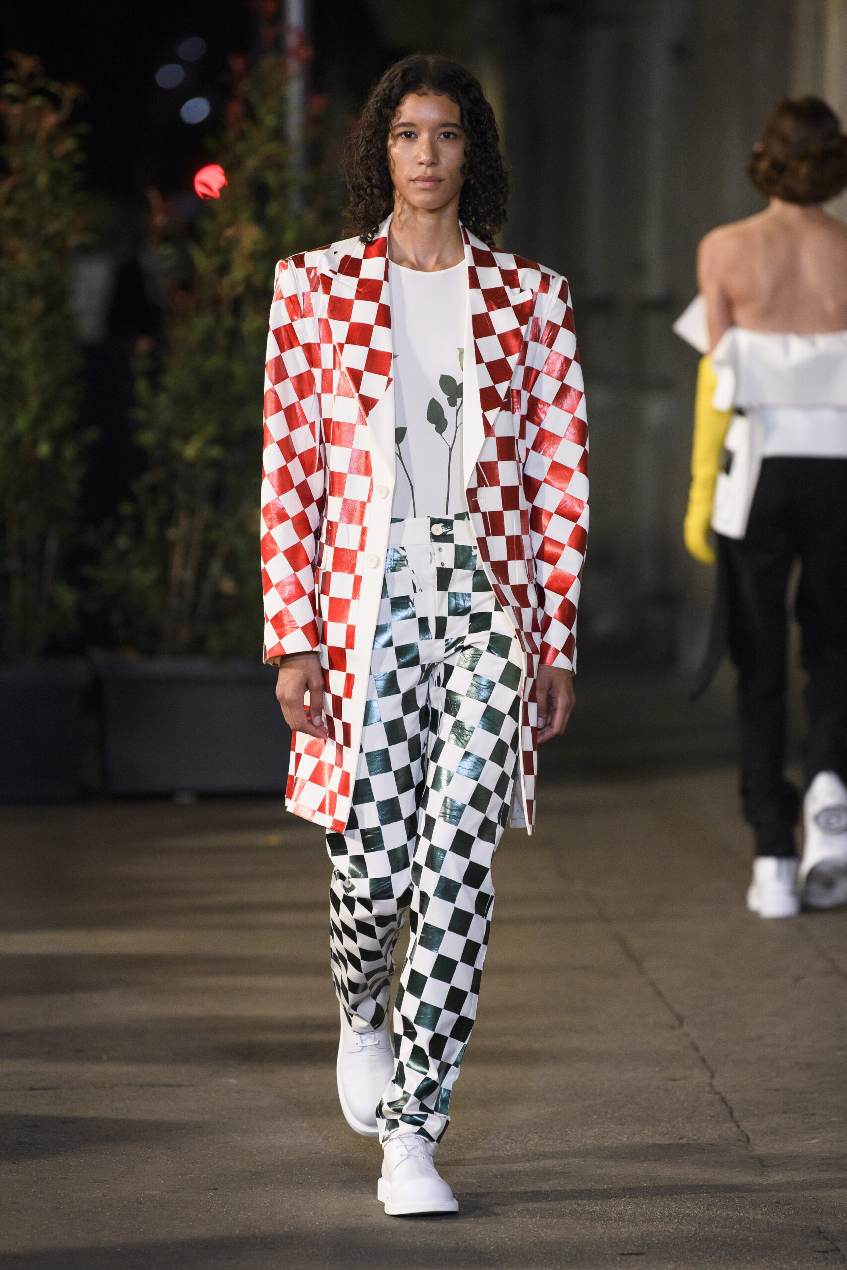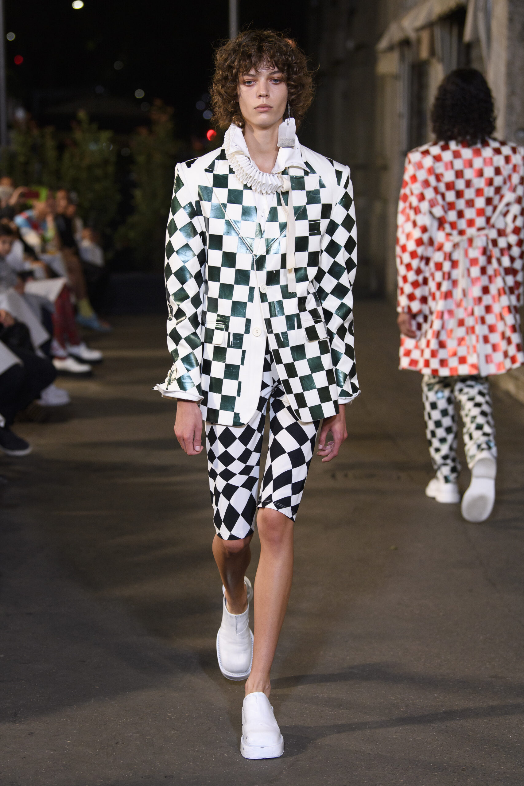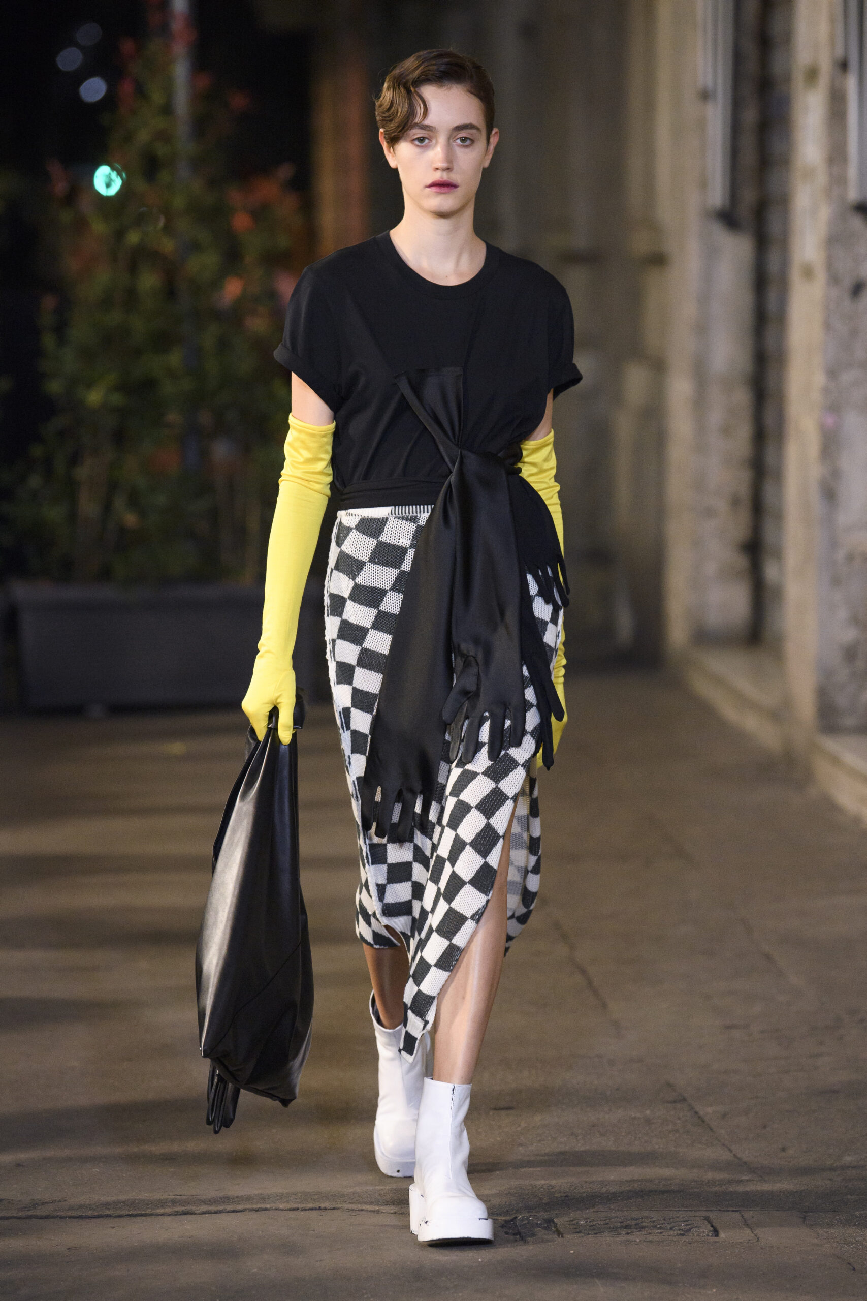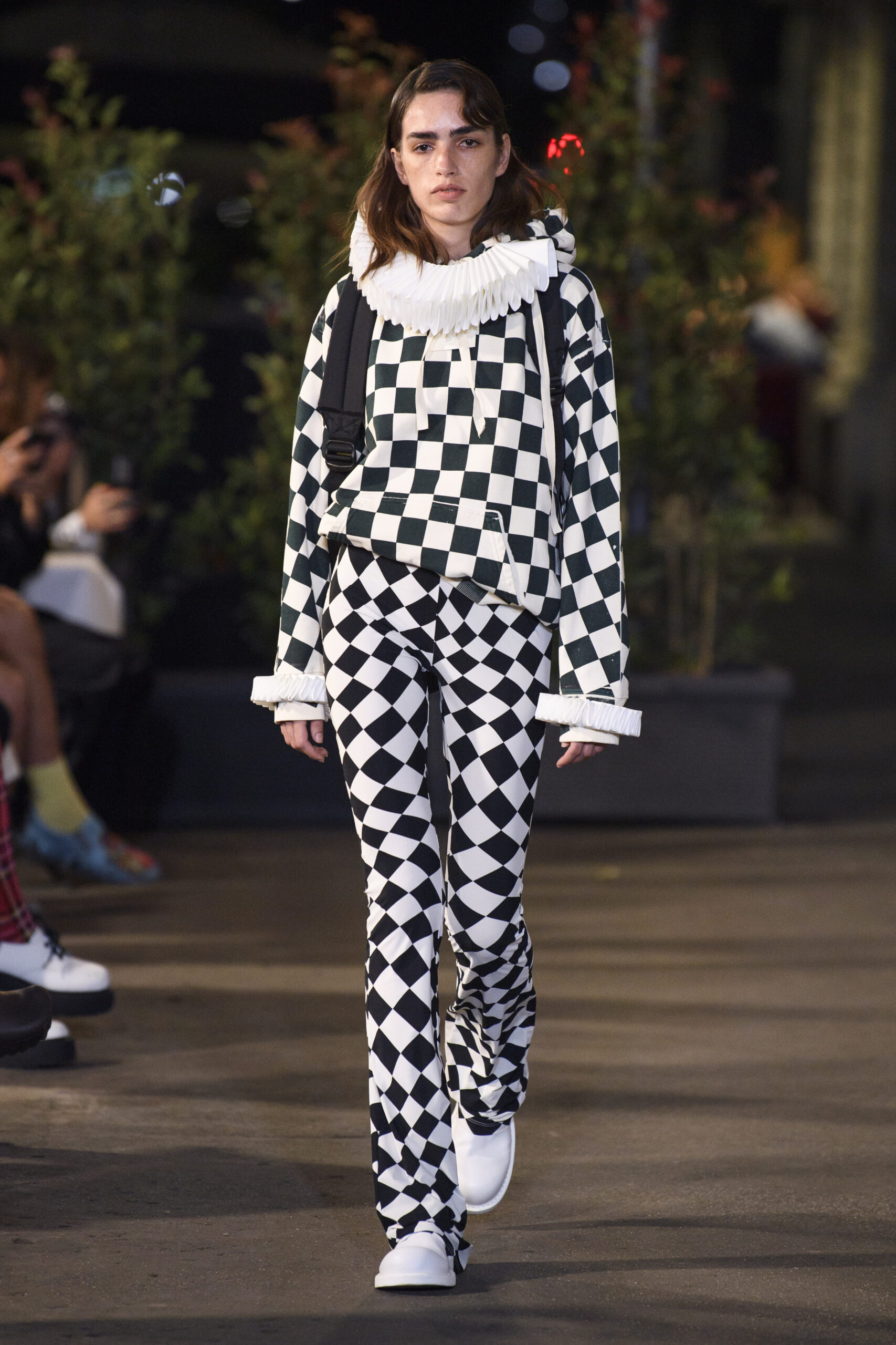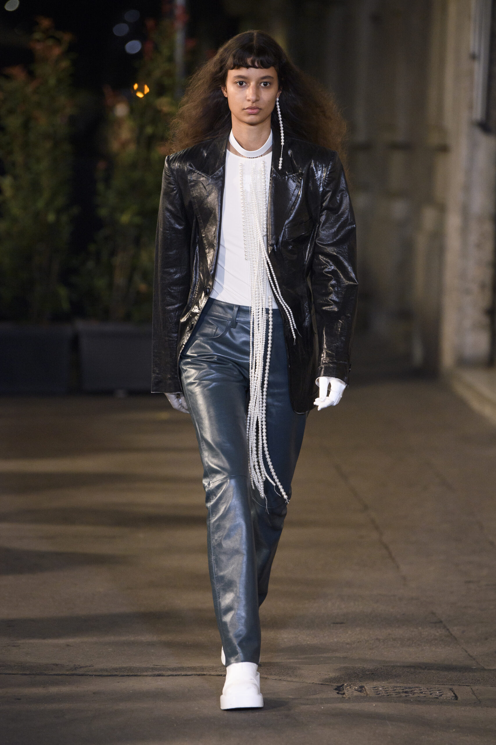 Feelings of giddy joy inform jaunty graphic effects such as red and pine green mylar chessboards printed directly onto denim trousers and wool tailoring. There’s a sense of playful contradiction and subversion. Several leather-effect garments are in fact made of the boiled cotton used for the House’s blouse blanche. It’s a spirit echoed in the rebelliousness of the surrealist women artists that inspired the MM6 Maison Margiela collective this season.
