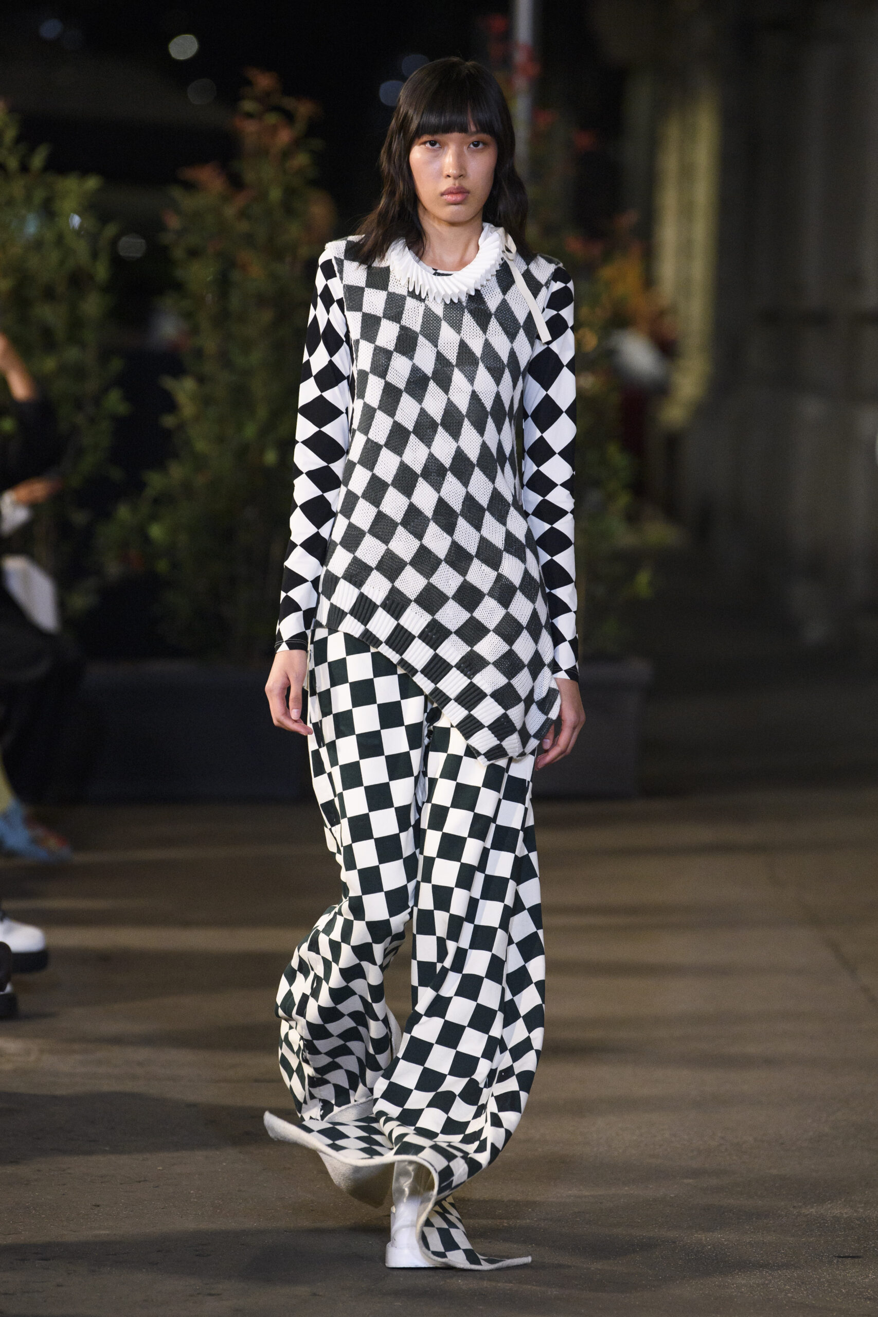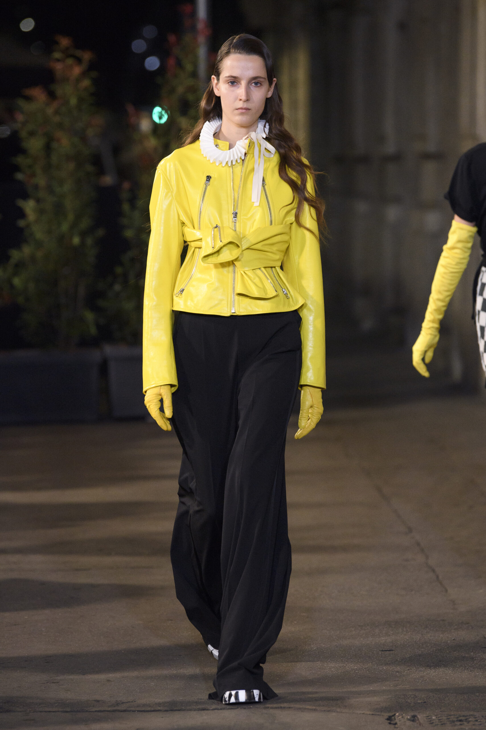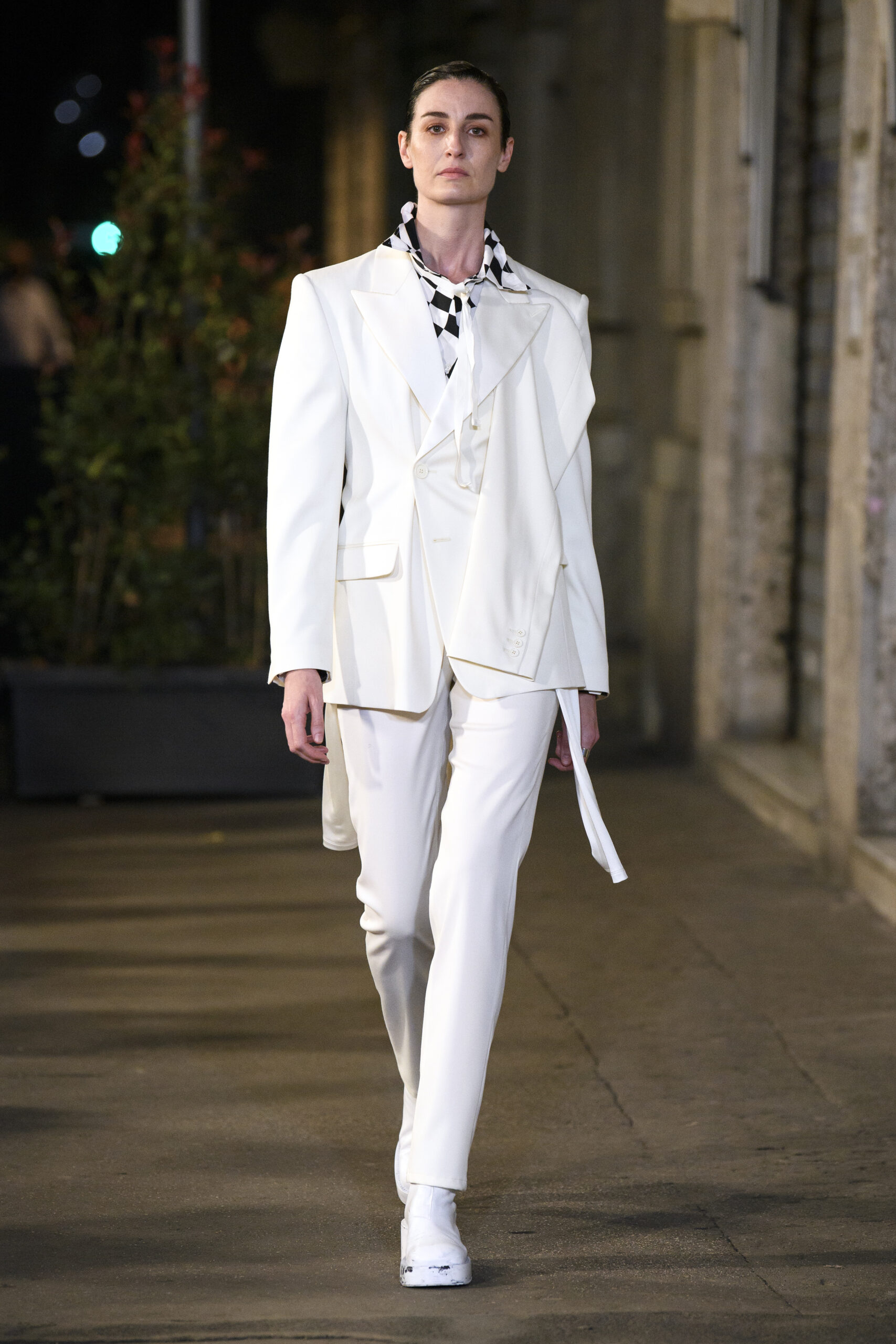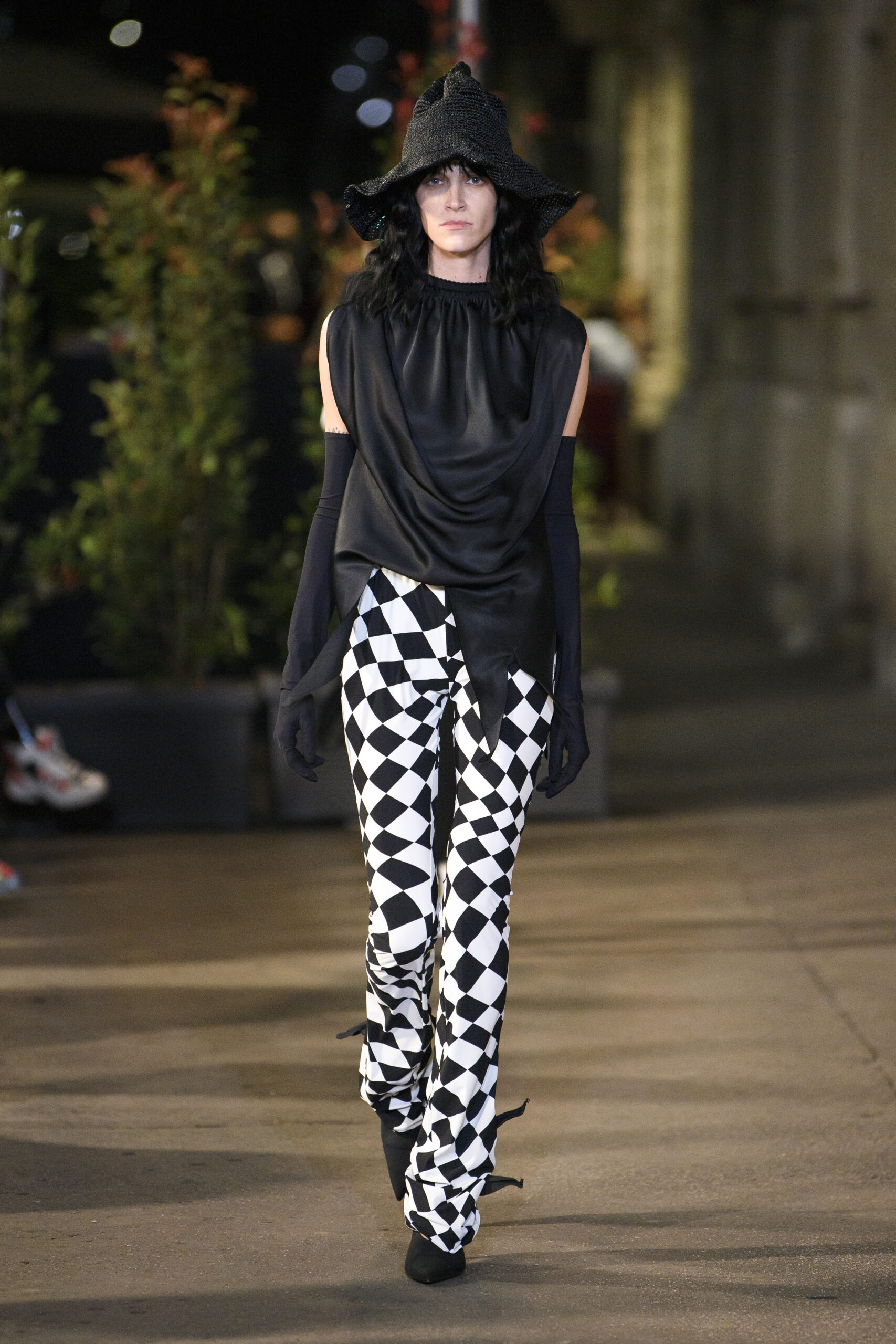 Feelings of giddy joy inform jaunty graphic effects such as red and pine green mylar chessboards printed directly onto denim trousers and wool tailoring. There’s a sense of playful contradiction and subversion. Several leather-effect garments are in fact made of the boiled cotton used for the House’s blouse blanche. It’s a spirit echoed in the rebelliousness of the surrealist women artists that inspired the MM6 Maison Margiela collective this season.