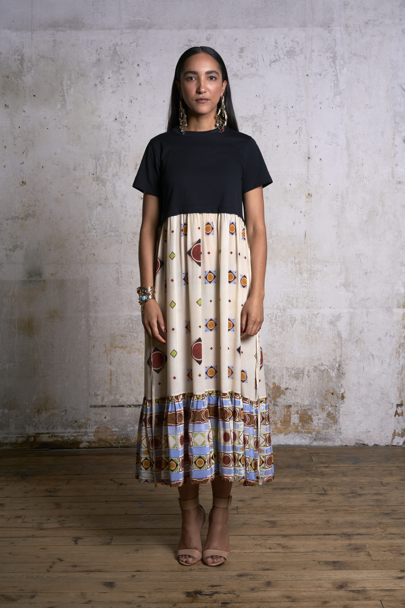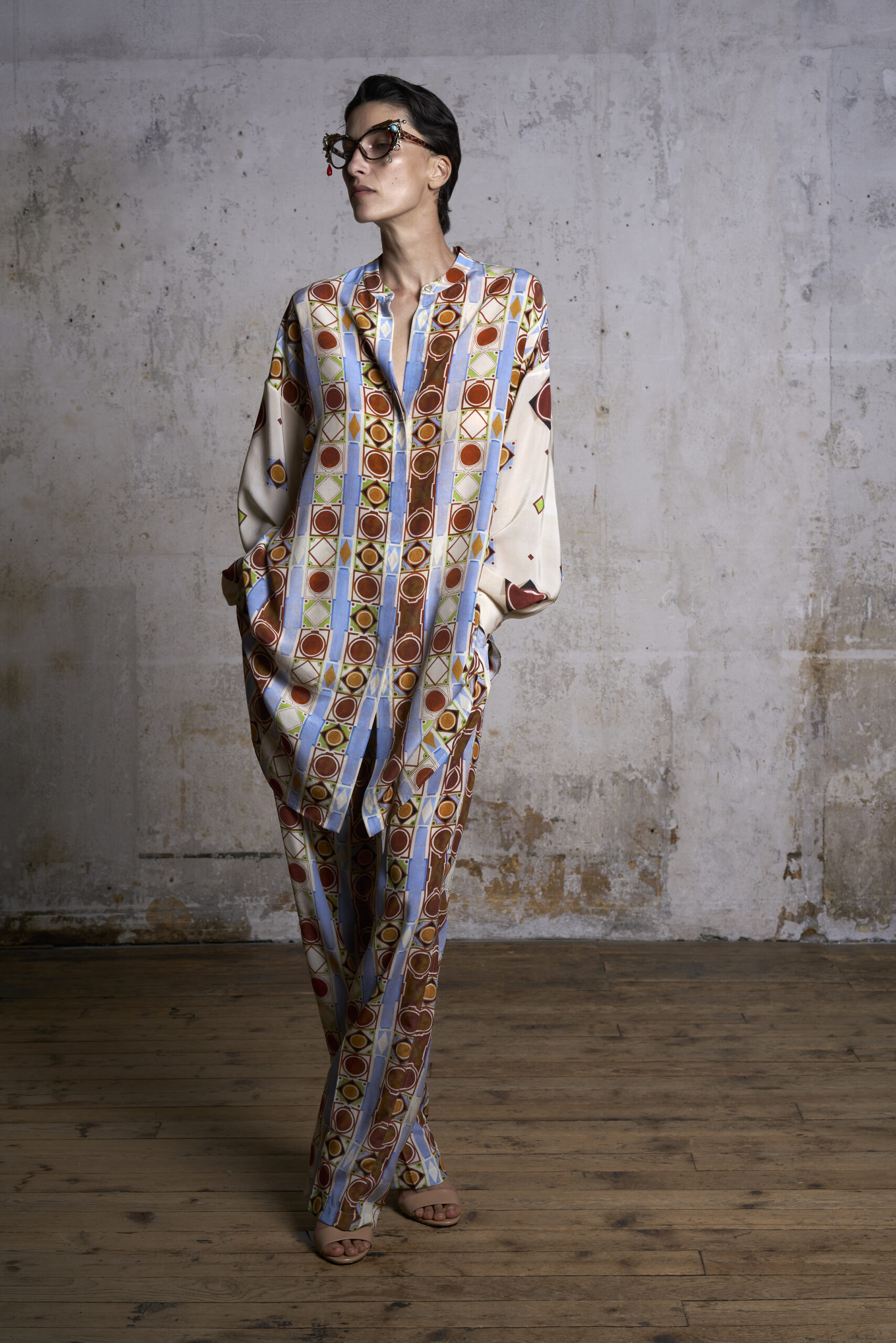 L’exercice de style autour des imprimés de cette saison est né d’une visite à la Villa Farnèse de Caprarola. Les motifs géométriques du sol et des murs du palais contrastent avec des motifs animaliers tourbillonnants, tous imprimés sur des textiles qui conservent volontairement leur facture picturale. Les couleurs font écho aux teintes gouachées des fresques, avec des touches de jaune vif, de rose et de vert acide.