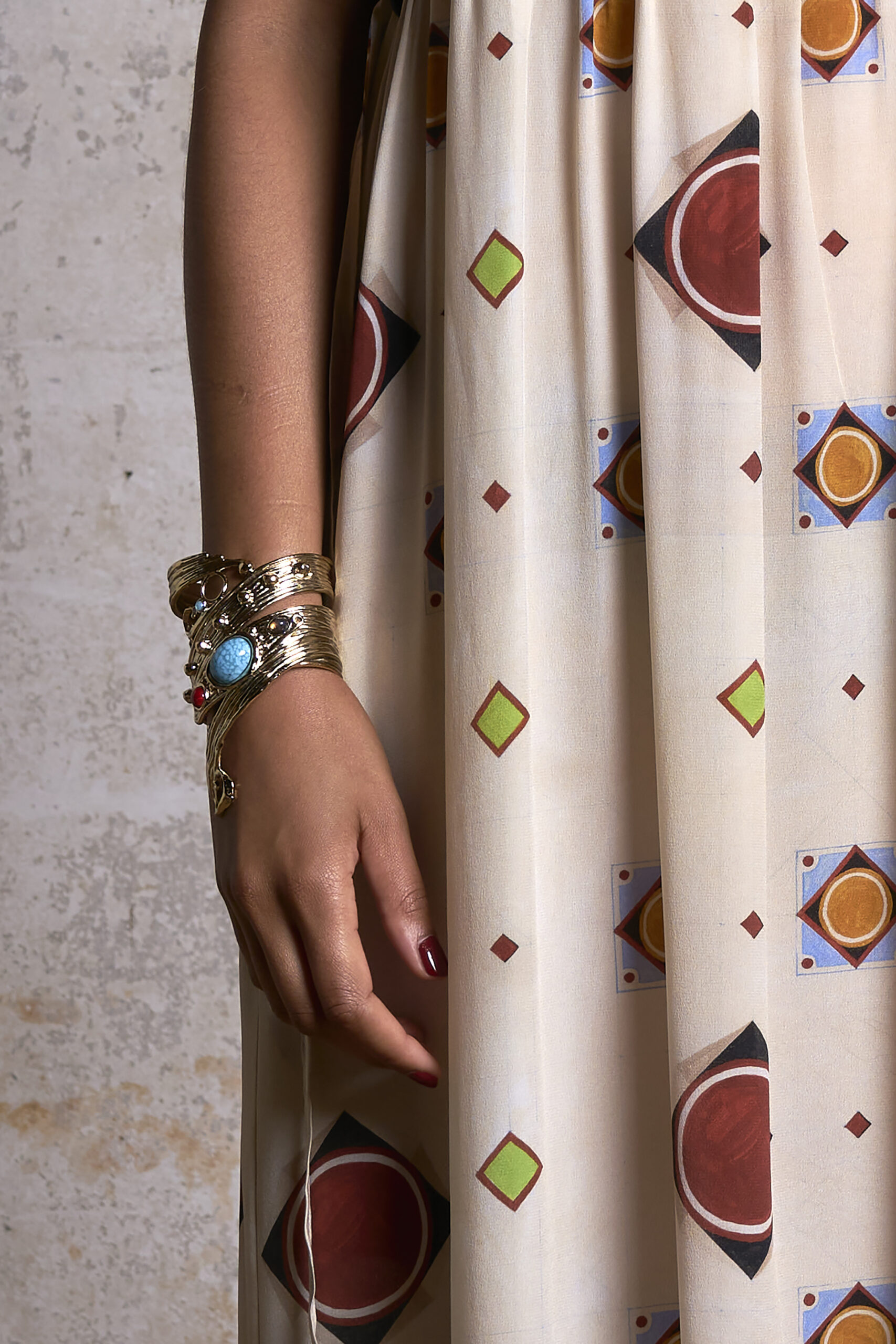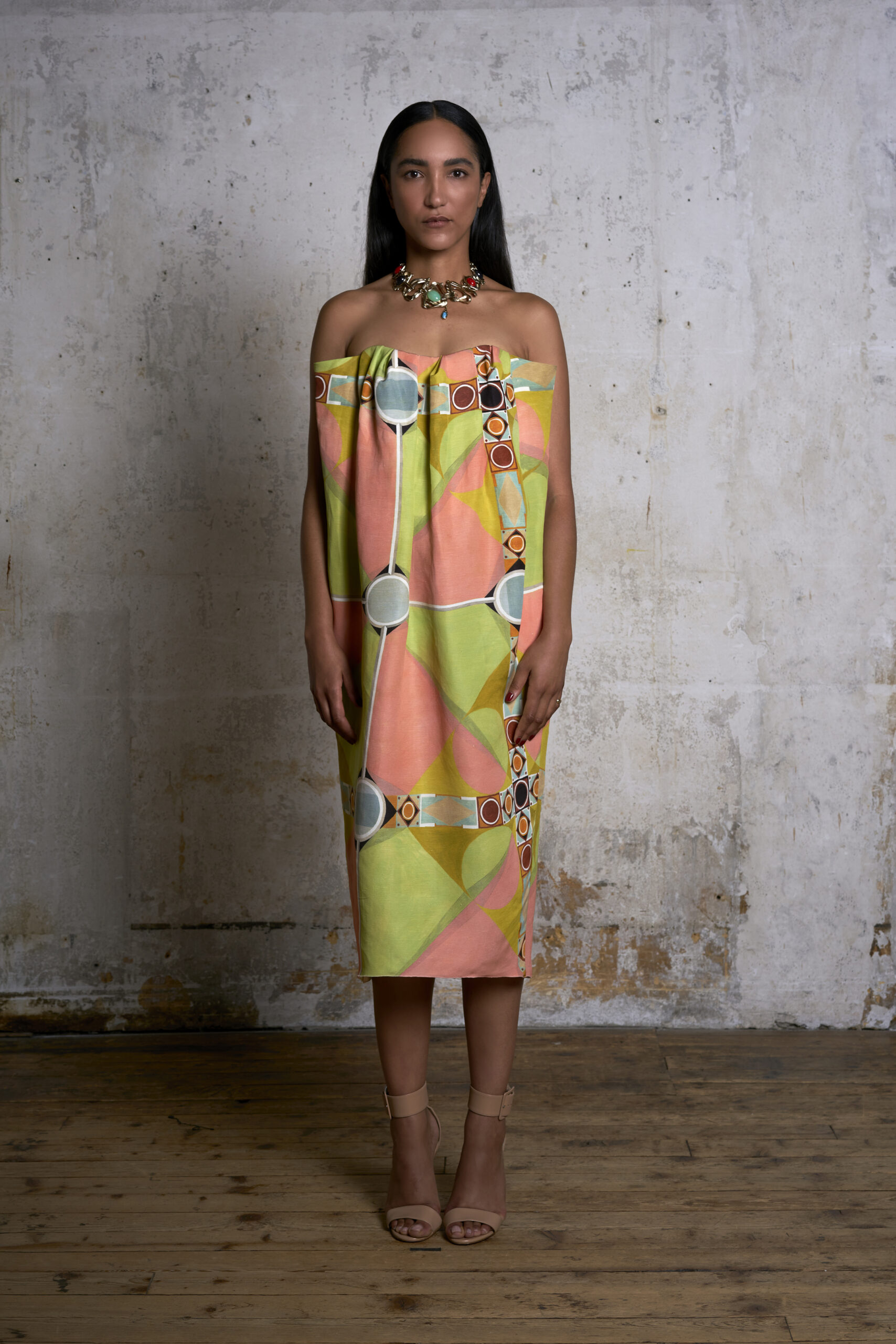 Les tissus haut de gamme allant du crêpe de Chine au lin shantung sont mis en valeur par une gamme de bijoux en édition limitée réalisés en collaboration avec la maison Goossens. Pour leur deuxième collaboration, les formes ont été poussées plus loin cette saison avec du laiton martelé à la main, du verre et des perles dans une sélection de boucles d’oreilles, de bracelets, de colliers et même de lunettes de vue aux formes organiques.