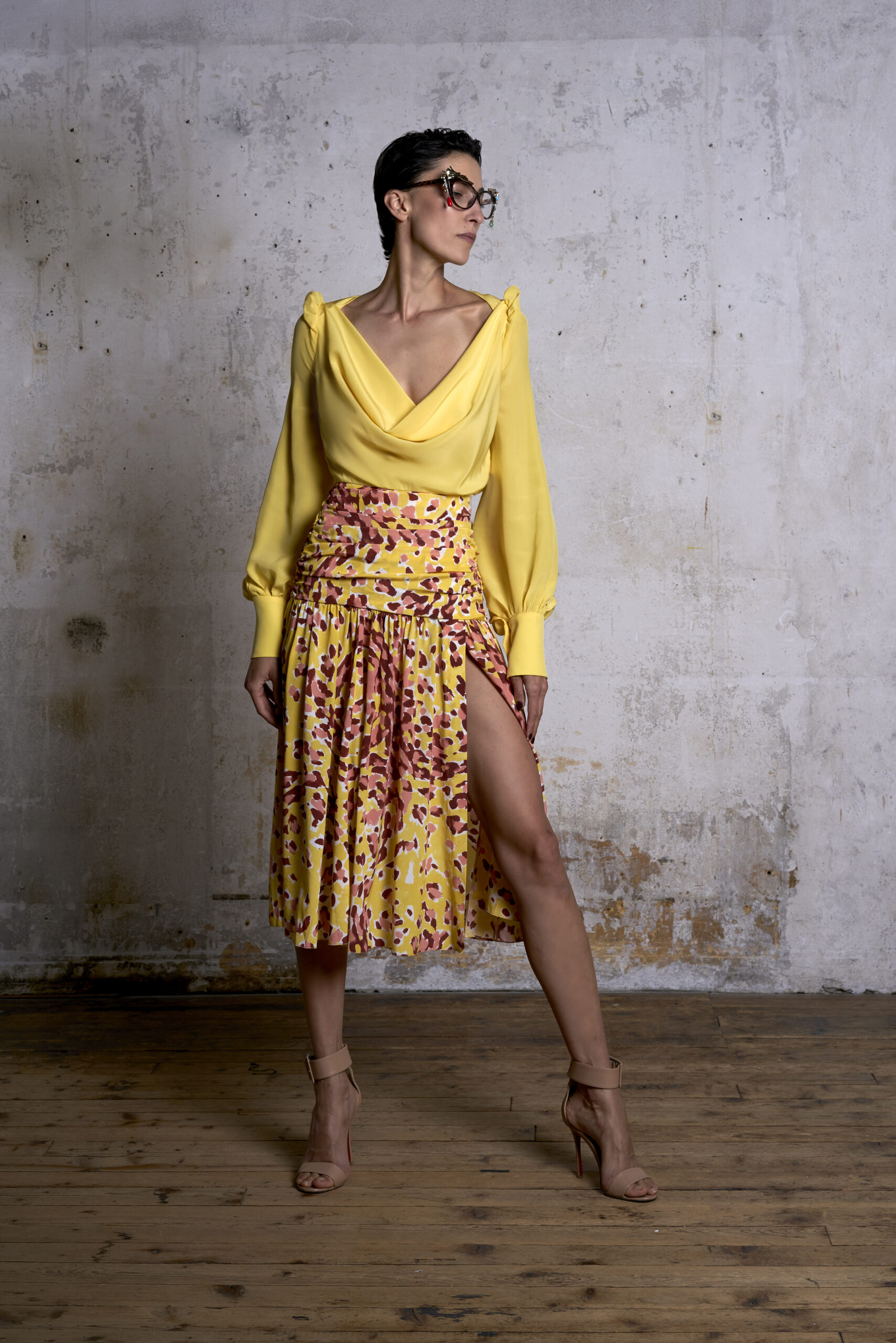 Tout en poursuivant le travail sur le décolleté de ses robes ajustées et de ses chemisiers portefeuille signature, Alexandre explore de nouveaux volumes révélateurs : une robe bustier drapée, une tunique à la coupe épurée et un pyjama fluide en soie imprimée.