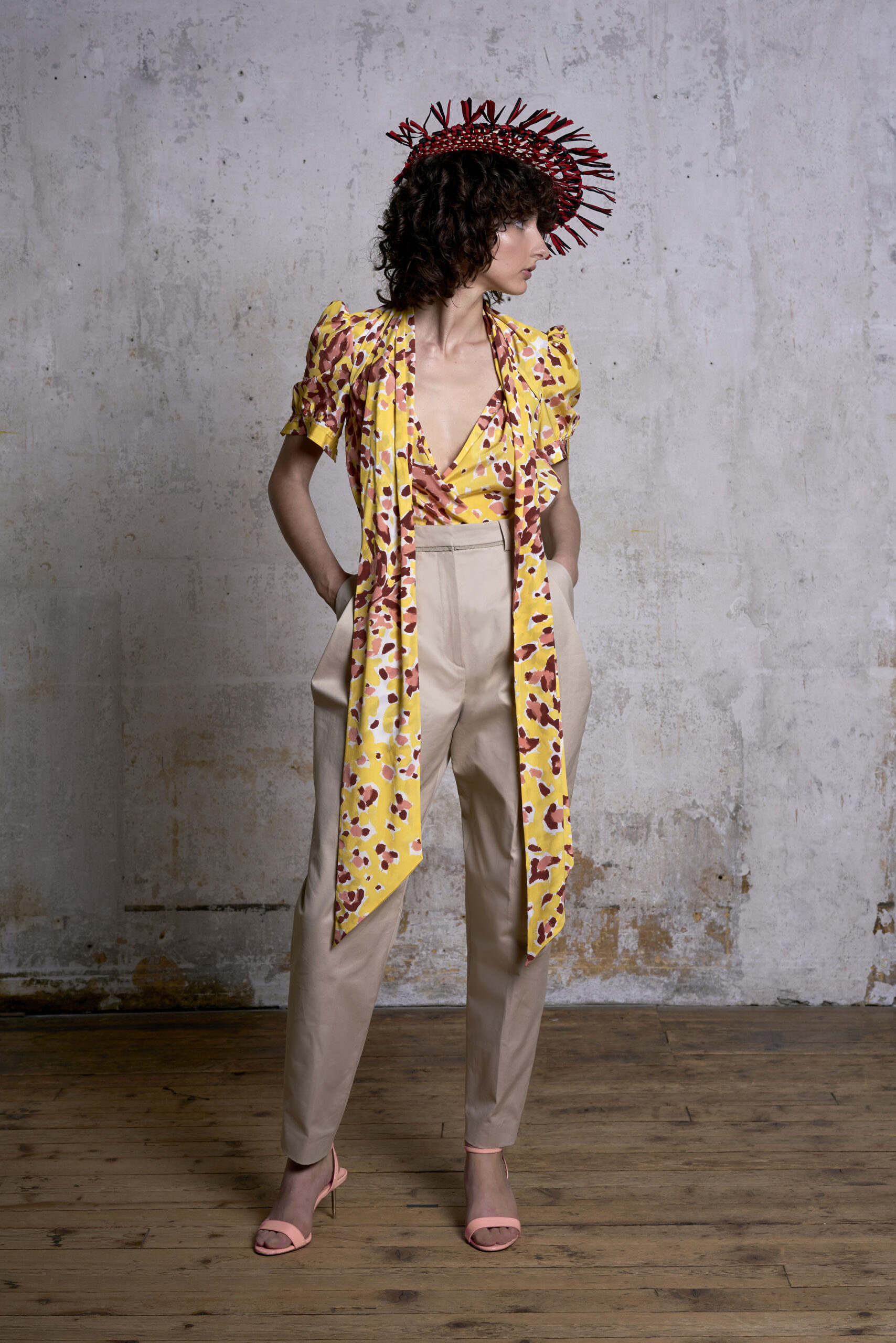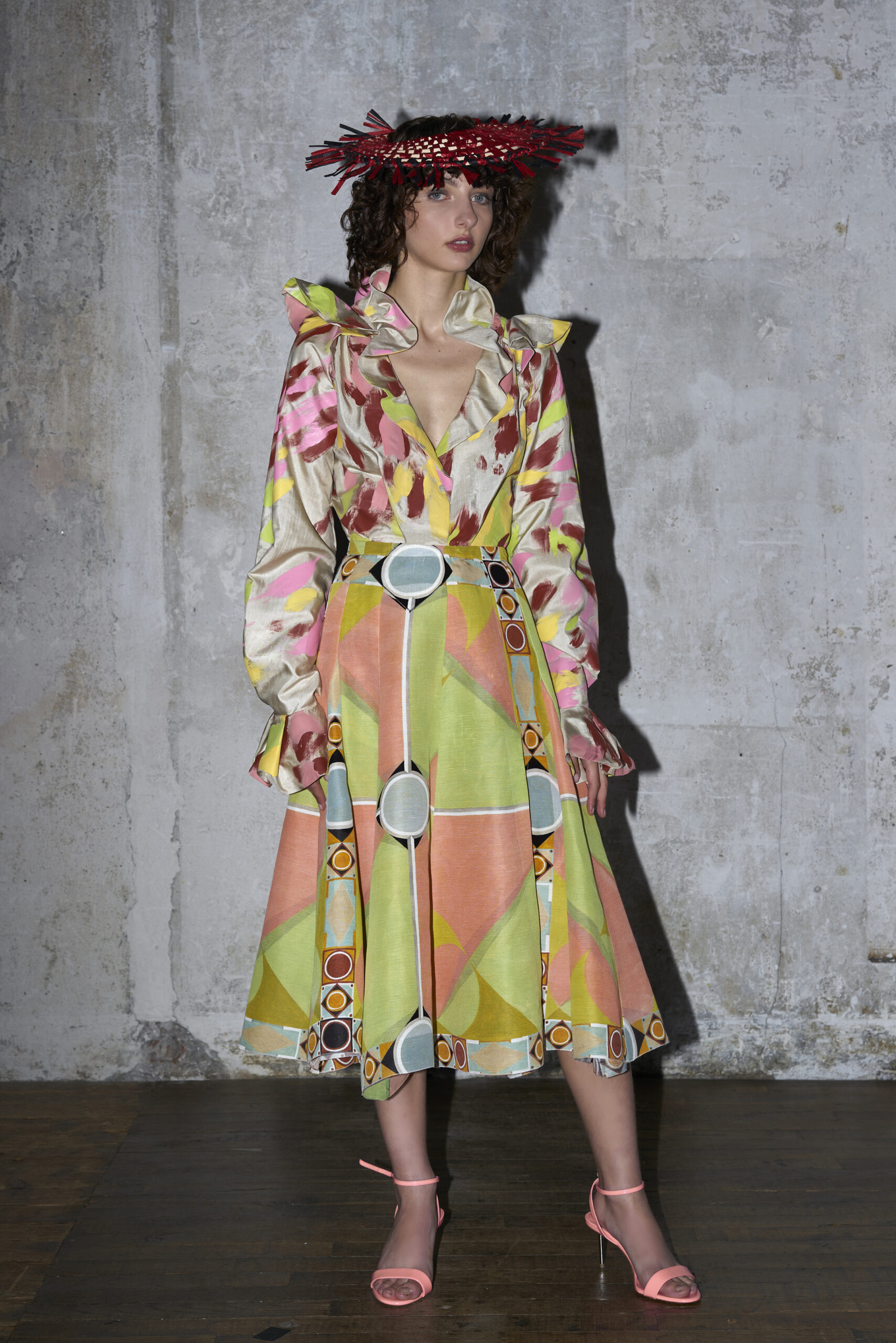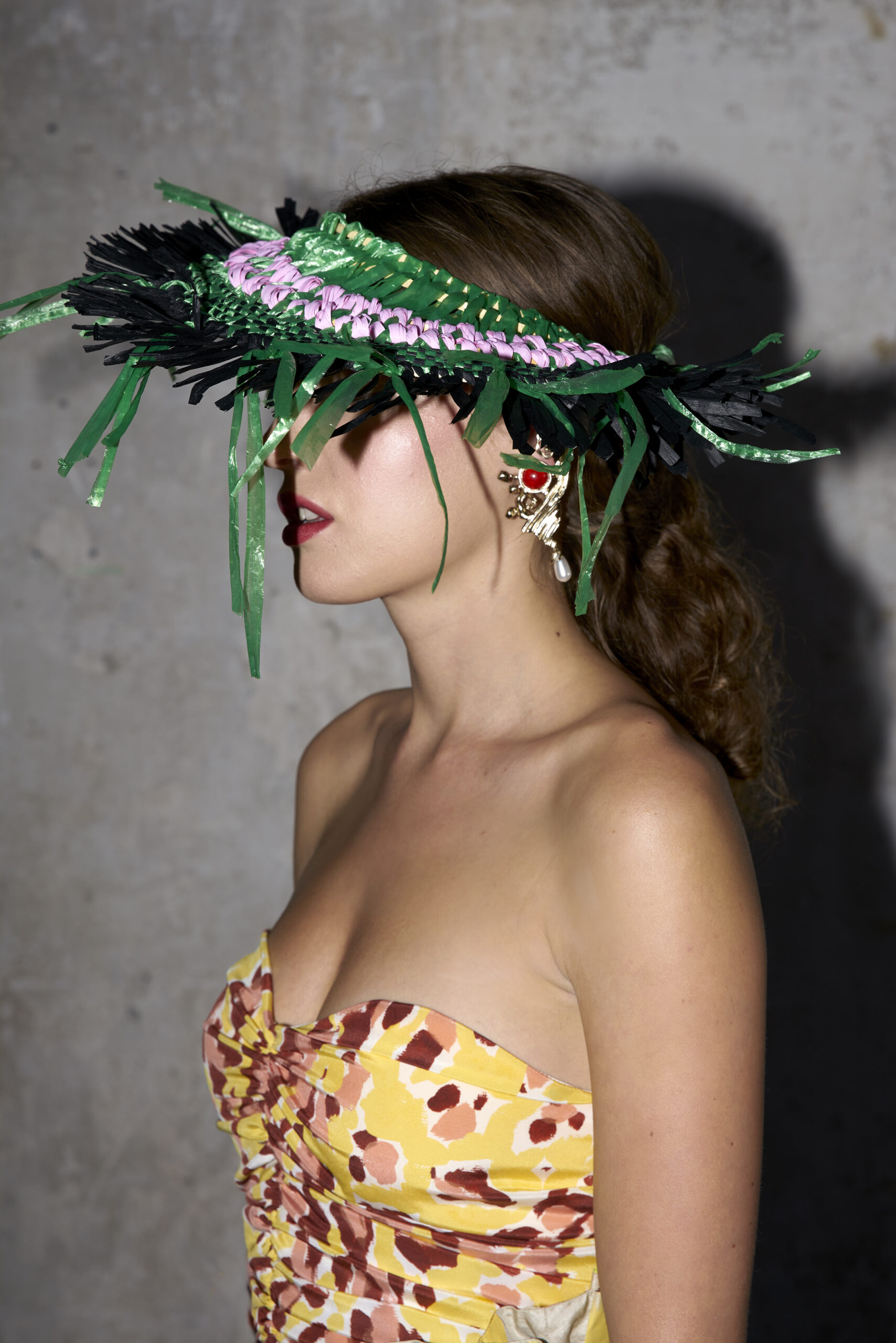 Pour présenter sa collection, Alexandre et son styliste ont perché des chapeaux en raphia faits main sur la tête des mannequins. Ou peut-être que ce sont des masques ? Pour Alexandre, ils sont un dernier clin d’œil à la culture italienne, aux grands bals dans les scènes de films classiques avec des invités fantastiquement bien habillés. « Je fais des vêtements avec des motifs personnels, joyeux et faits pour sortir et s’amuser ». C’est la fantaisie presque surnaturelle de Federico Fellini, mais avec un véritable goût pour la vie moderne.