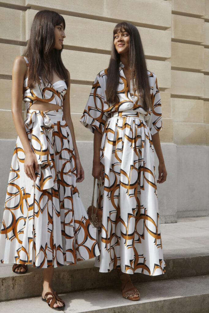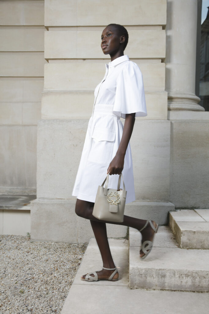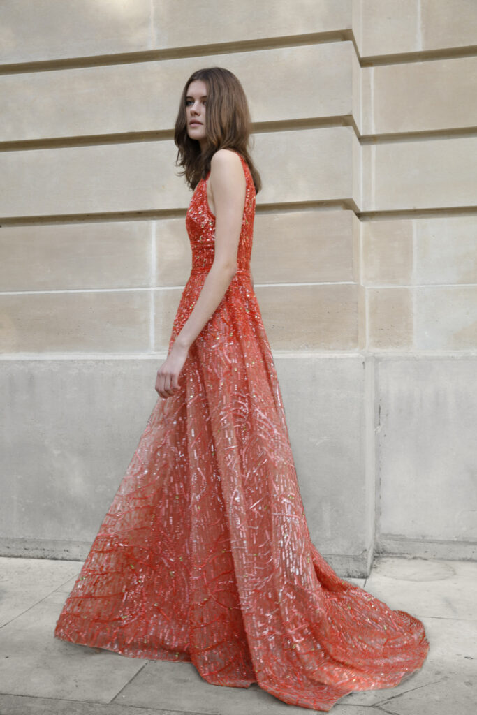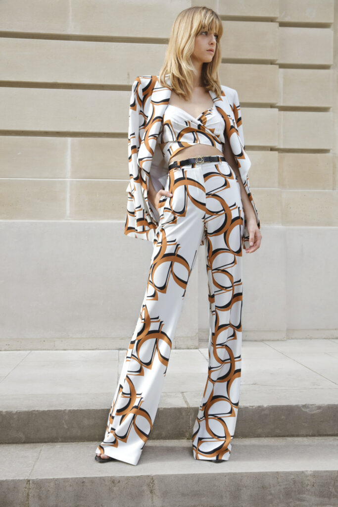 La collection est faite pour répondre aux lubies fantasques, passant sans effort du jour à la nuit par un simple changement subtil d’attitude et un ou deux accessoires. Une élégante jupe imprimée plissée de jour se marie facilement avec un haut court structuré. Pour une occasion plus semi-formelle, une combinaison noire à franges en cady, des accents et des chaussures en métal doré et un sac assorti, ou une jupe beige en gabardine château avec une fente à la cuisse, portée avec un t-shirt en jersey brodé du logo ELIE SAAB. Les shorts fleuris, les dos nus et les hauts cache-coeur ajoutent une touche décontractée-chic, tout comme les robes Sahara taupe d’inspiration safari. Les textures finement tissées flirtent avec audace avec des formes translucides sur les robes perlées aux touches effervescentes de couleur vive.