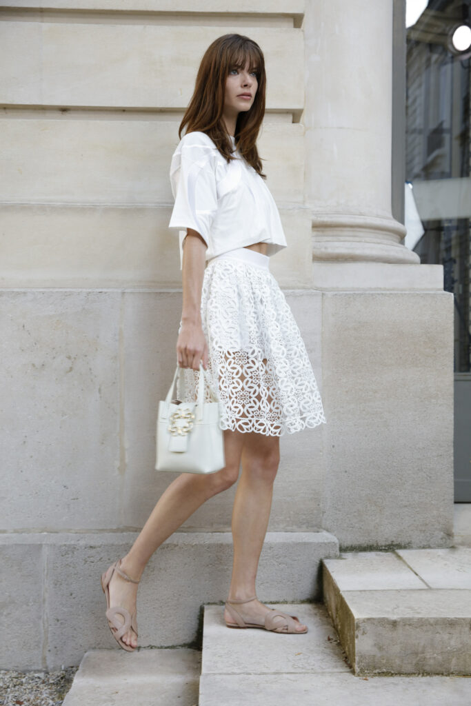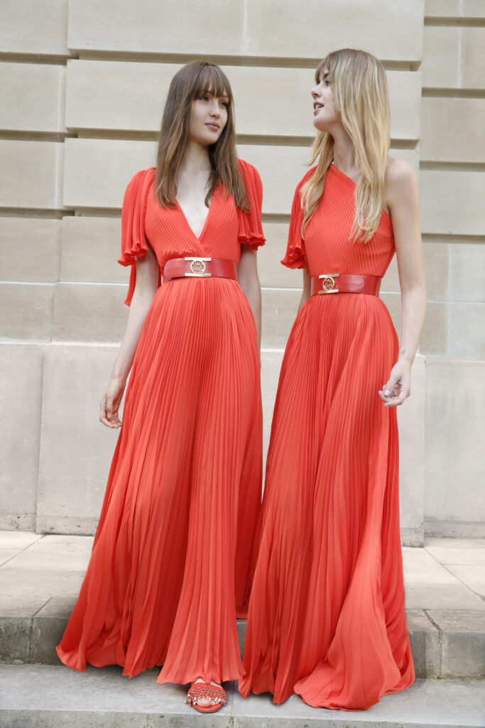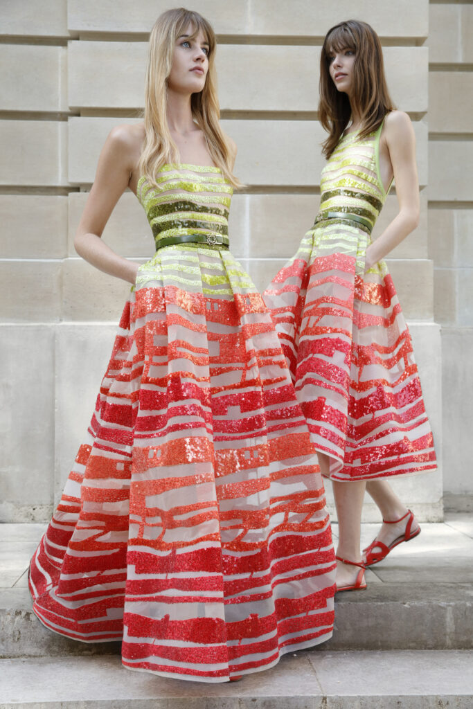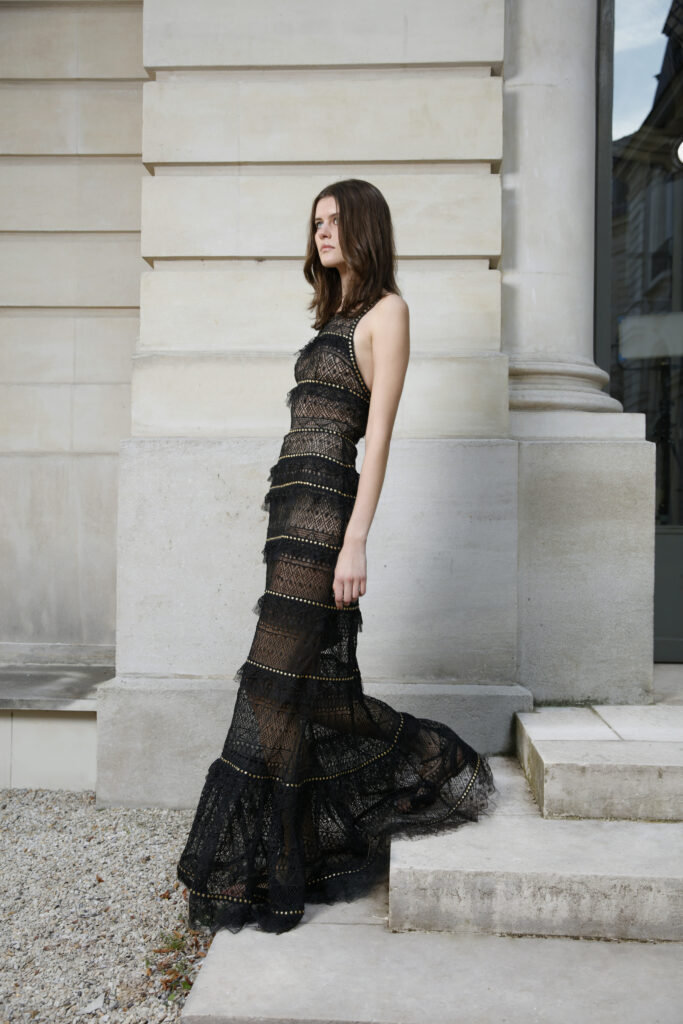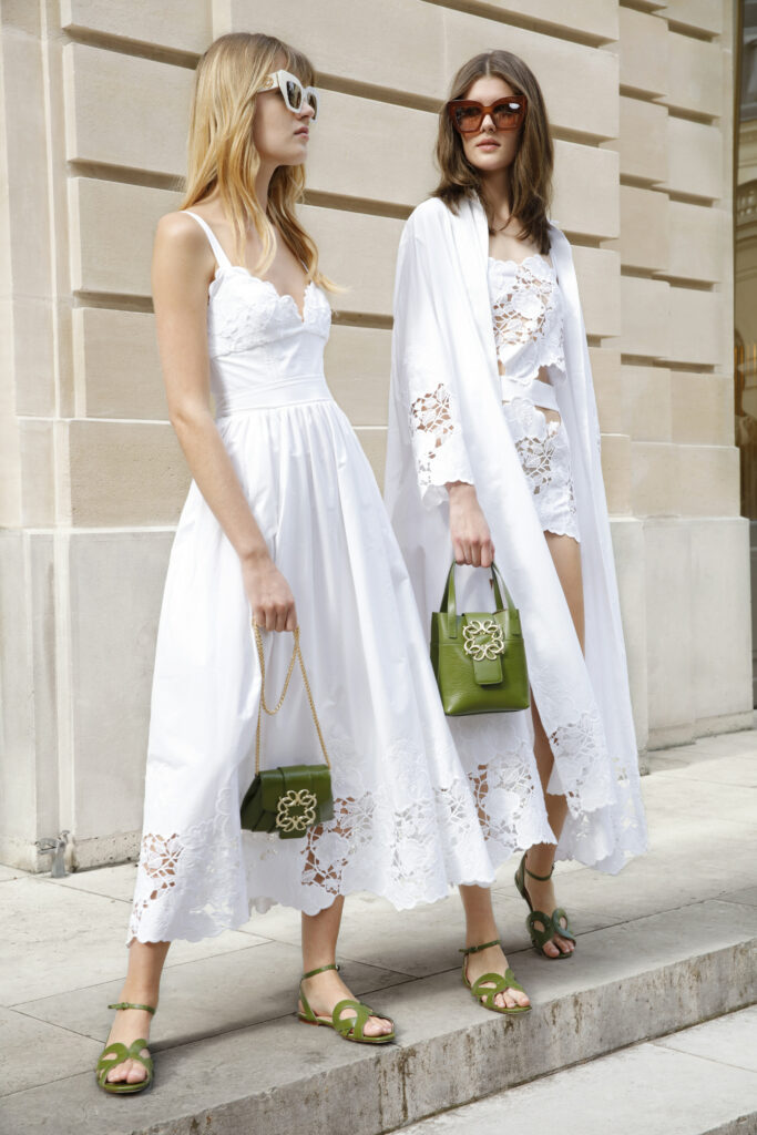 La collection est faite pour répondre aux lubies fantasques, passant sans effort du jour à la nuit par un simple changement subtil d’attitude et un ou deux accessoires. Une élégante jupe imprimée plissée de jour se marie facilement avec un haut court structuré. Pour une occasion plus semi-formelle, une combinaison noire à franges en cady, des accents et des chaussures en métal doré et un sac assorti, ou une jupe beige en gabardine château avec une fente à la cuisse, portée avec un t-shirt en jersey brodé du logo ELIE SAAB. Les shorts fleuris, les dos nus et les hauts cache-coeur ajoutent une touche décontractée-chic, tout comme les robes Sahara taupe d’inspiration safari. Les textures finement tissées flirtent avec audace avec des formes translucides sur les robes perlées aux touches effervescentes de couleur vive.