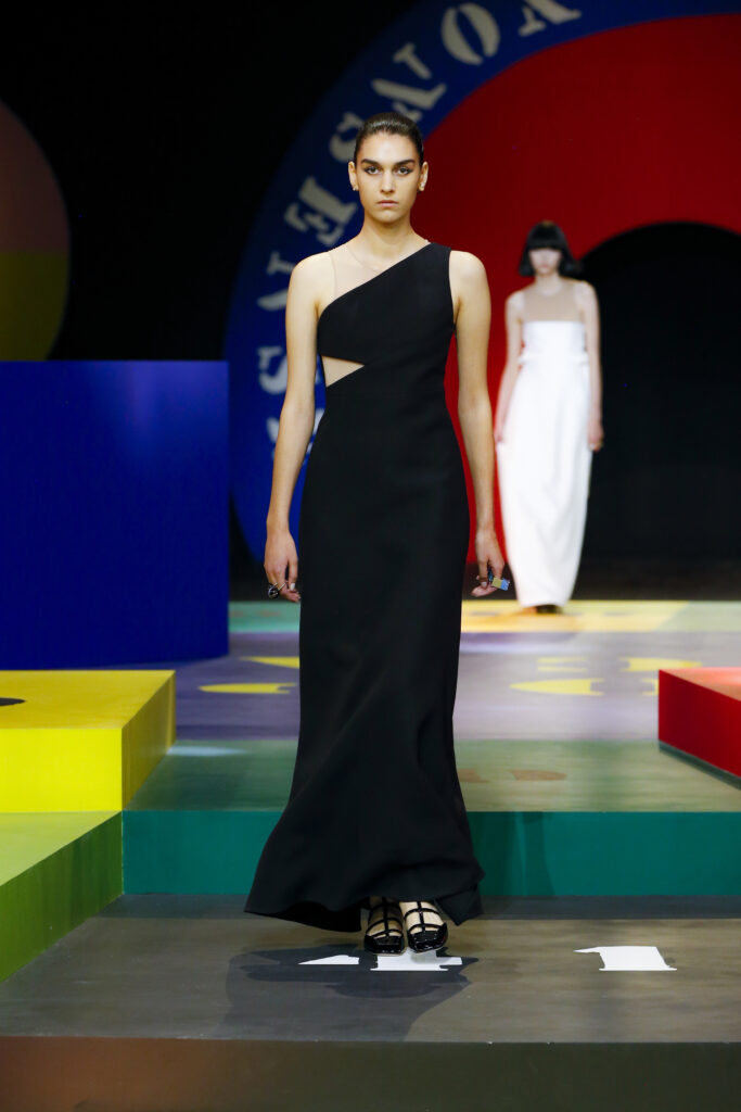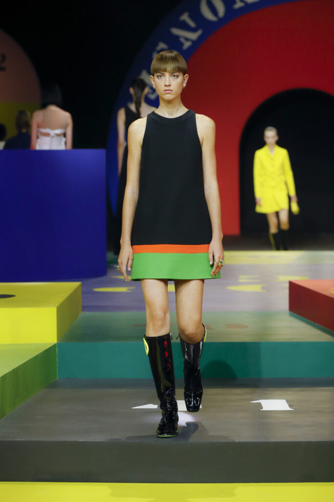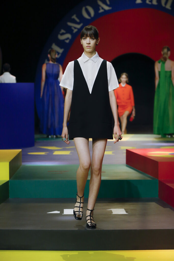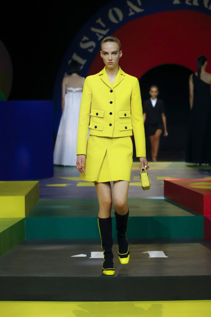 L’imaginaire de ce défilé Dior prêt-à-porter printemps-été 2022 se nourrit de curiosité, de désirs et de recherches. Maria Grazia Chiuri explore la richesse des années 1960, et plus précisément la période où Marc Bohan était le Directeur Artistique de la Maison. Elle met en lumière l’esprit visionnaire de la collection Slim Look, réalisée en 1961, à propos de laquelle la presse écrivait : « Elle change complètement la mode, tout comme le New Look l’a fait en 19471. » Les silhouettes révèlent ainsi des coupes et des effets graphiques, tels des color blocks. Les couleurs évoquent également les géométries spatiales et les jeux pensés par Anna Paparatti. Cette artiste a conçu la scénographie du show comme un « jeu de l’absurde » reflétant la philosophie de ses travaux. Les matières et les différents motifs rappellent le Piper Club, la légendaire boîte de nuit romaine, lieu de liberté unique au croisement des arts, du design et de la mode.