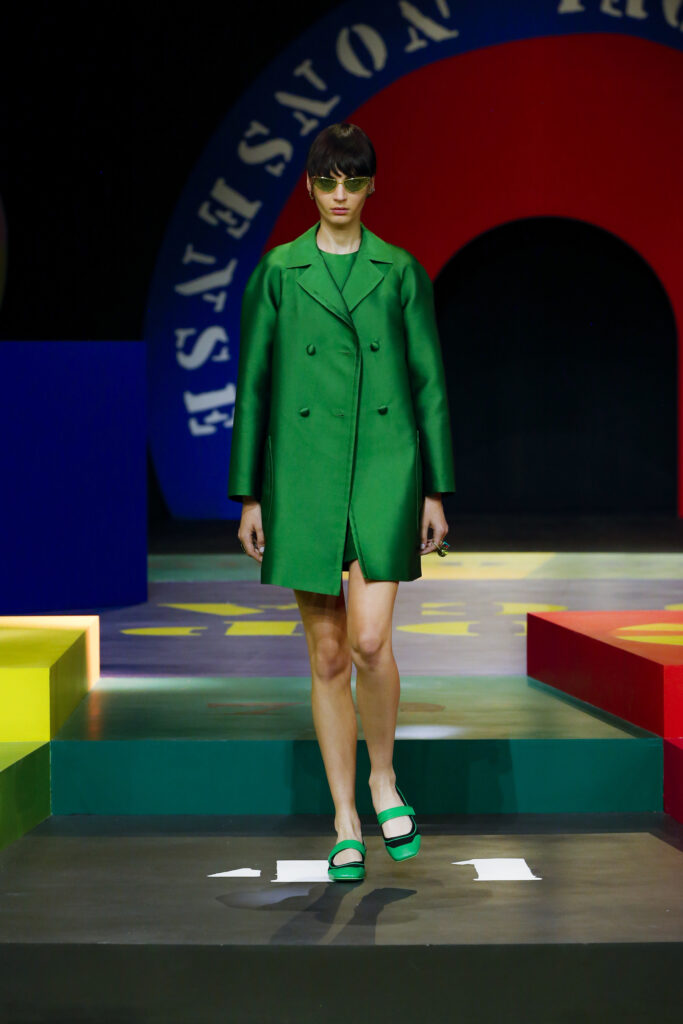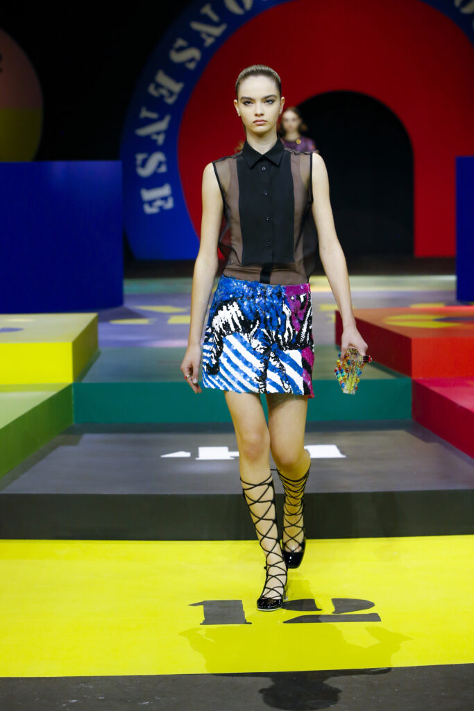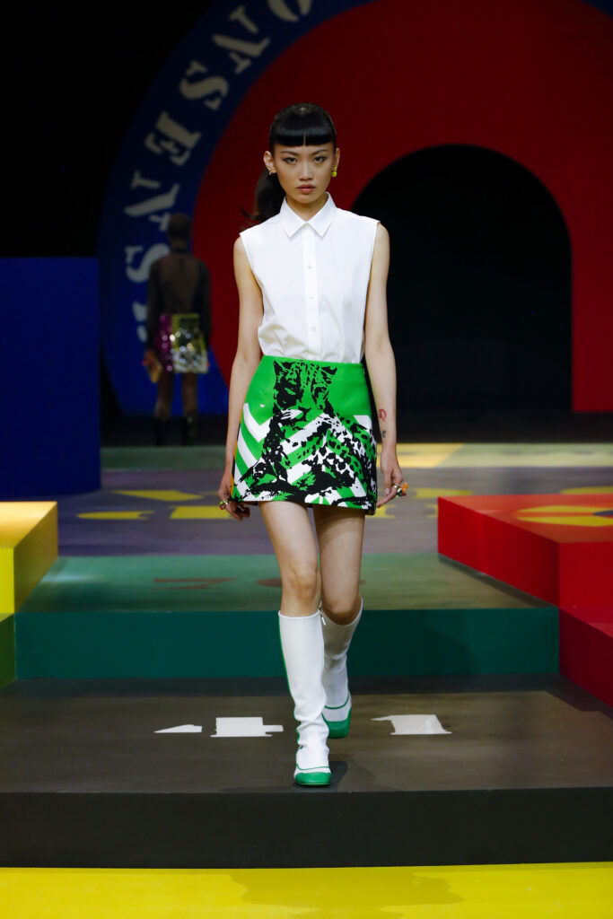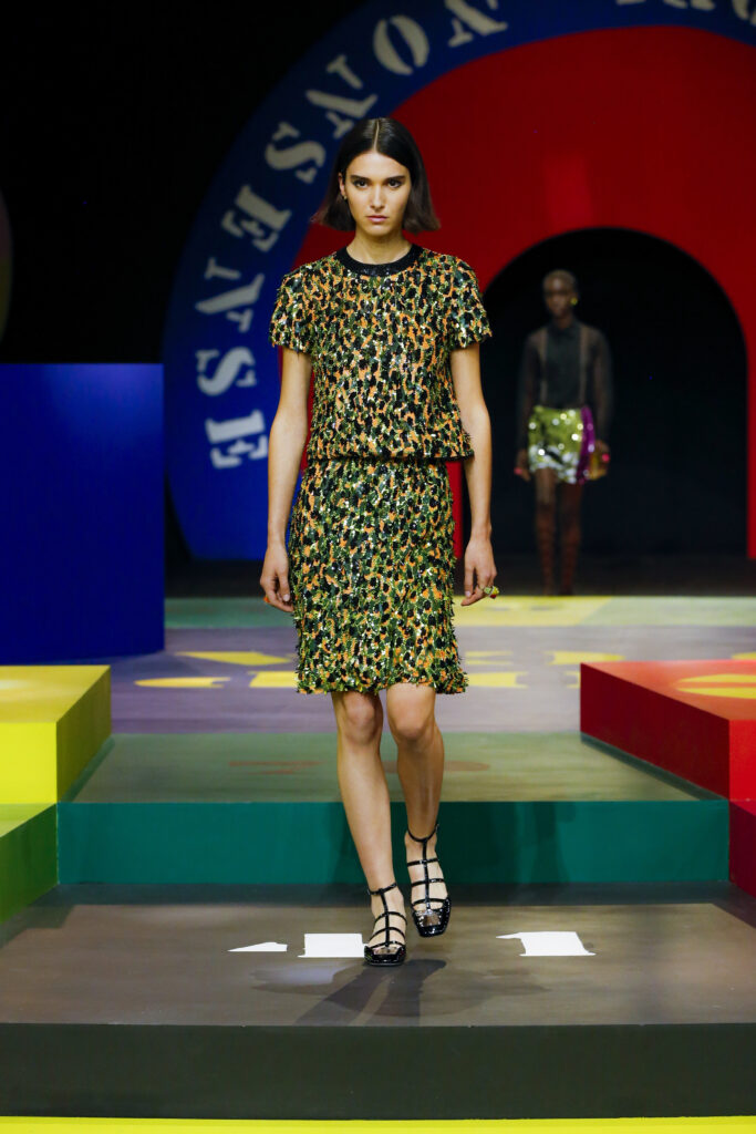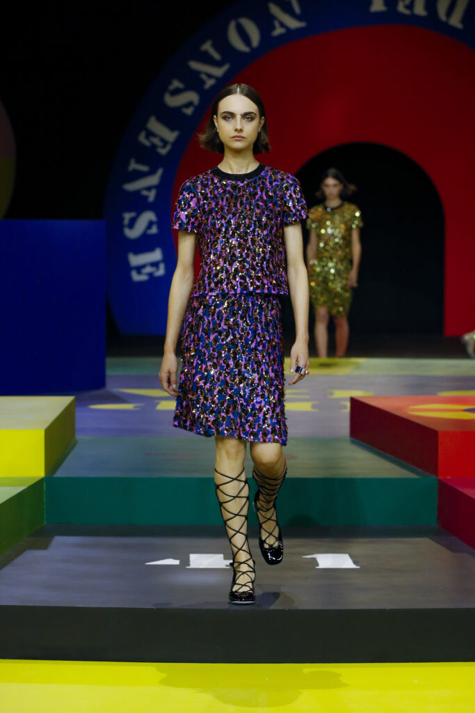 L’imaginaire de ce défilé Dior prêt-à-porter printemps-été 2022 se nourrit de curiosité, de désirs et de recherches. Maria Grazia Chiuri explore la richesse des années 1960, et plus précisément la période où Marc Bohan était le Directeur Artistique de la Maison. Elle met en lumière l’esprit visionnaire de la collection Slim Look, réalisée en 1961, à propos de laquelle la presse écrivait : « Elle change complètement la mode, tout comme le New Look l’a fait en 19471. » Les silhouettes révèlent ainsi des coupes et des effets graphiques, tels des color blocks. Les couleurs évoquent également les géométries spatiales et les jeux pensés par Anna Paparatti. Cette artiste a conçu la scénographie du show comme un « jeu de l’absurde » reflétant la philosophie de ses travaux. Les matières et les différents motifs rappellent le Piper Club, la légendaire boîte de nuit romaine, lieu de liberté unique au croisement des arts, du design et de la mode.