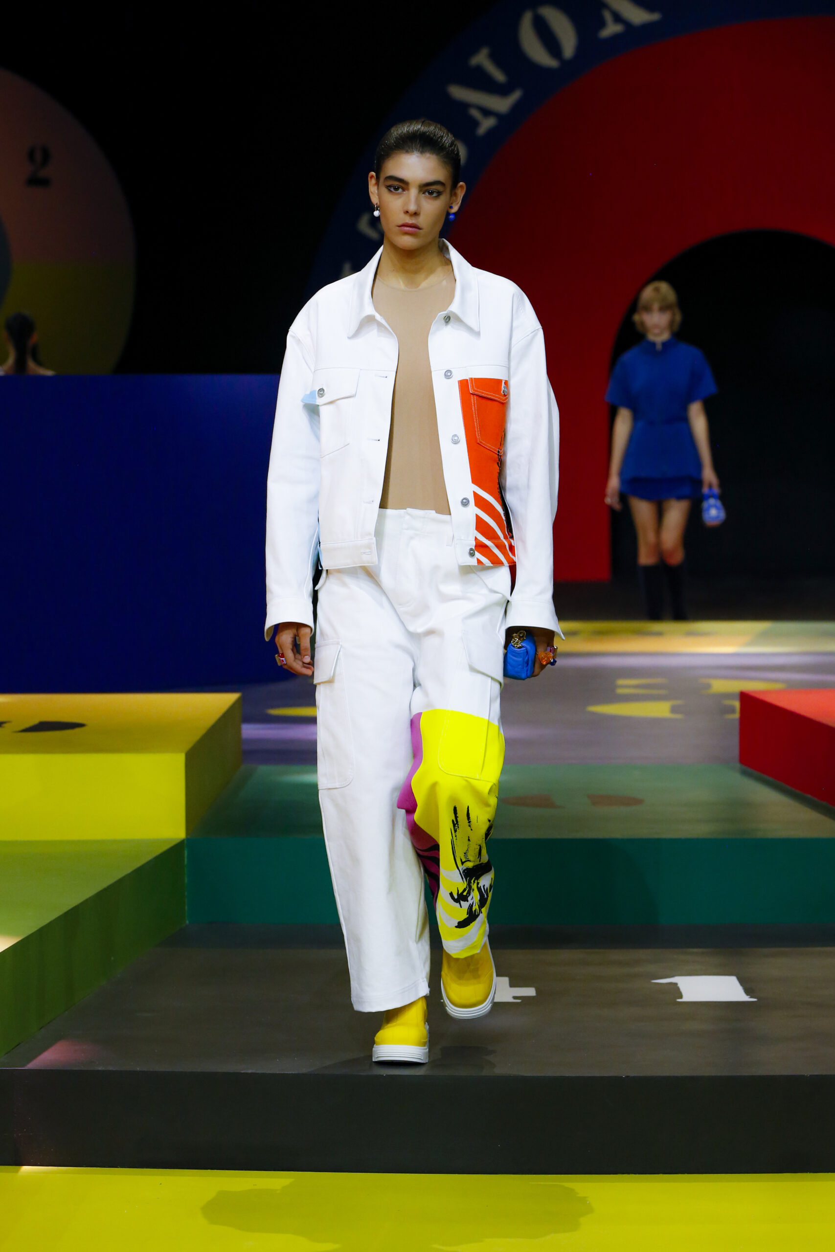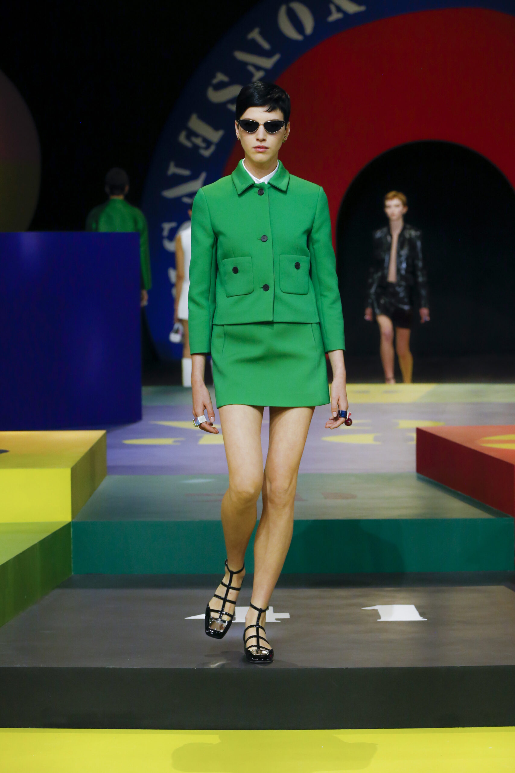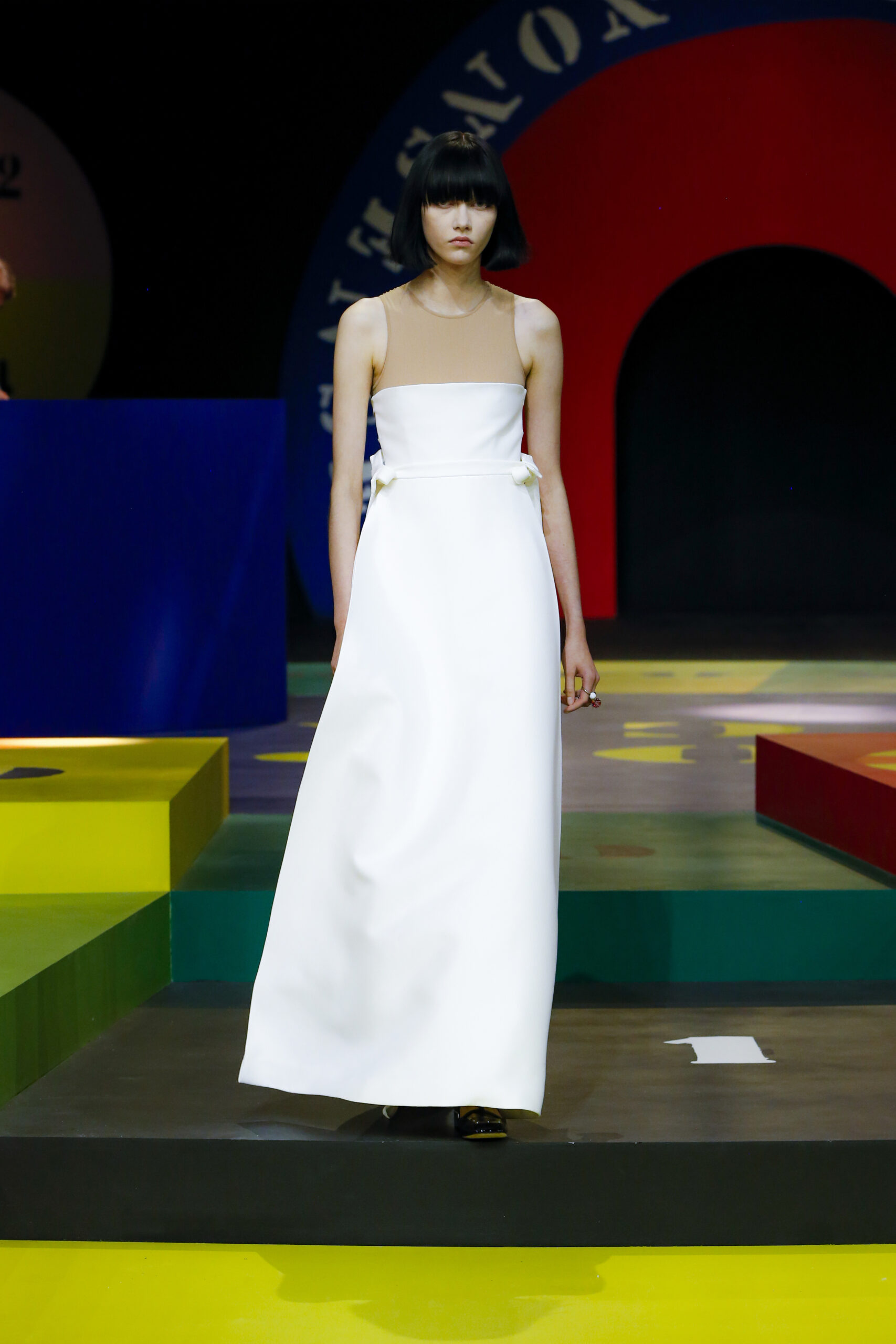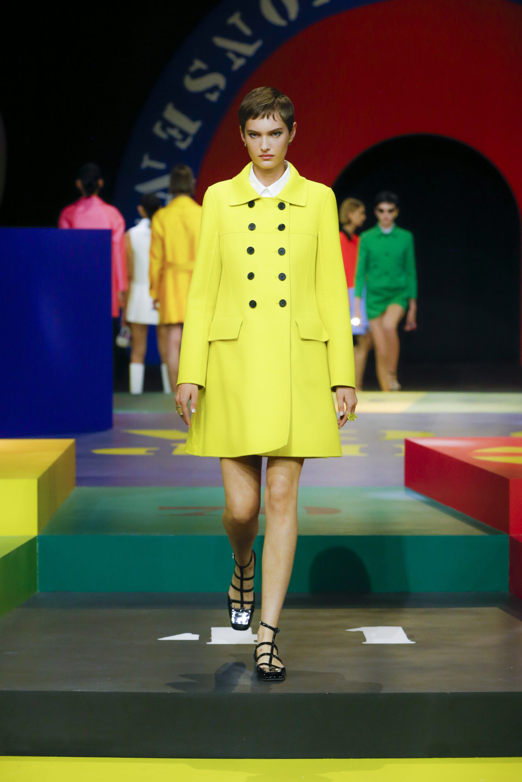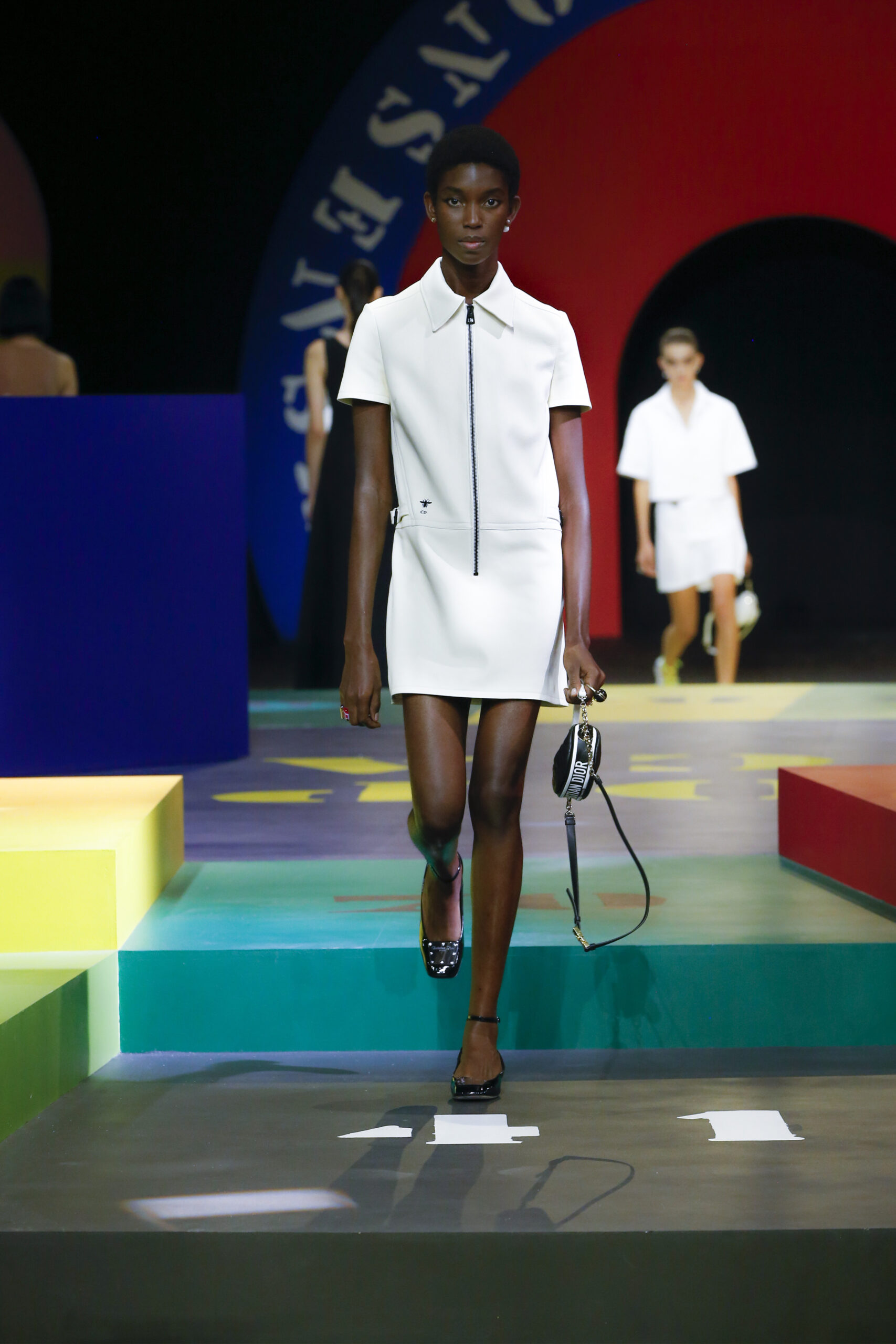 L’imaginaire de ce défilé Dior prêt-à-porter printemps-été 2022 se nourrit de curiosité, de désirs et de recherches. Maria Grazia Chiuri explore la richesse des années 1960, et plus précisément la période où Marc Bohan était le Directeur Artistique de la Maison. Elle met en lumière l’esprit visionnaire de la collection Slim Look, réalisée en 1961, à propos de laquelle la presse écrivait : « Elle change complètement la mode, tout comme le New Look l’a fait en 19471. » Les silhouettes révèlent ainsi des coupes et des effets graphiques, tels des color blocks. Les couleurs évoquent également les géométries spatiales et les jeux pensés par Anna Paparatti. Cette artiste a conçu la scénographie du show comme un « jeu de l’absurde » reflétant la philosophie de ses travaux. Les matières et les différents motifs rappellent le Piper Club, la légendaire boîte de nuit romaine, lieu de liberté unique au croisement des arts, du design et de la mode.