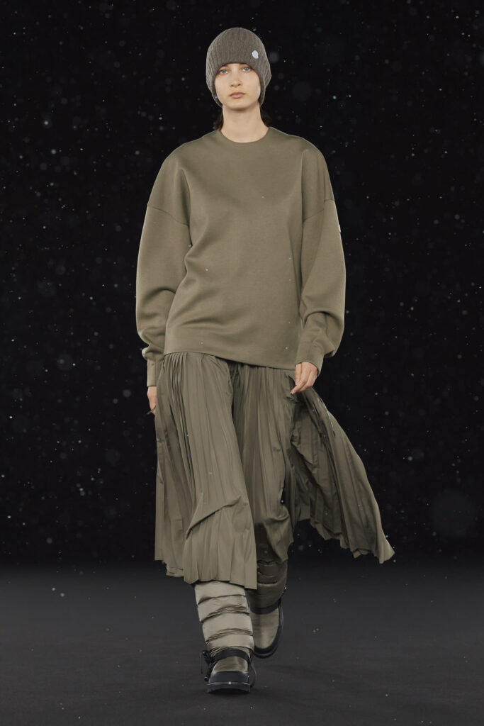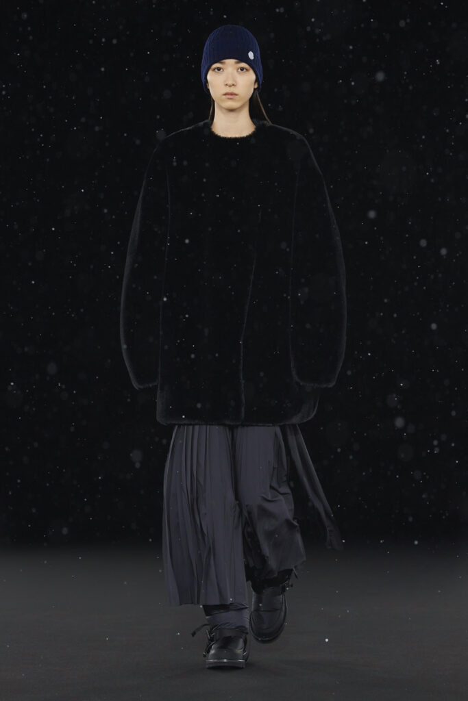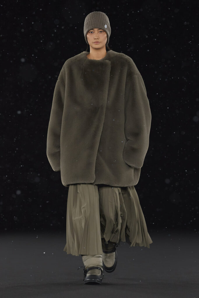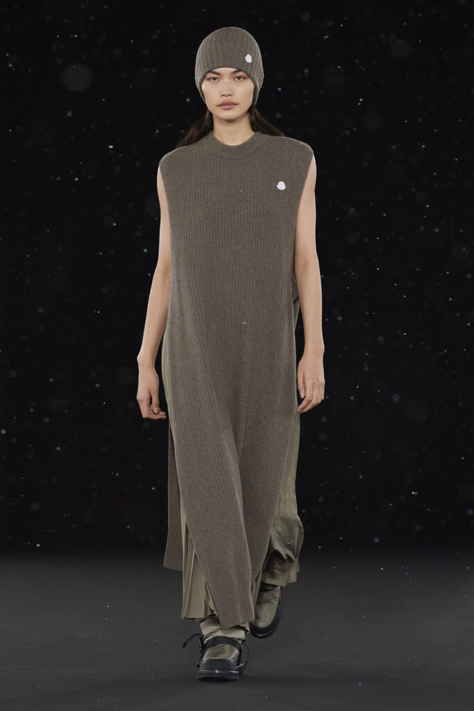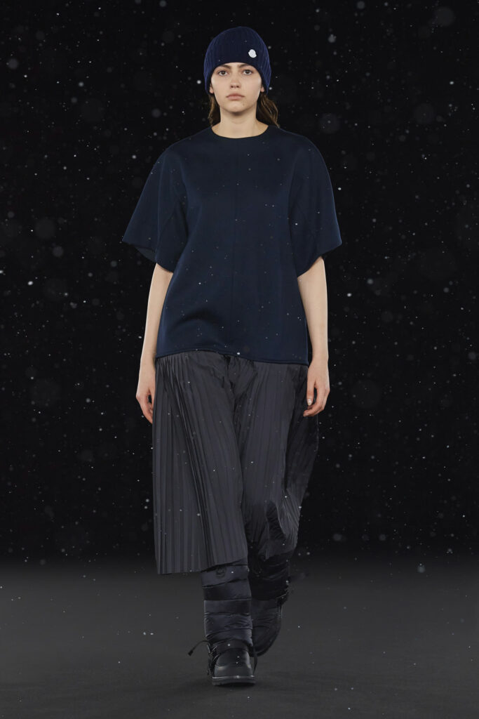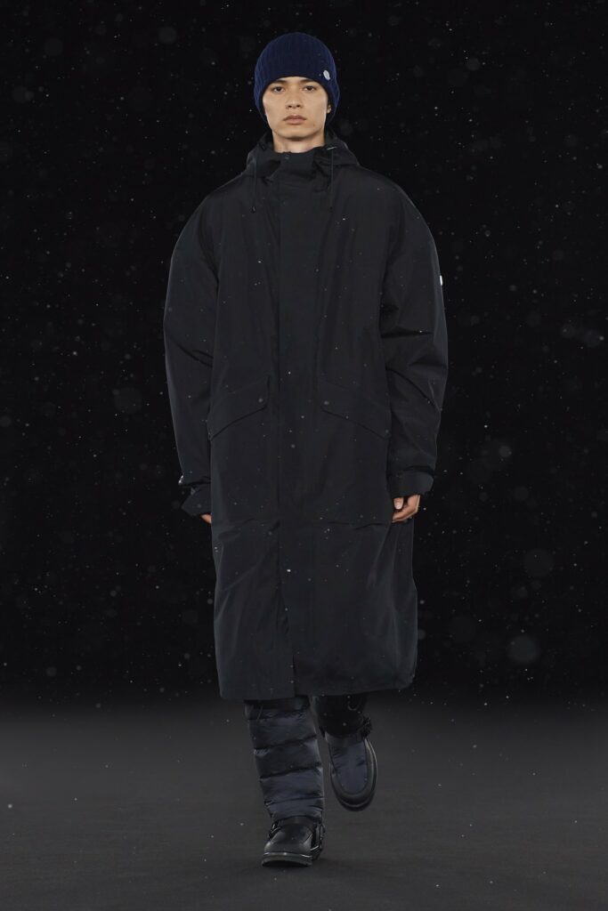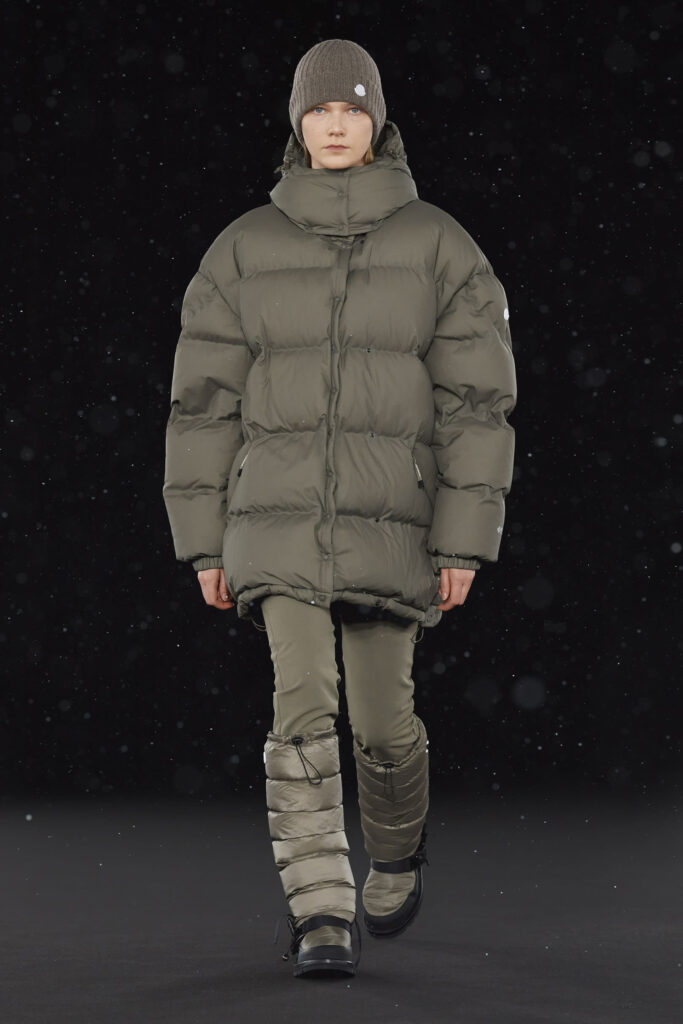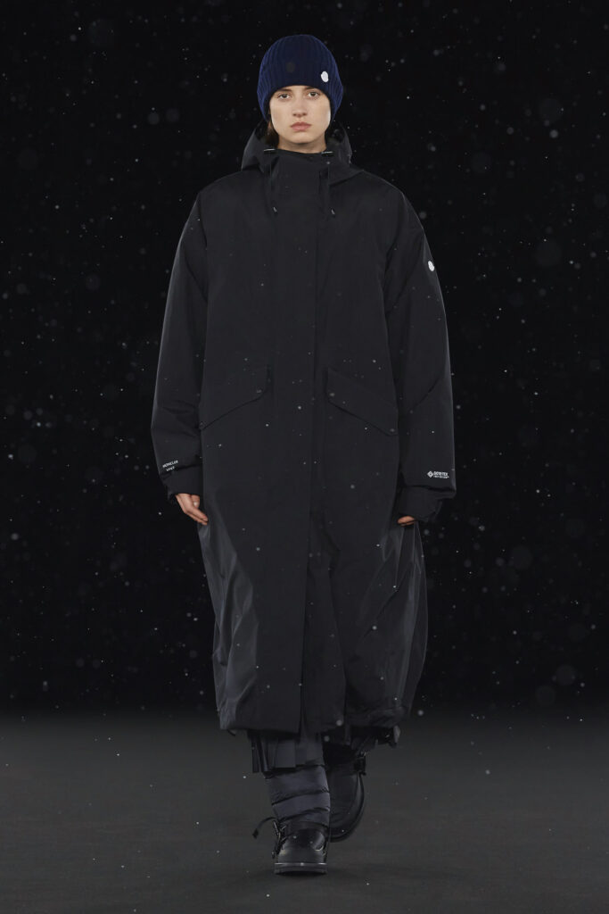 La signature de la collection se traduit par une extrême simplicité et dans les détails utilitaires, caractéristiques de HYKE, tels que les fentes latérales et les longs zips. On retrouve une continuité harmonieuse entre les collections pour homme et pour femme, dans un miroir de formes et de couleurs résolument urbaine. Les vestes en polaire, les pantalons aux multiples épaisseurs, les jupes plissées, les robes, et même les cardigans côtelés et les tuniques fendues soulignent les inspirations liées aux uniformes que l’on retrouve dans la collection. La ligne offre également des bonnets et des bottes matelassées, le tout conçu pour être plié et transporté. Héritage et évolution demeurent les maîtres mots de HYKE. Cette même philosophie transparaît dans la collection 4 MONCLER HYKE délivrant un message efficace, chaleureux et concis.