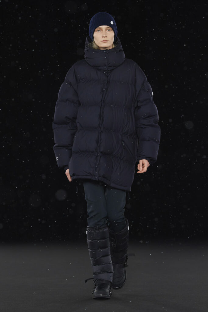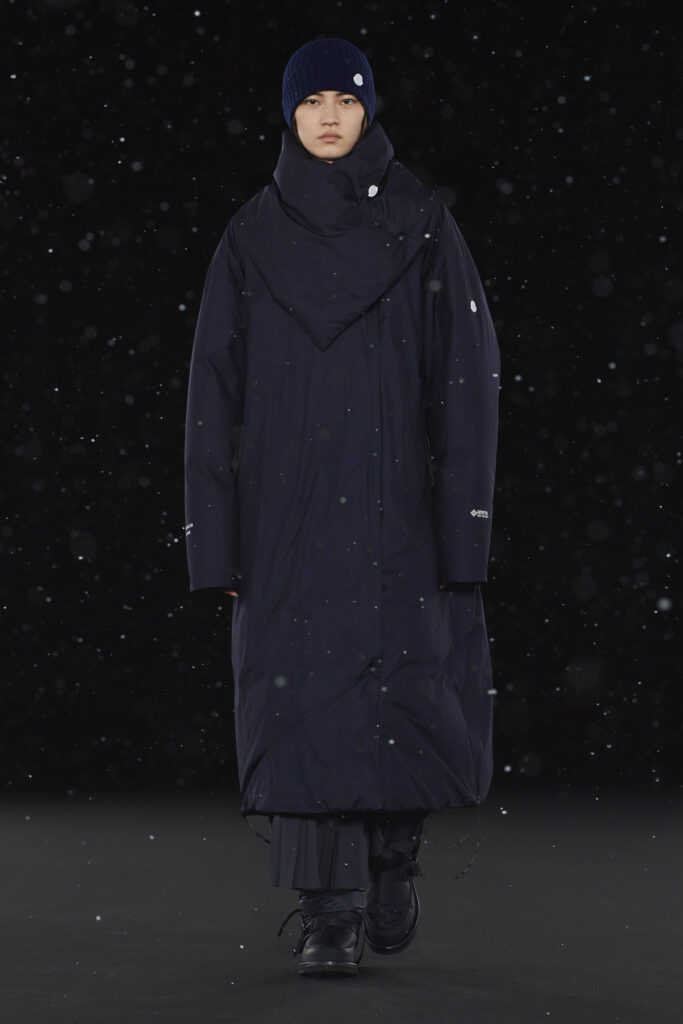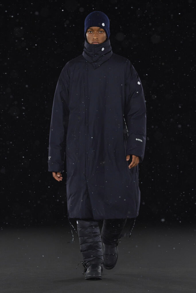 Pour concevoir cette collection Moncler Genius, HYKE s’est particulièrement inspiré des pièces des archives de Moncler, comme la veste en duvet Lionel Terray de 1960 ainsi que des uniformes vintages portés jadis en France, pays berceau de la maison. Ces inspirations historiques ont été développées avec une approche artistique innovante en employant les tissus techniques et le savoir-faire de de Moncler. Cette collection combine l’esthétique épurée et l’élégante de Hyke avec le matelassé iconique de Moncler. Les lignes sont épurées et sans détail superflu. Les vestes en duvet, les parkas à capuche, les manteaux sans col pourvus d’écharpes à fixer en protège-cou et les vestes avec doublure amovible sont déclinés dans des palettes de bleu marine et de taupe retravaillées dans des compositions monochromes.
