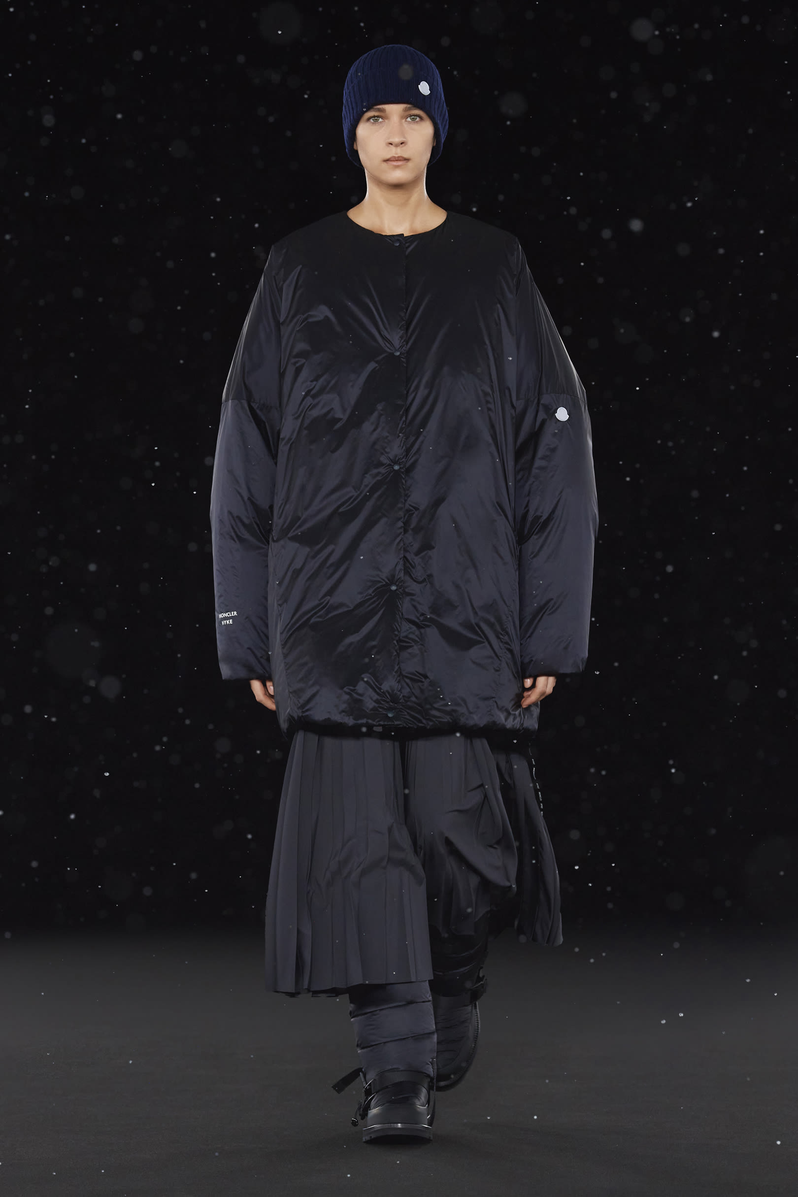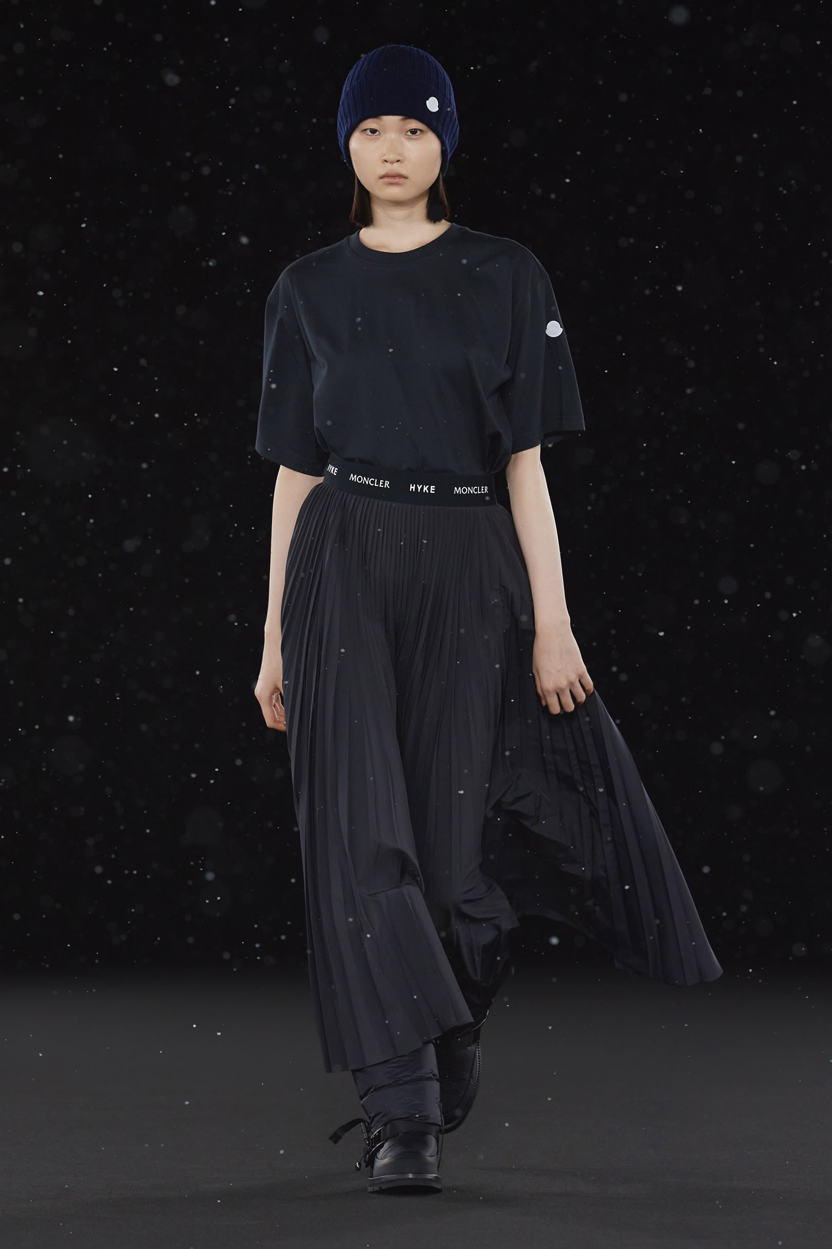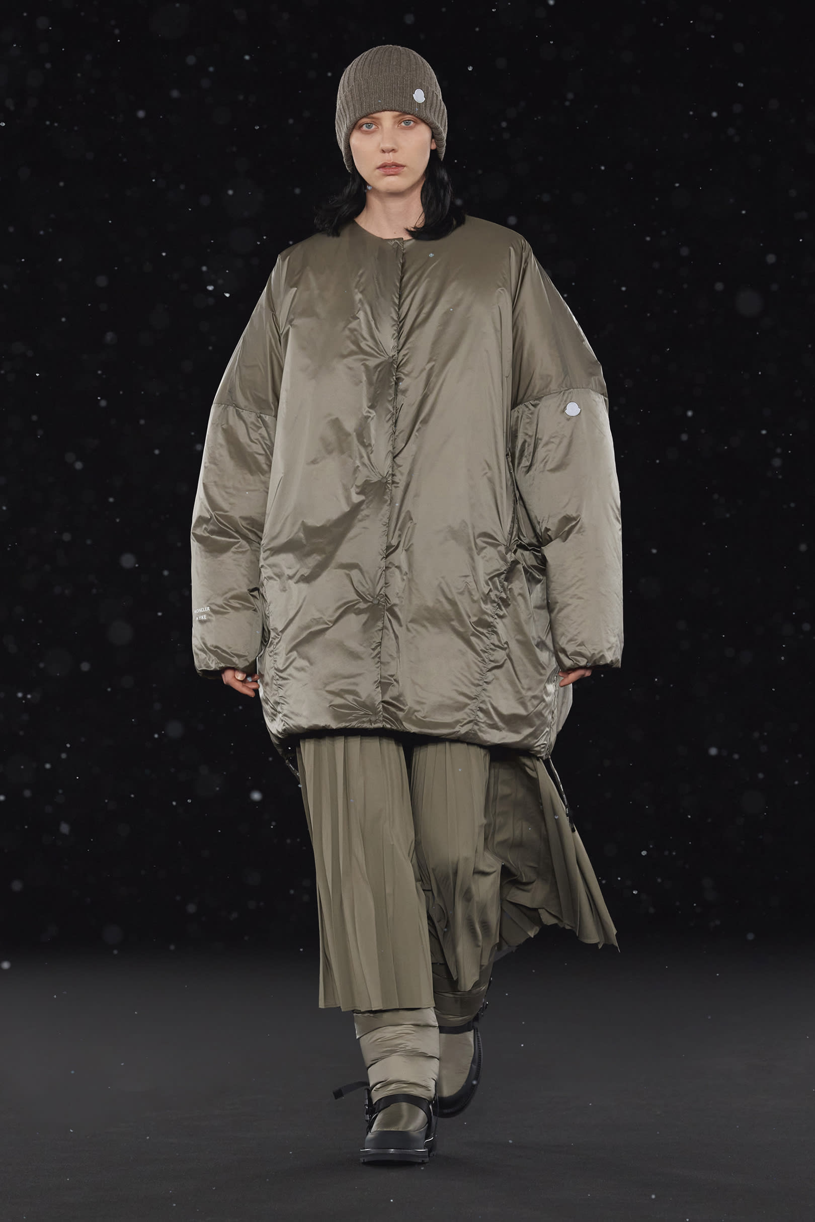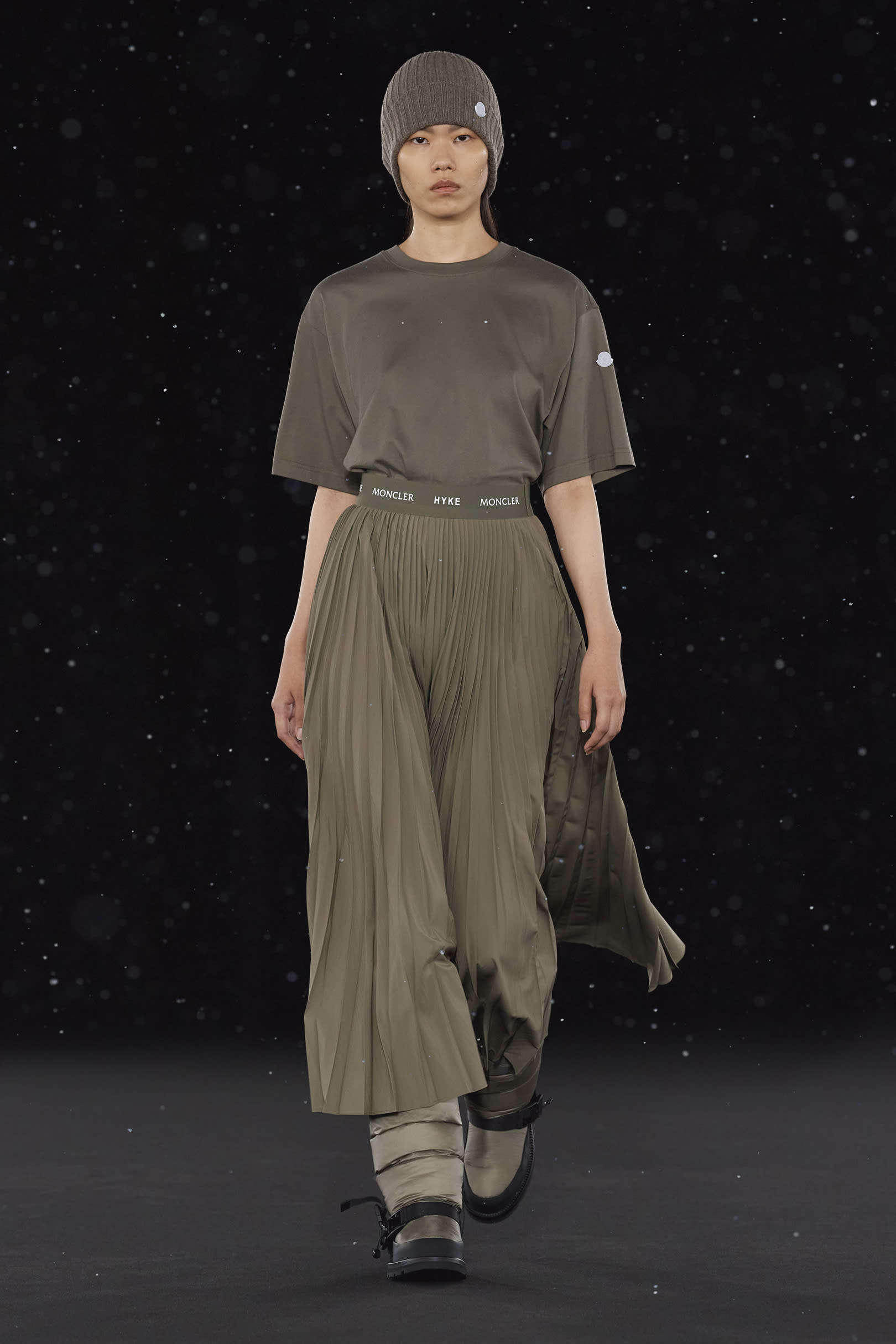 La signature de la collection se traduit par une extrême simplicité et dans les détails utilitaires, caractéristiques de HYKE, tels que les fentes latérales et les longs zips. On retrouve une continuité harmonieuse entre les collections pour homme et pour femme, dans un miroir de formes et de couleurs résolument urbaine. Les vestes en polaire, les pantalons aux multiples épaisseurs, les jupes plissées, les robes, et même les cardigans côtelés et les tuniques fendues soulignent les inspirations liées aux uniformes que l’on retrouve dans la collection. La ligne offre également des bonnets et des bottes matelassées, le tout conçu pour être plié et transporté. Héritage et évolution demeurent les maîtres mots de HYKE. Cette même philosophie transparaît dans la collection 4 MONCLER HYKE délivrant un message efficace, chaleureux et concis.