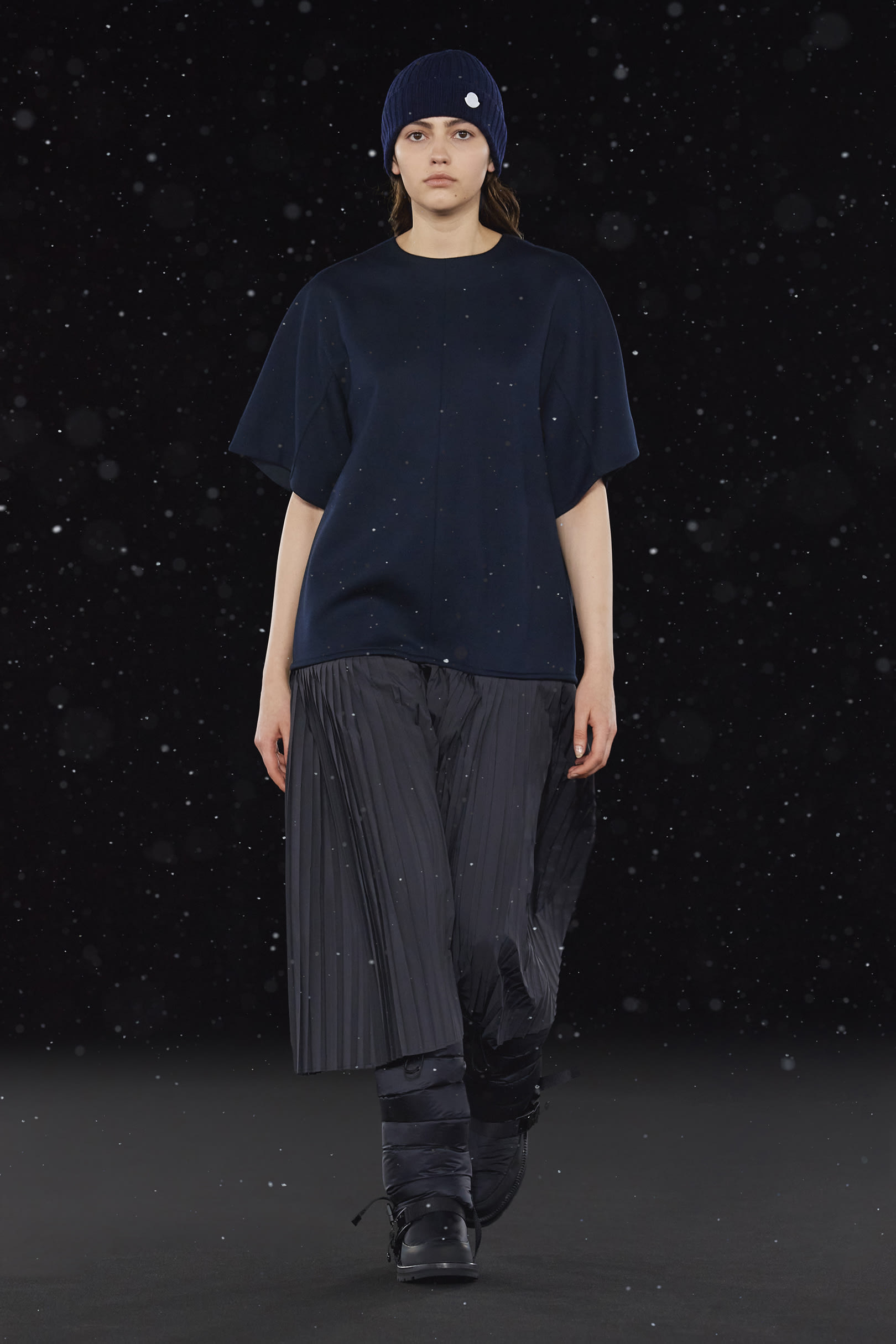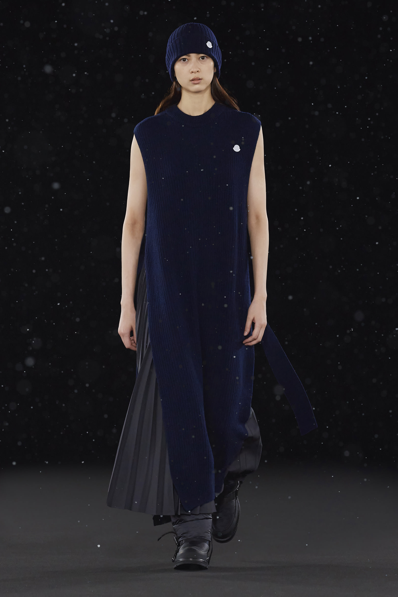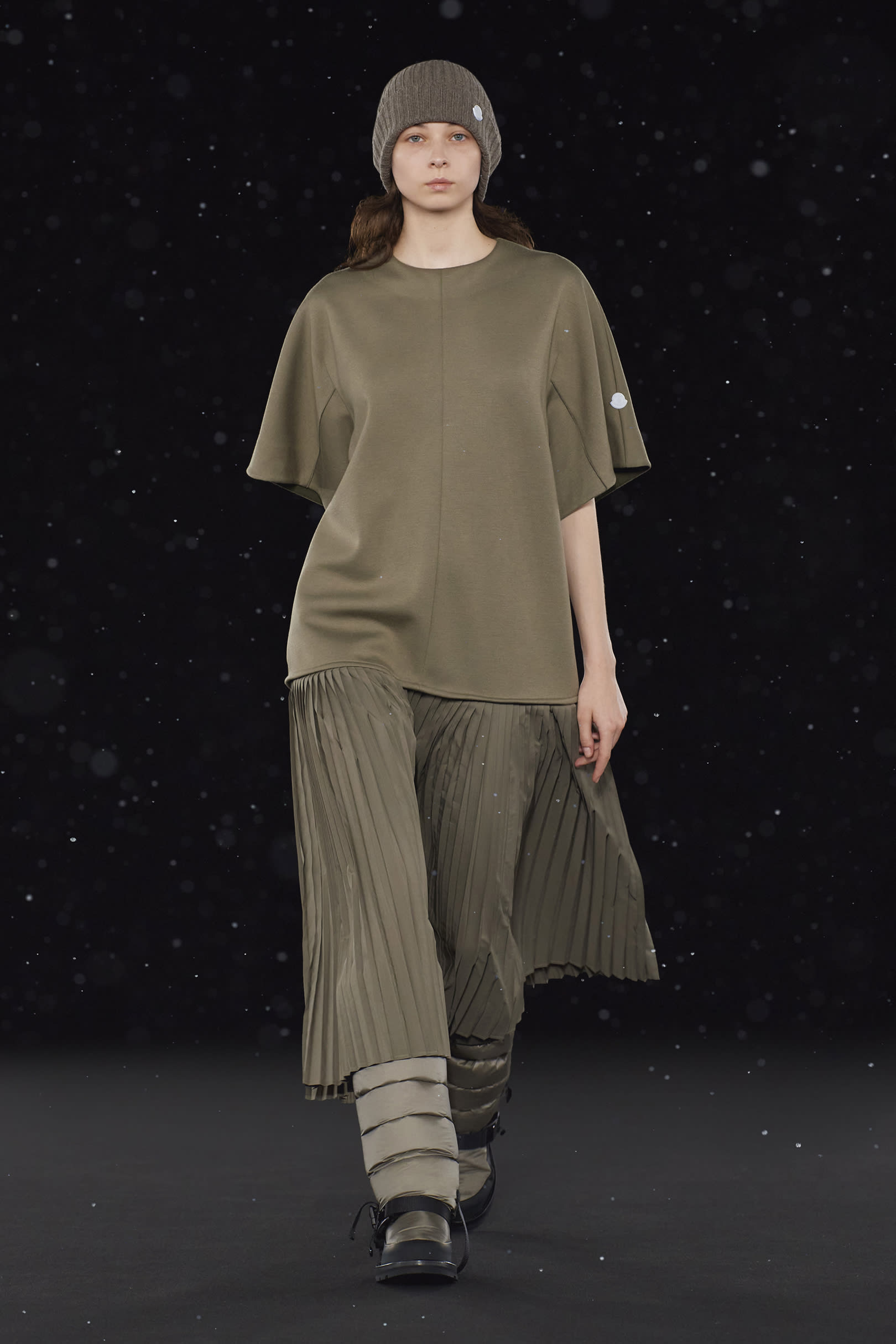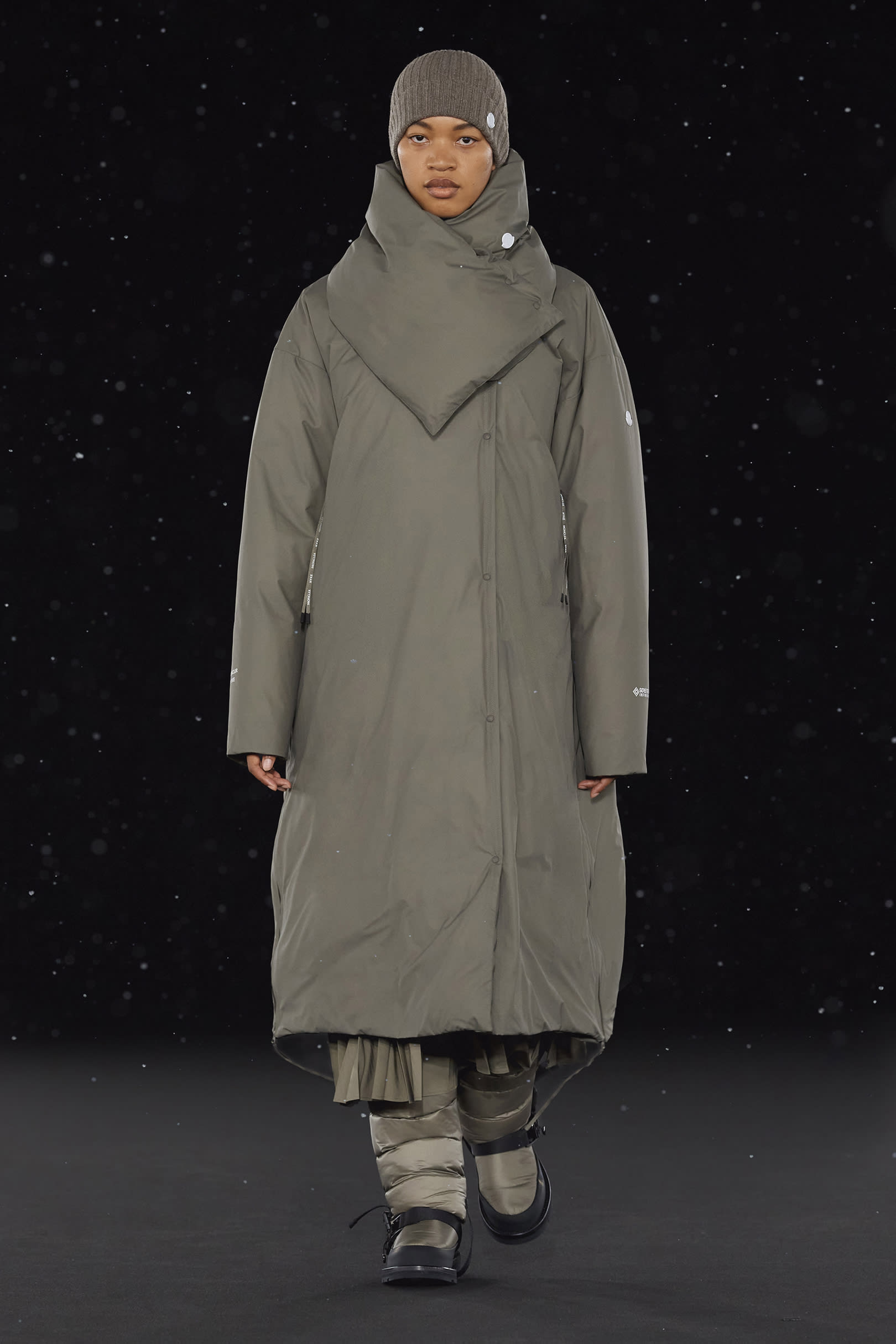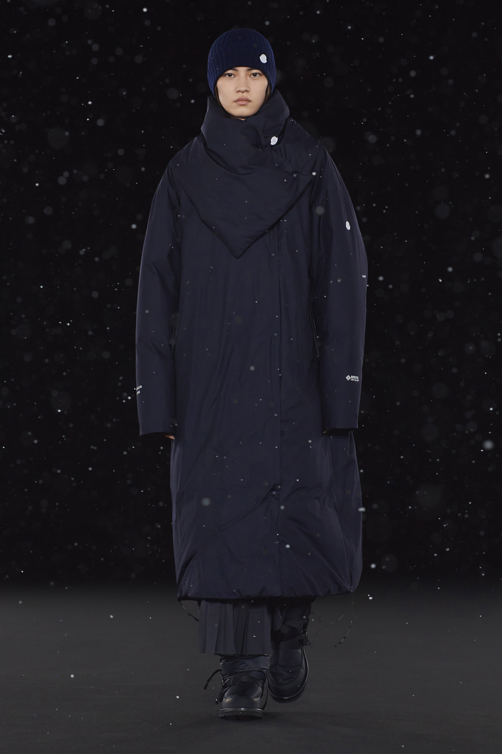La signature de la collection se traduit par une extrême simplicité et dans les détails utilitaires, caractéristiques de HYKE, tels que les fentes latérales et les longs zips. On retrouve une continuité harmonieuse entre les collections pour homme et pour femme, dans un miroir de formes et de couleurs résolument urbaine. Les vestes en polaire, les pantalons aux multiples épaisseurs, les jupes plissées, les robes, et même les cardigans côtelés et les tuniques fendues soulignent les inspirations liées aux uniformes que l’on retrouve dans la collection. La ligne offre également des bonnets et des bottes matelassées, le tout conçu pour être plié et transporté. Héritage et évolution demeurent les maîtres mots de HYKE. Cette même philosophie transparaît dans la collection 4 MONCLER HYKE délivrant un message efficace, chaleureux et concis.