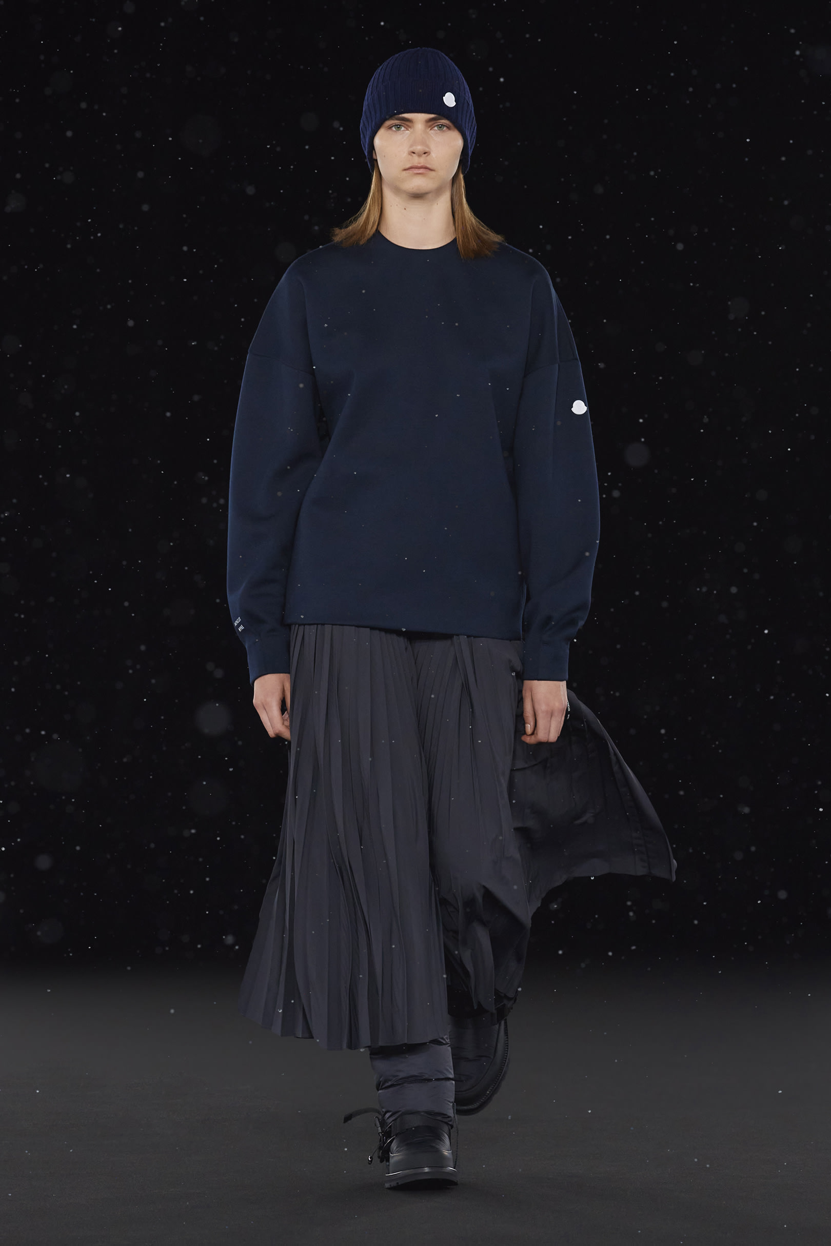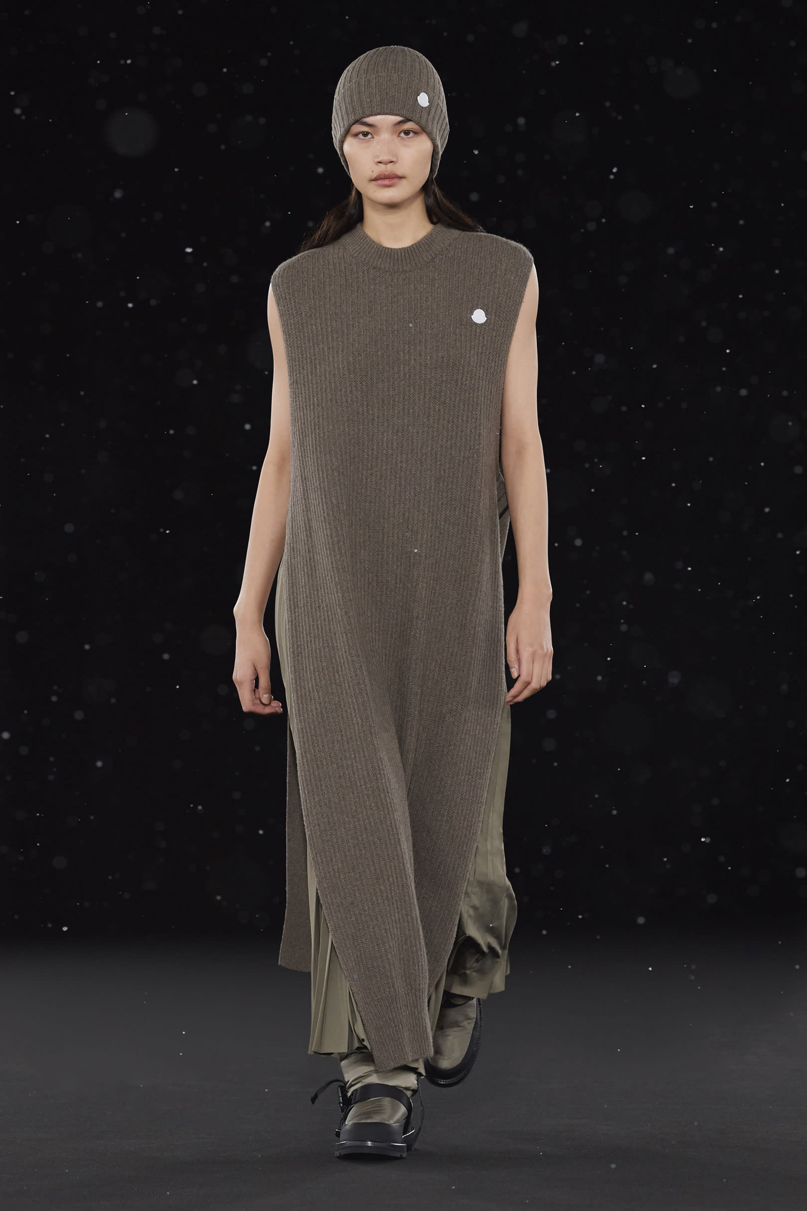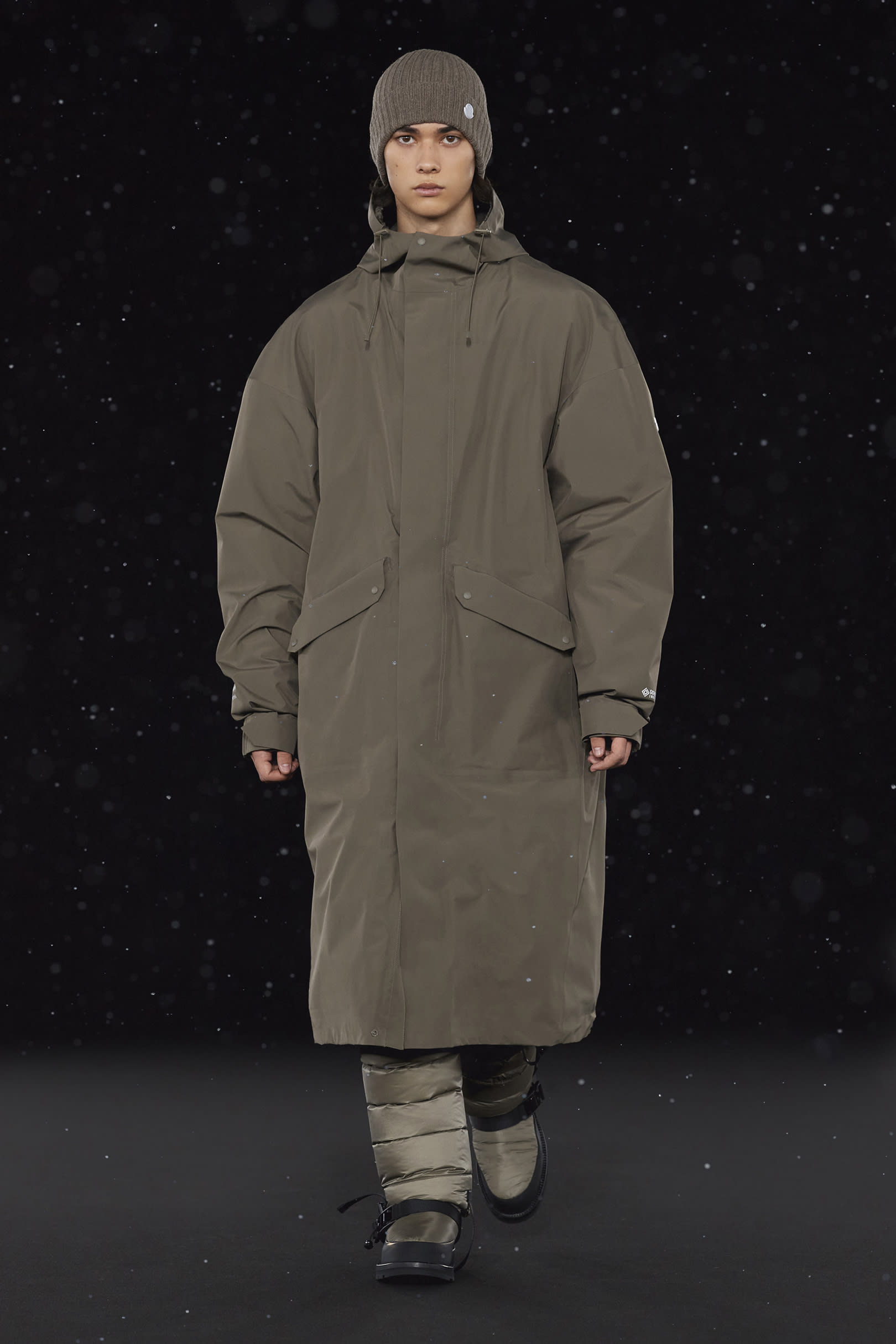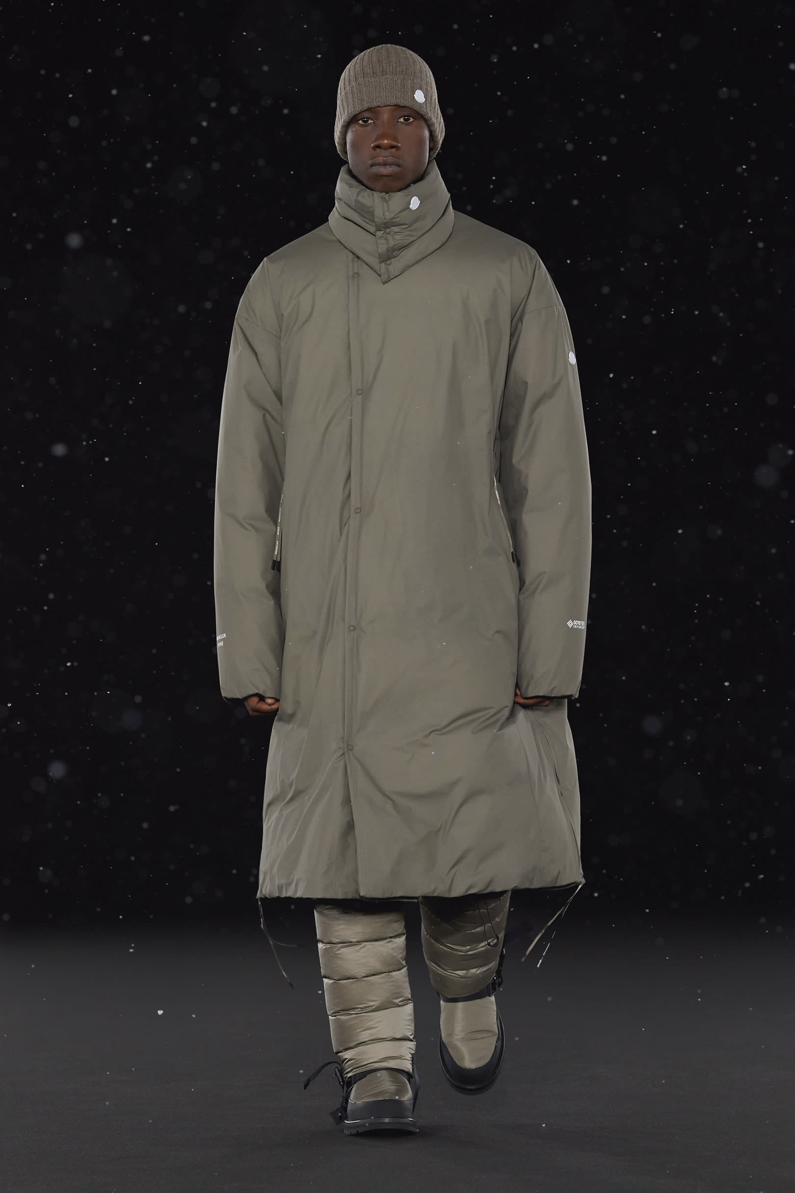 La signature de la collection se traduit par une extrême simplicité et dans les détails utilitaires, caractéristiques de HYKE, tels que les fentes latérales et les longs zips. On retrouve une continuité harmonieuse entre les collections pour homme et pour femme, dans un miroir de formes et de couleurs résolument urbaine. Les vestes en polaire, les pantalons aux multiples épaisseurs, les jupes plissées, les robes, et même les cardigans côtelés et les tuniques fendues soulignent les inspirations liées aux uniformes que l’on retrouve dans la collection. La ligne offre également des bonnets et des bottes matelassées, le tout conçu pour être plié et transporté. Héritage et évolution demeurent les maîtres mots de HYKE. Cette même philosophie transparaît dans la collection 4 MONCLER HYKE délivrant un message efficace, chaleureux et concis.