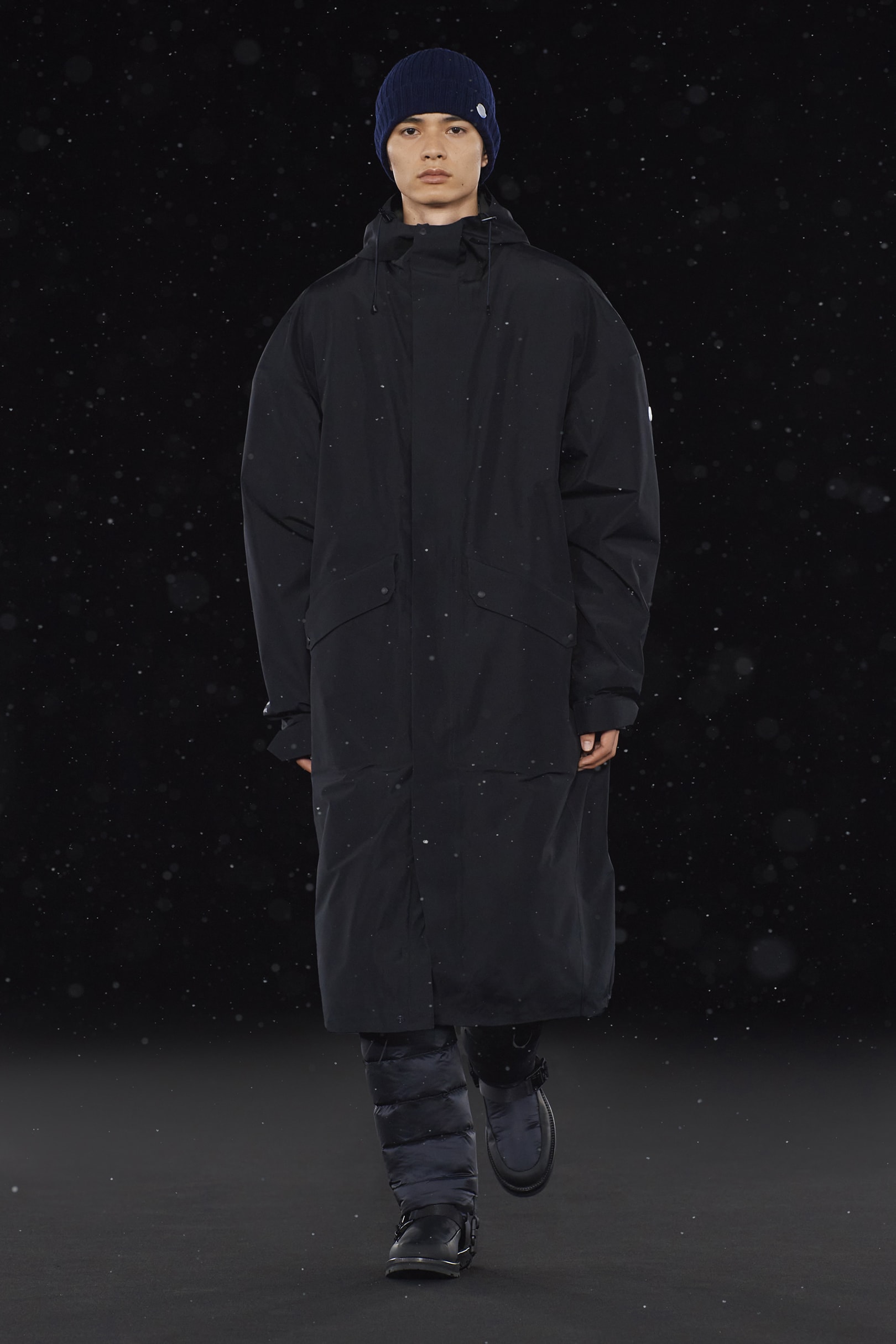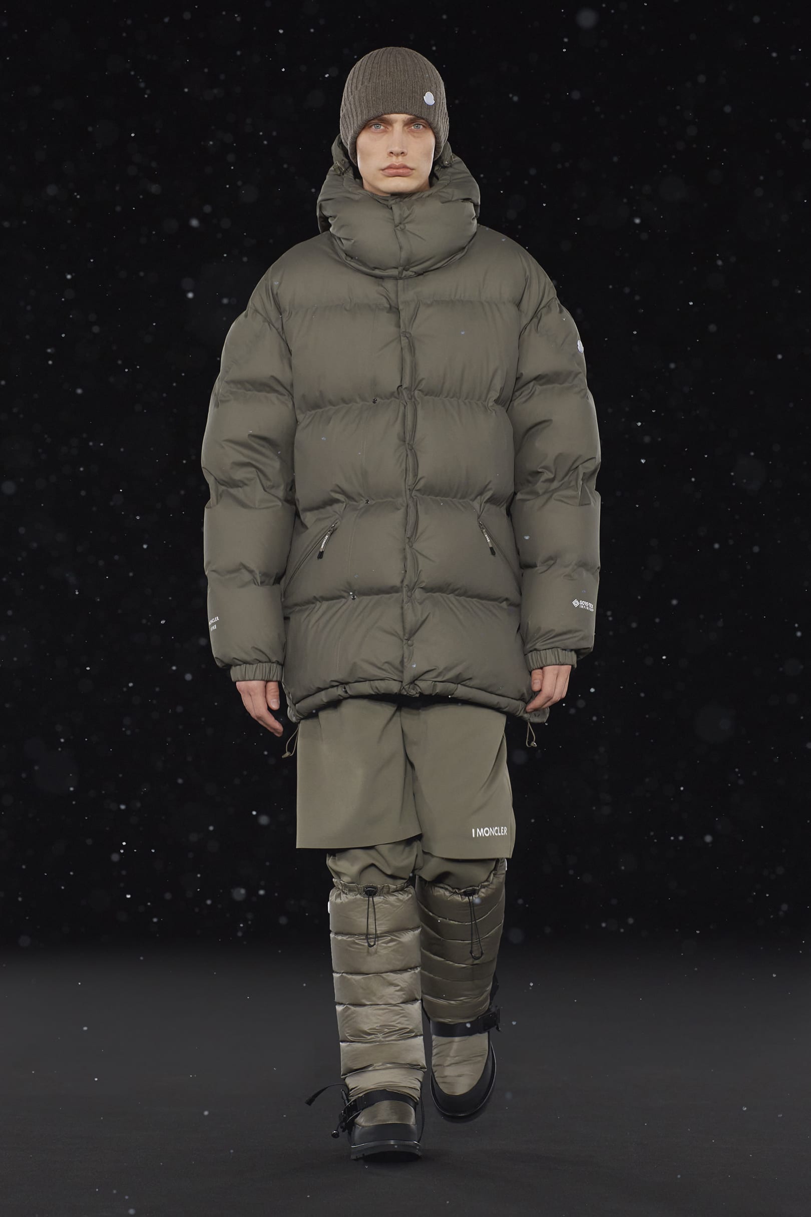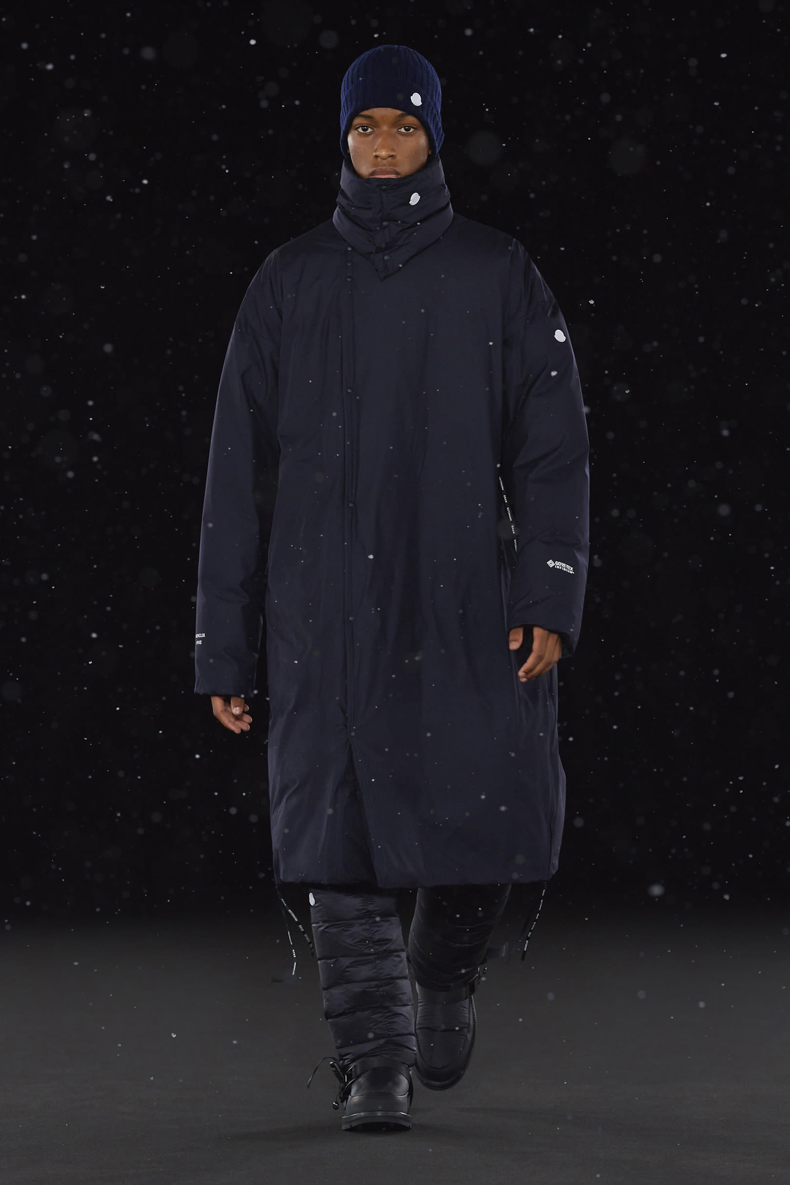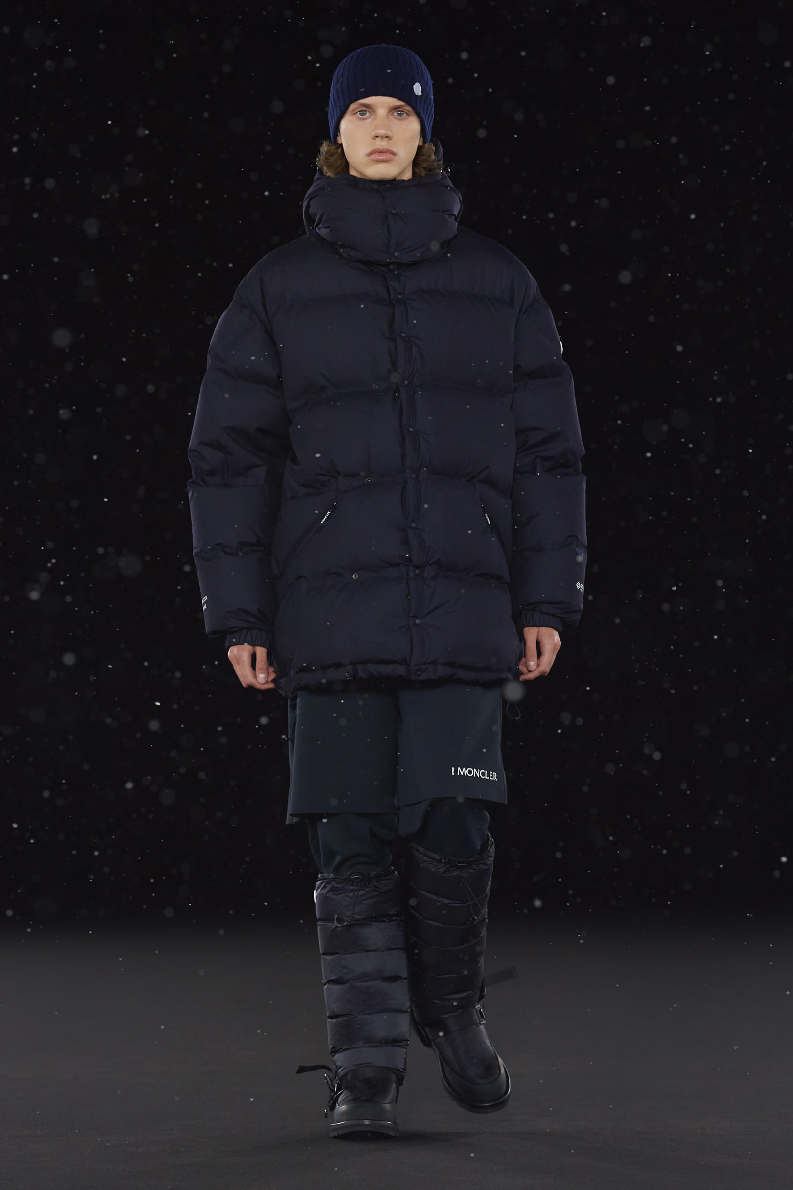 Pour concevoir cette collection Moncler Genius, HYKE s’est particulièrement inspiré des pièces des archives de Moncler, comme la veste en duvet Lionel Terray de 1960 ainsi que des uniformes vintages portés jadis en France, pays berceau de la maison. Ces inspirations historiques ont été développées avec une approche artistique innovante en employant les tissus techniques et le savoir-faire de de Moncler. Cette collection combine l’esthétique épurée et l’élégante de Hyke avec le matelassé iconique de Moncler. Les lignes sont épurées et sans détail superflu. Les vestes en duvet, les parkas à capuche, les manteaux sans col pourvus d’écharpes à fixer en protège-cou et les vestes avec doublure amovible sont déclinés dans des palettes de bleu marine et de taupe retravaillées dans des compositions monochromes.