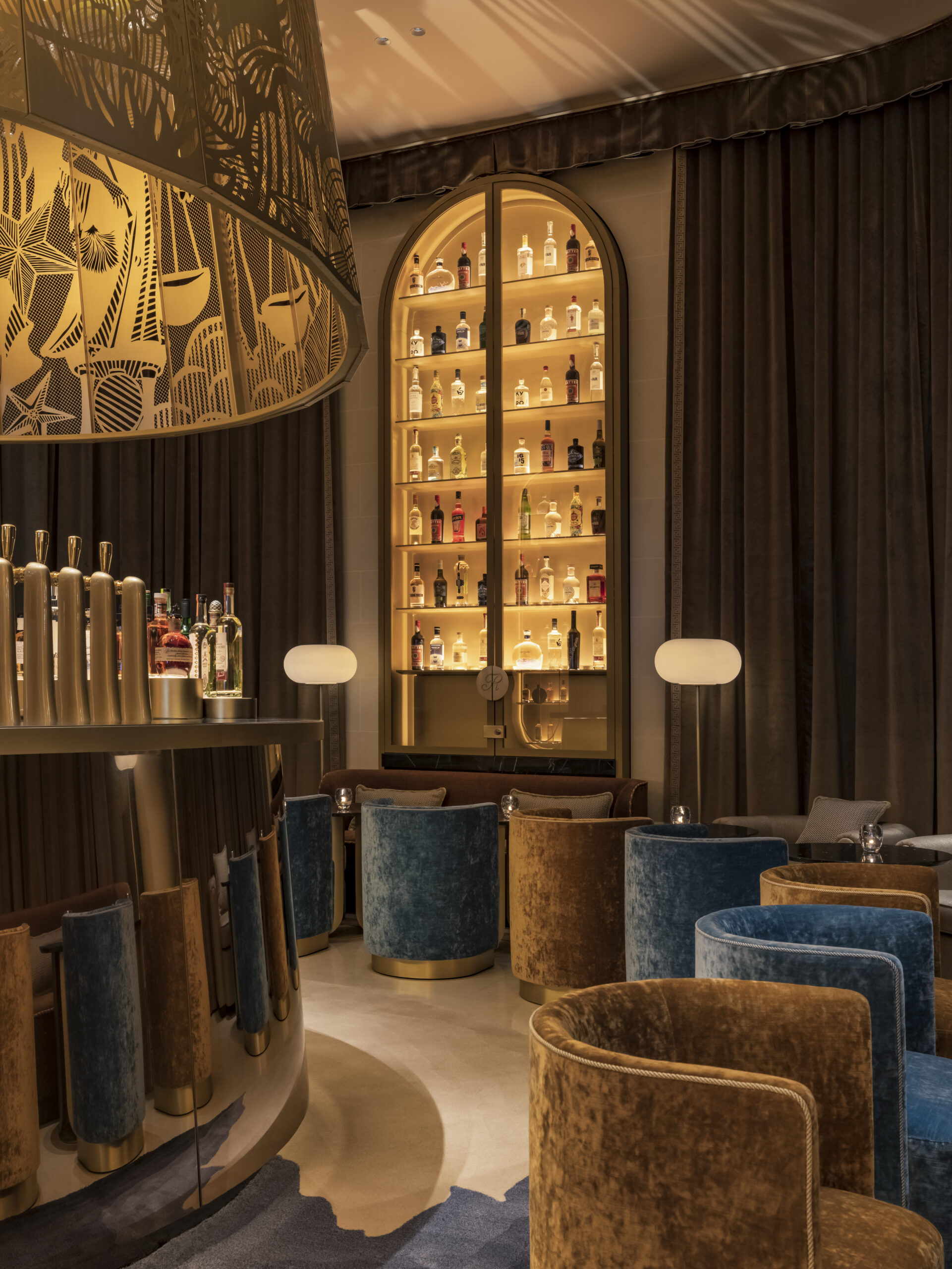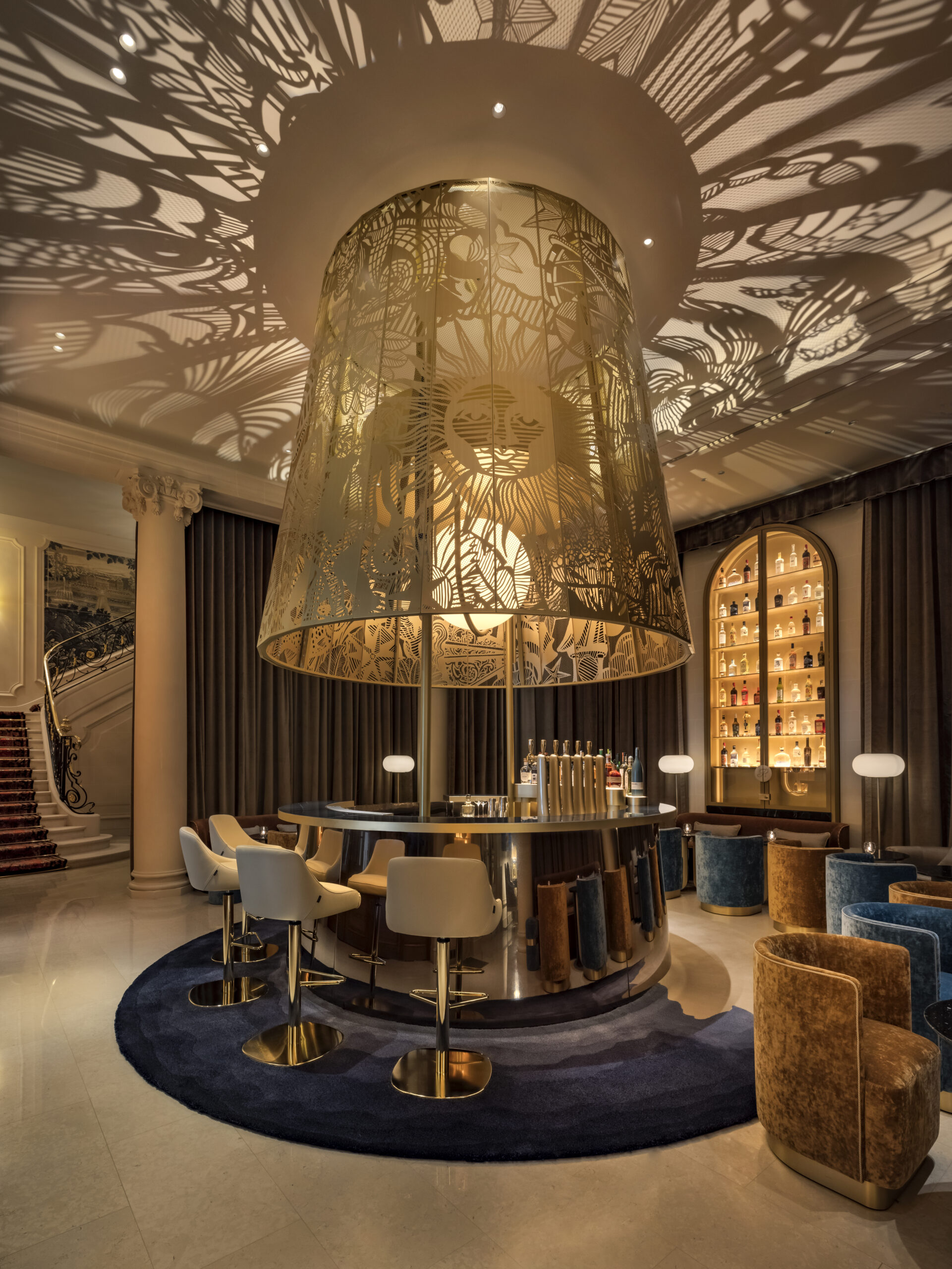 Outre les colonnes qui structurent ce lieu, de larges rideaux, tapis et mobiliers en laiton et velours ambrés confèrent un esprit chaleureux et intimiste. Celui-ci met en valeur l’architecture historique de l’hôtel et constitue un écrin pour les projections de lumière.