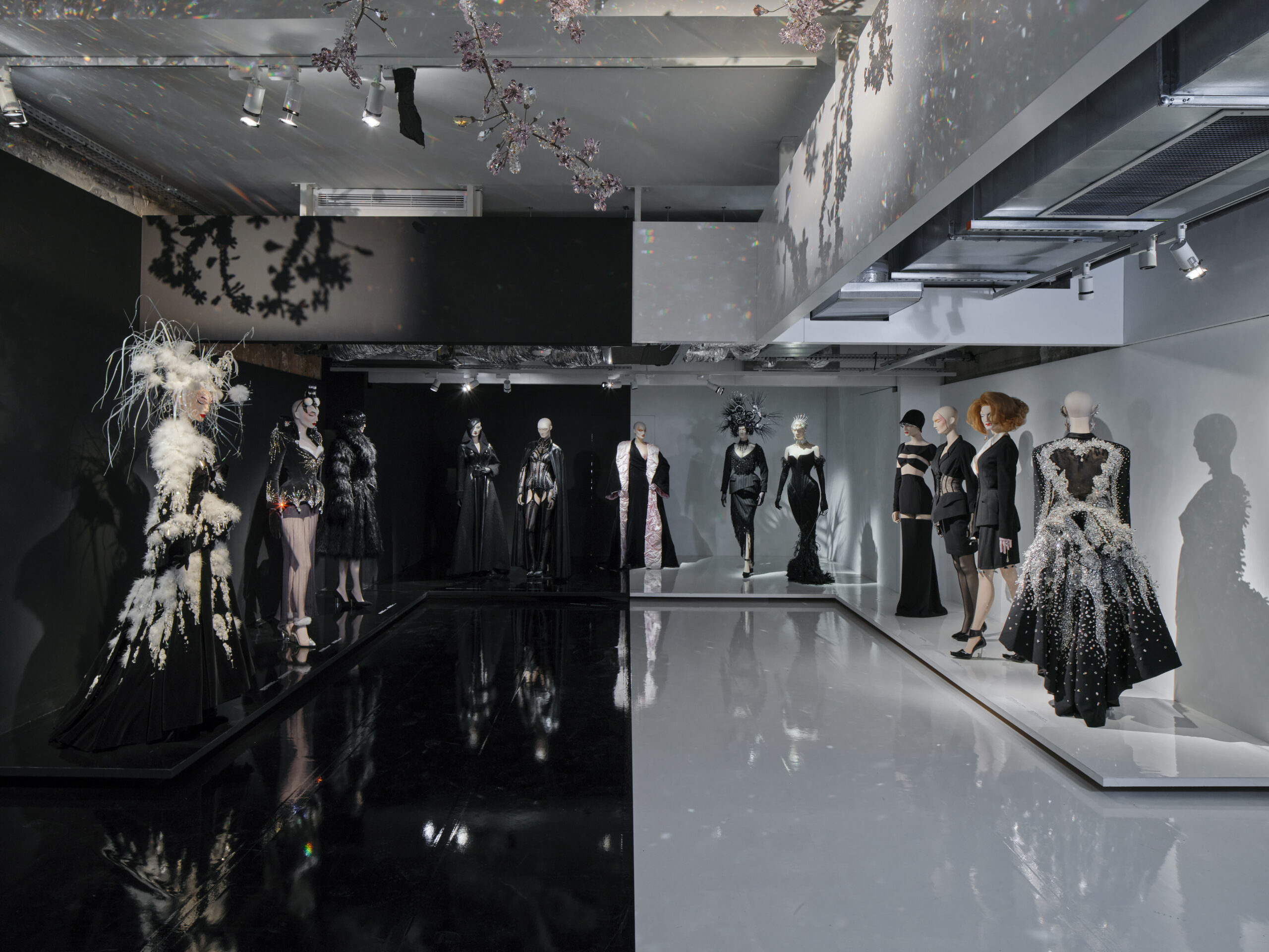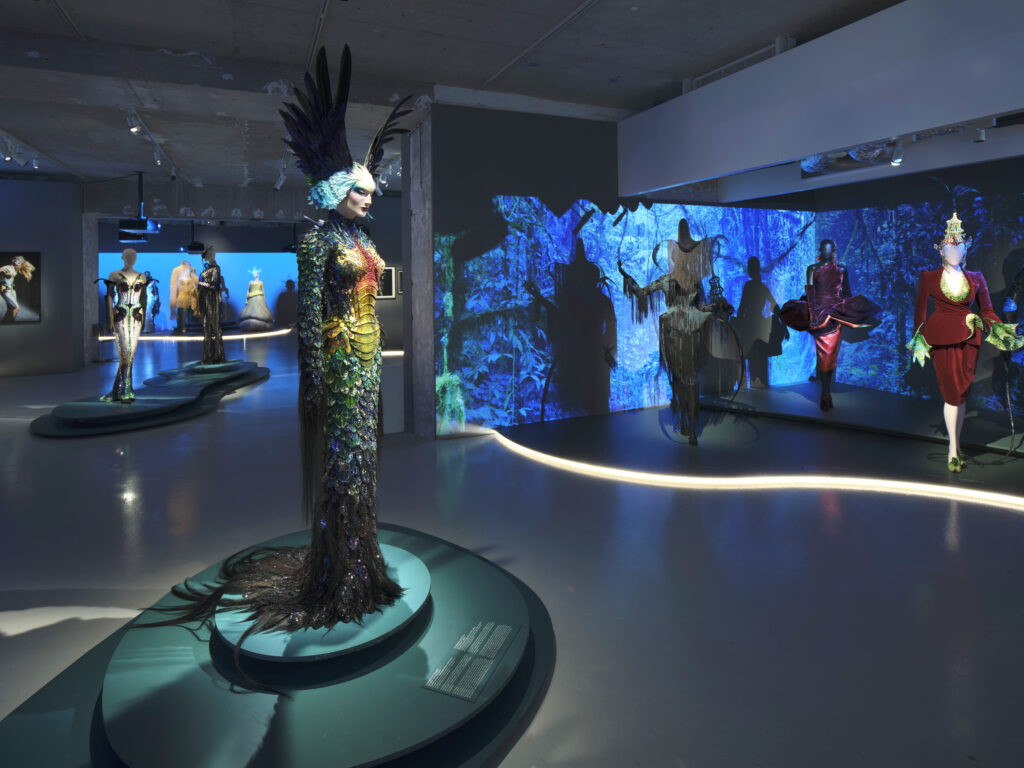 Silhouettes et accessoires de prêt-à porter et de haute couture, costumes de scène, photographies, vidéos et archives inédites, datées de 1973 à 2014, retracent l’univers fascinant du créateur, ainsi que ses multiples collaborations artistiques dans les domaines du spectacle, de la musique et du cinéma. Dans une scénographie collective assurée par le MBAM, sous le commissariat de Thierry-Maxime Loriot, des performances numériques de professionnels du monde du spectacle et de l’audiovisuel ponctuent le parcours. Le Musée des Arts Décoratifs se réjouit de rendre ainsi hommage à cette icone pluridisciplinaire : loin d’une rétrospective classique, c’est une partie de la vie et toute l’énergie, dont à la fois Thierry Mugler et Manfred sont complémentaires, qui sont ici mises à l’honneur dans les galeries de la Mode Christine et Stephen A. Schwarzman.
