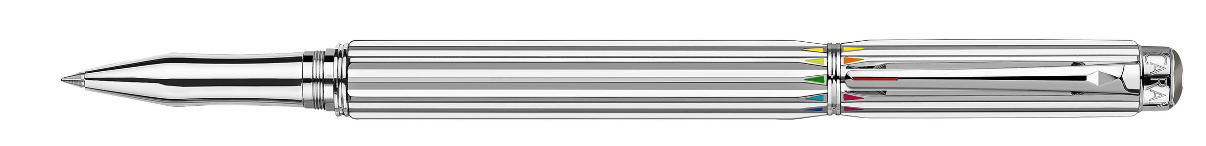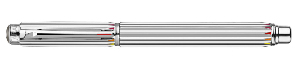 Le stylo : Roller au design soigné, il reprend le guillochage de la couronne et les index rainbow de la montre.