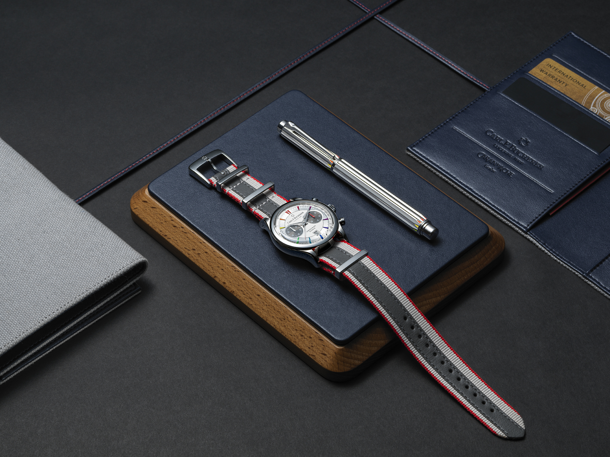 La montre : L’iconique Manero Flyback de Bucherer a été retravaillée pour cette offre spéciale. Toujours dotée d’un look sportif, elle dispose d’index rainbow et de deux bracelets interchangeables en Nato.