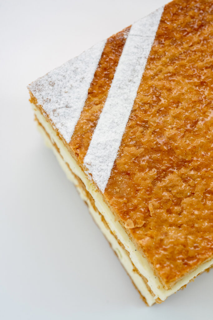 Le Millefeuille respecte la traditionnelle recette du Chef, avec un feuilletage inversé qui fond dans la bouche, et une crème diplomate à la vanille Bourdon de Madagascar.