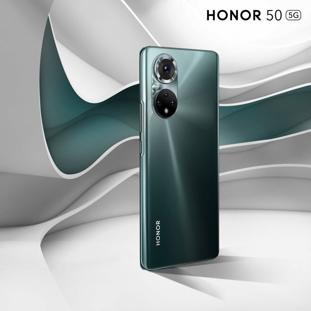 En hommage aux appareils photos argentiques du siècle dernier, le HONOR 50 adopte un design « Dual Ring » composé de deux cercles concentriques au dos, semblables à une paire d’yeux encourageant les utilisateurs à découvrir le monde qui les entoure. S’inspirant de l’esthétique des bagues de joaillerie, le cercle supérieur comportant l’appareil photo principal est poli afin de lui donner un look classique et intemporel.