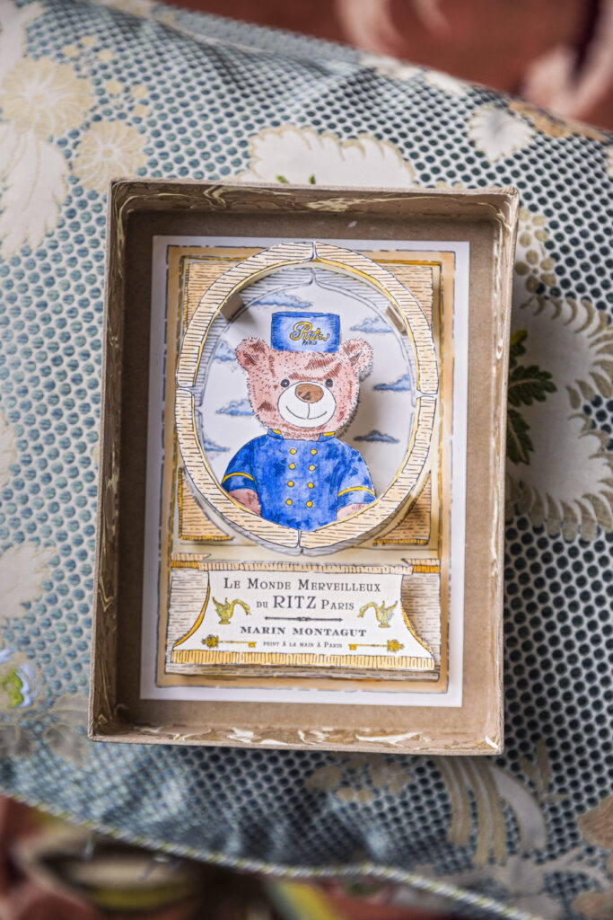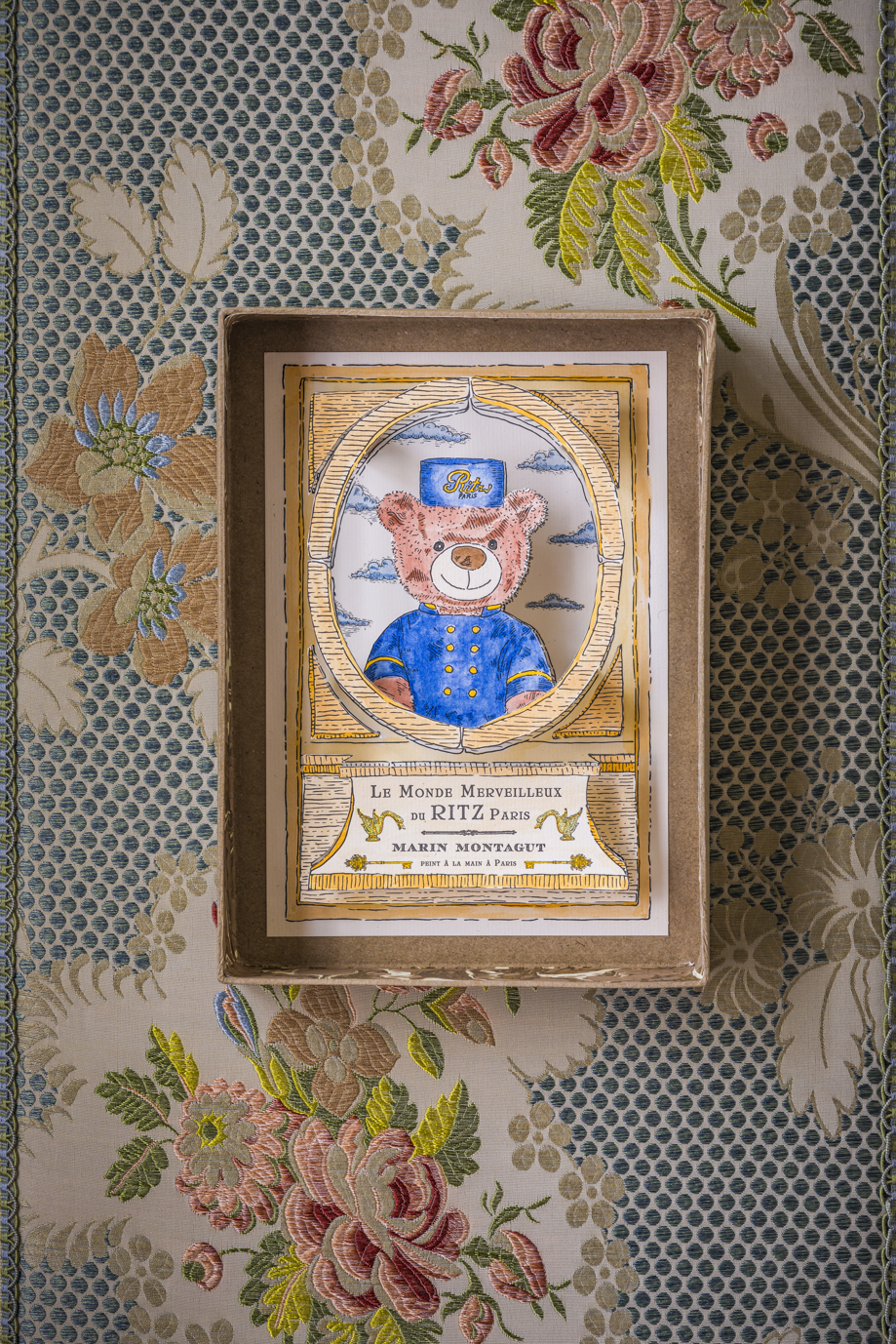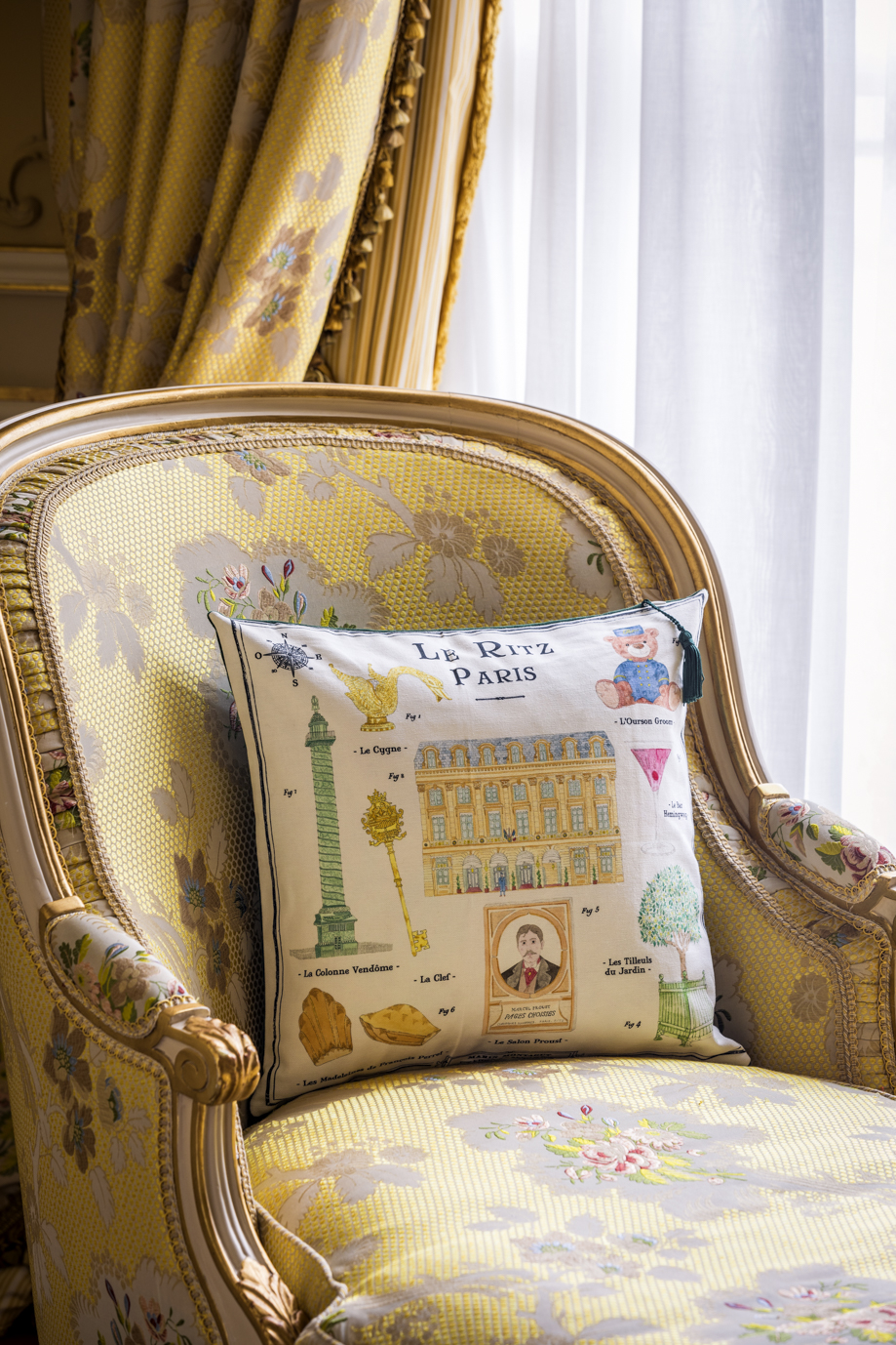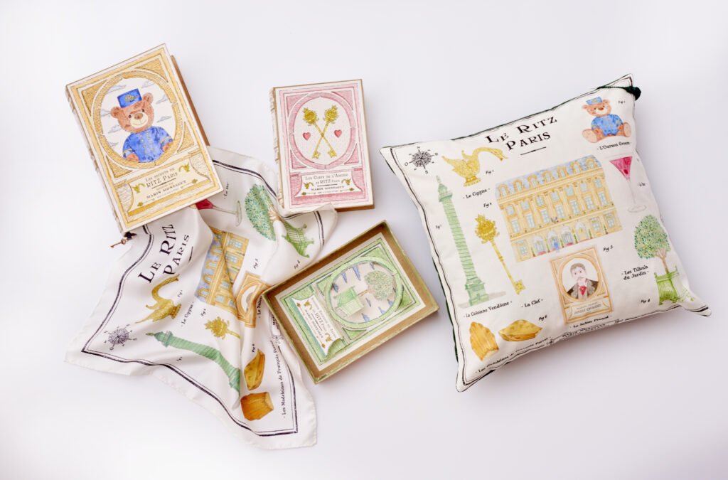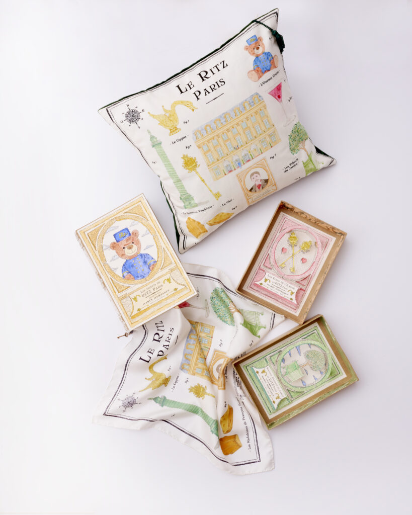 Aussi, un coussin et deux carrés de soie reprennent les éléments emblématiques du Ritz Paris dessinés par Marin : la légendaire façade, l’ourson groom, la colonne Vendôme, les madeleines de François Perret, les tilleuls du jardin…