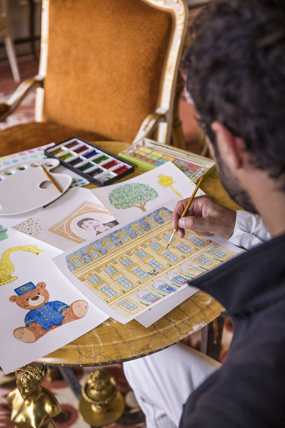 L’envie de Marin Montagut de « croquer » le Ritz Paris de façon inédite témoigne de son amour éternel pour la ville lumière et d’une évidence : la capitale est indissociable de cette adresse emblématique. Avec Natalie Bader Messian, Membre du Conseil d’Administration du Ritz Paris, ils ont imaginé une collection poétique inédite en édition limitée.