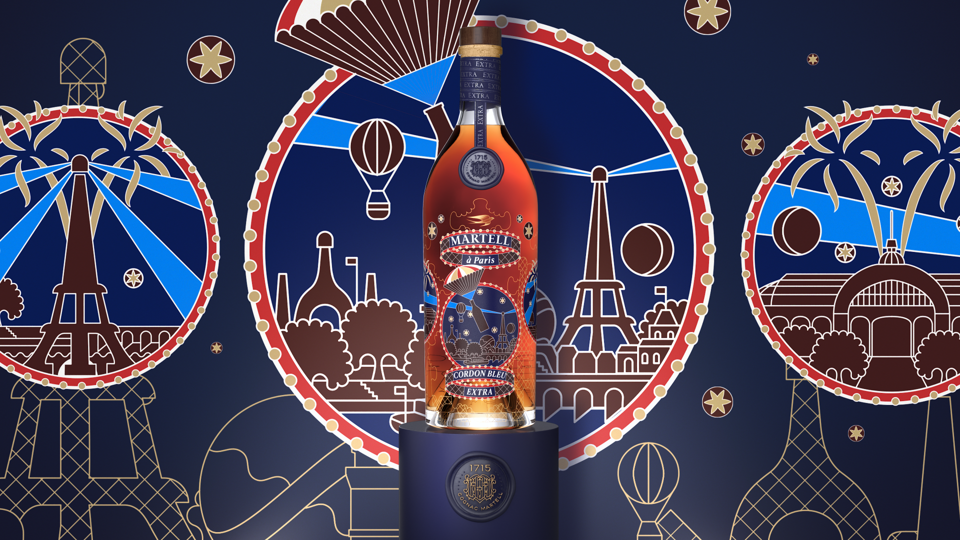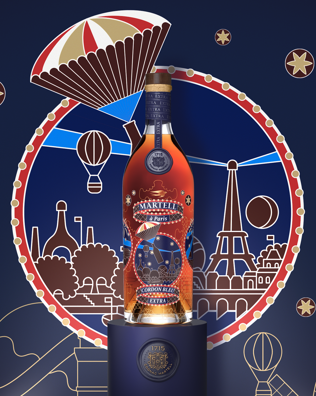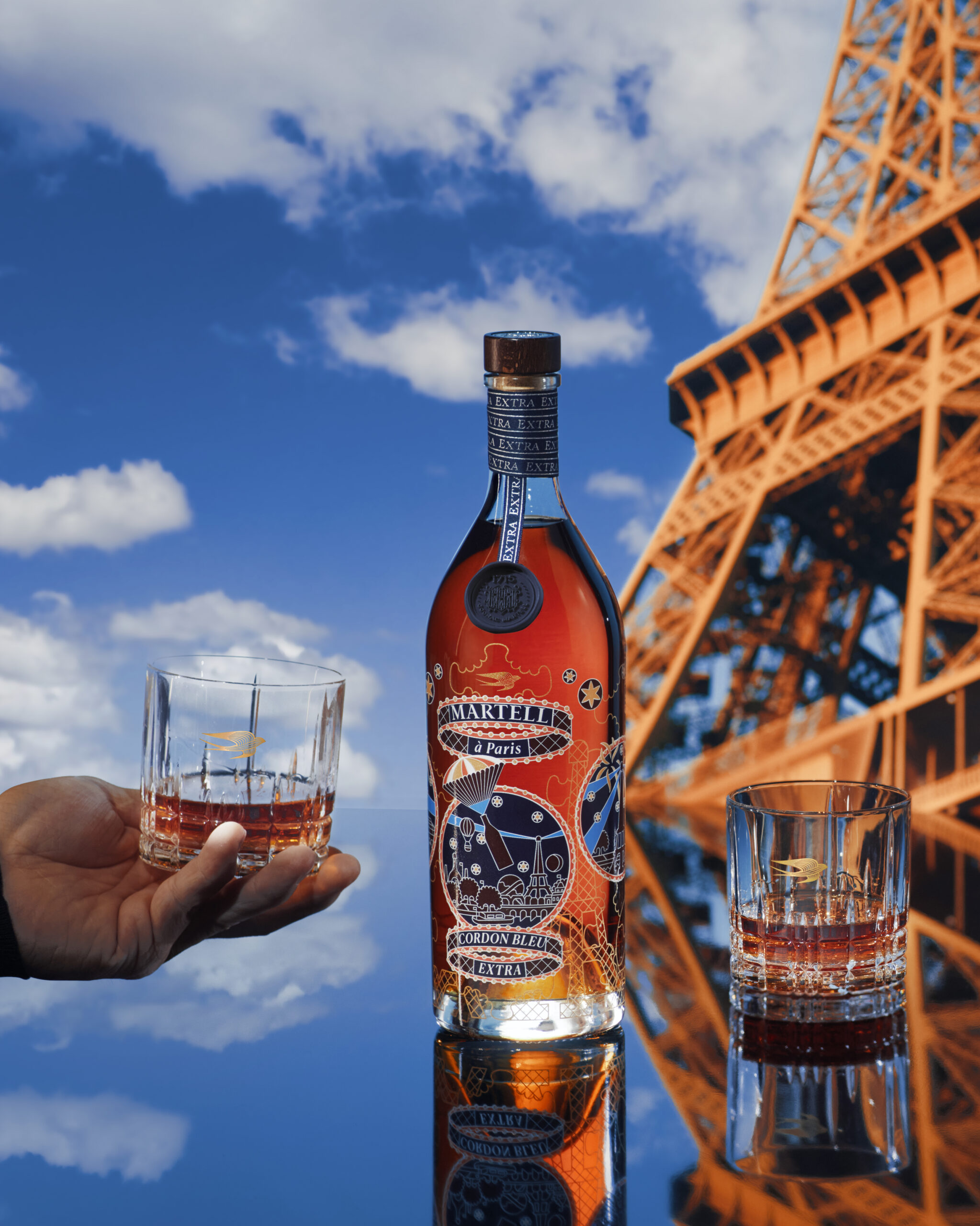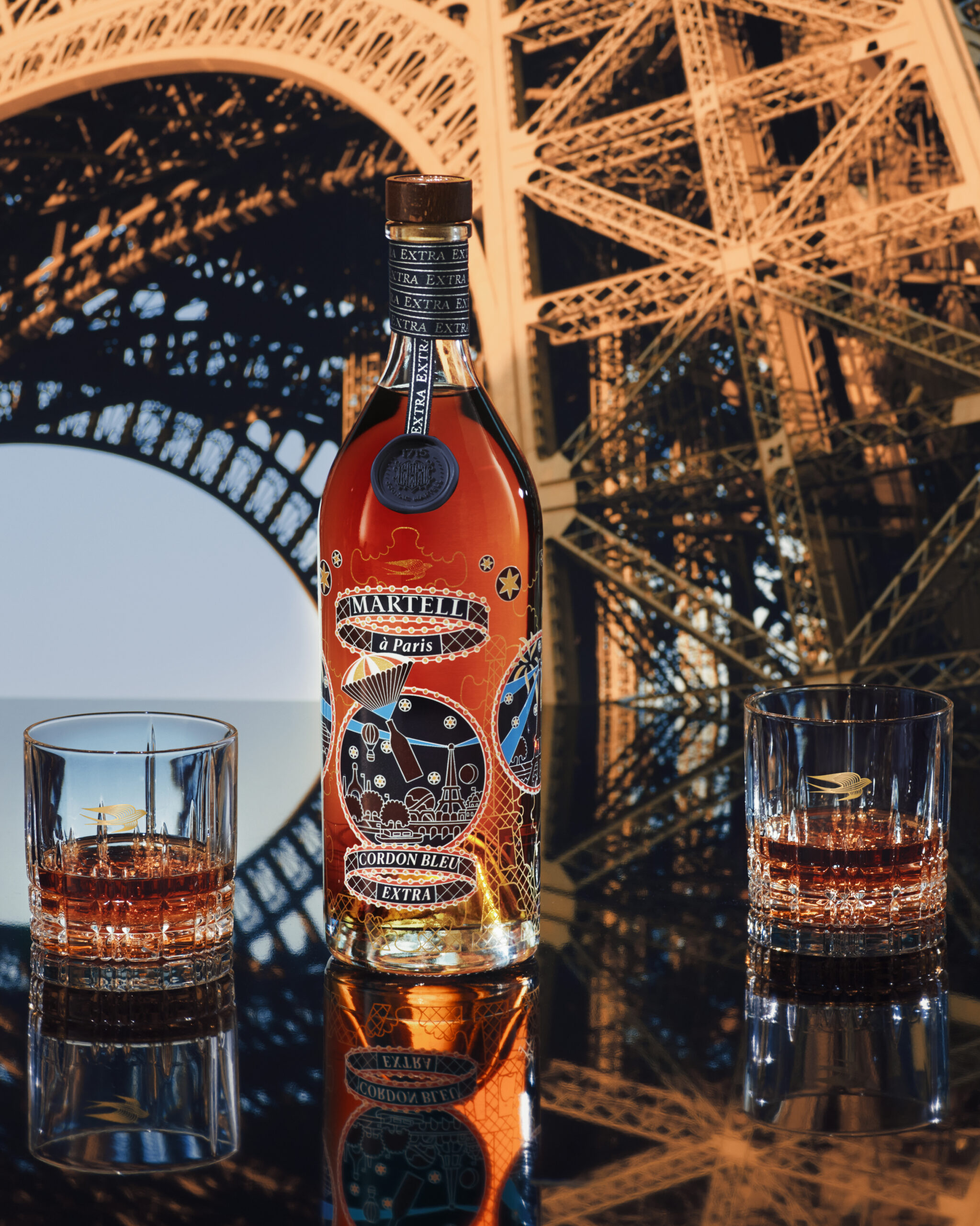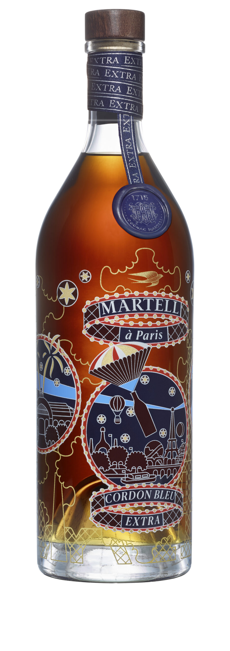 La fresque joyeuse et poétique dessinée par Pierre Marie pour la bouteille et le coffret qui l’abrite – de Martell Cordon Bleu Extra évoque la ferveur populaire qui entoura cet événement historique et l’atmosphère de fête qui régna sur la Ville Lumière pendant sept mois.