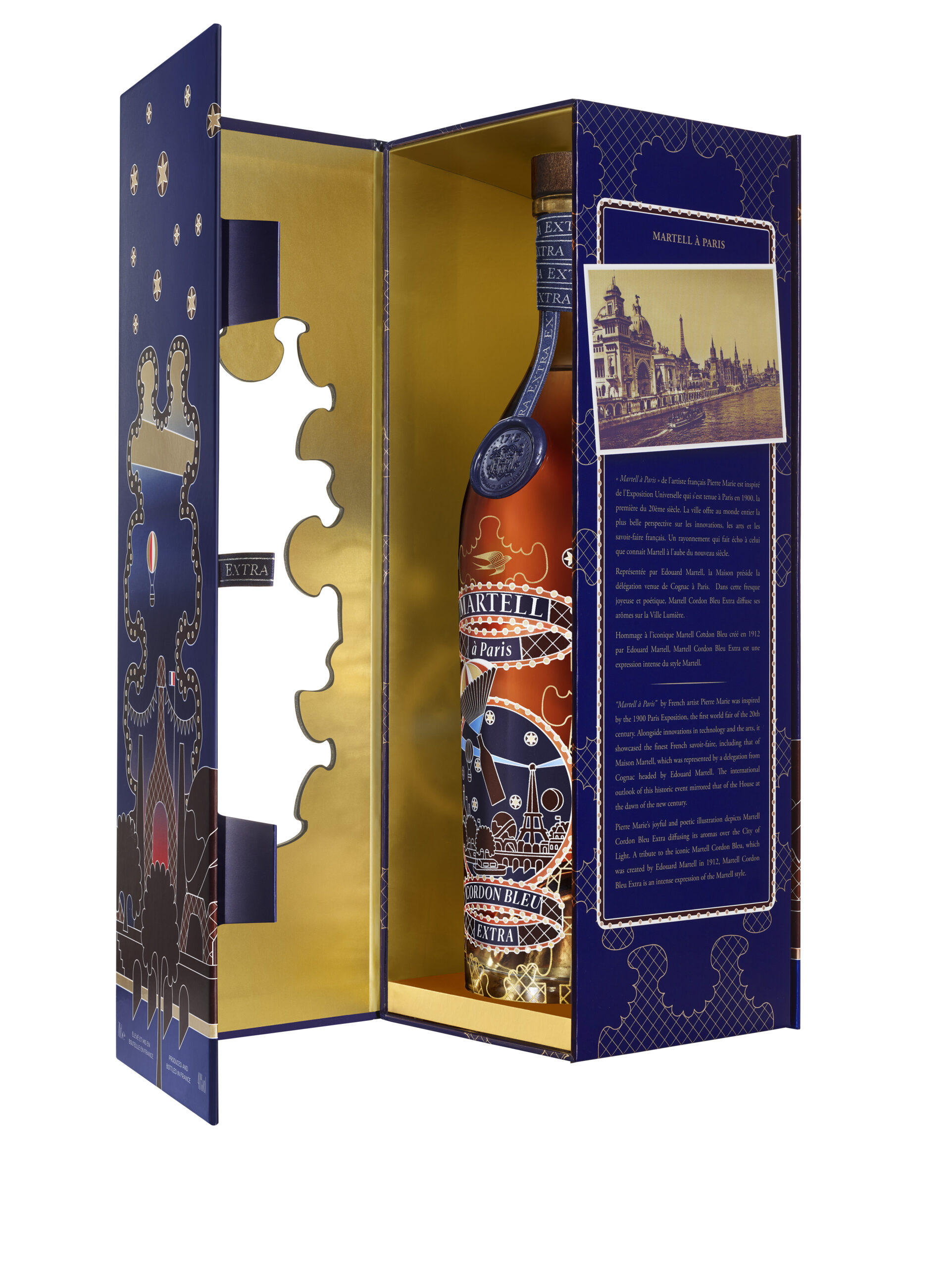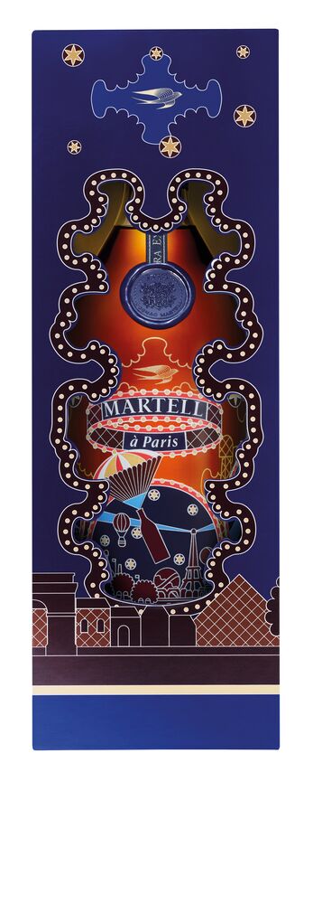 La Maison Martell a fait appel à Pierre-Marie- un artiste français reconnu pour sa capacité à associer les références de techniques artisanales anciennes aux codes de l’art contemporain pour imaginer le décor d’une édition limitée de Martell Cordon Bleu Extra. Ce cognac, qui rend hommage à l’iconique Martell Cordon Bleu créé en 1912 par Edouard Martell, est reconnu comme l’expression aromatique intense du style Martell. L’édition limitée Martell à Paris est inspirée de l’Exposition Universelle qui s’est tenue à Paris en 1900, la première du 20ème siècle. Cet événement permit à la France de faire rayonner son art de vivre et son savoir faire dans le monde entier, à cette période nommée la Belle Epoque ».