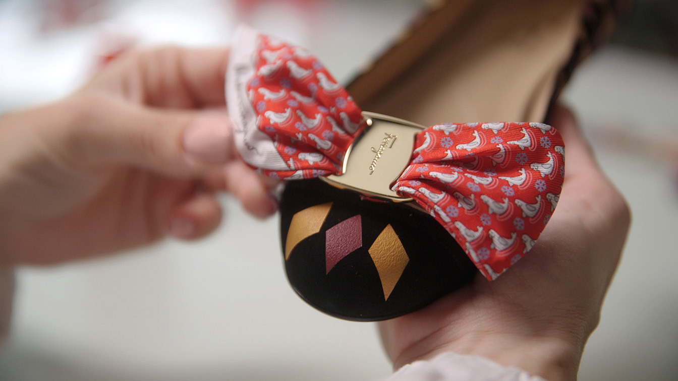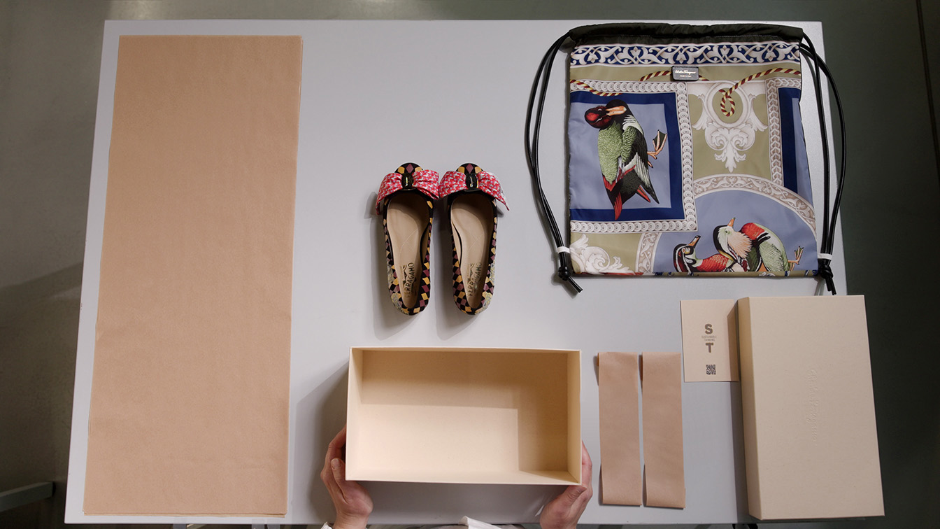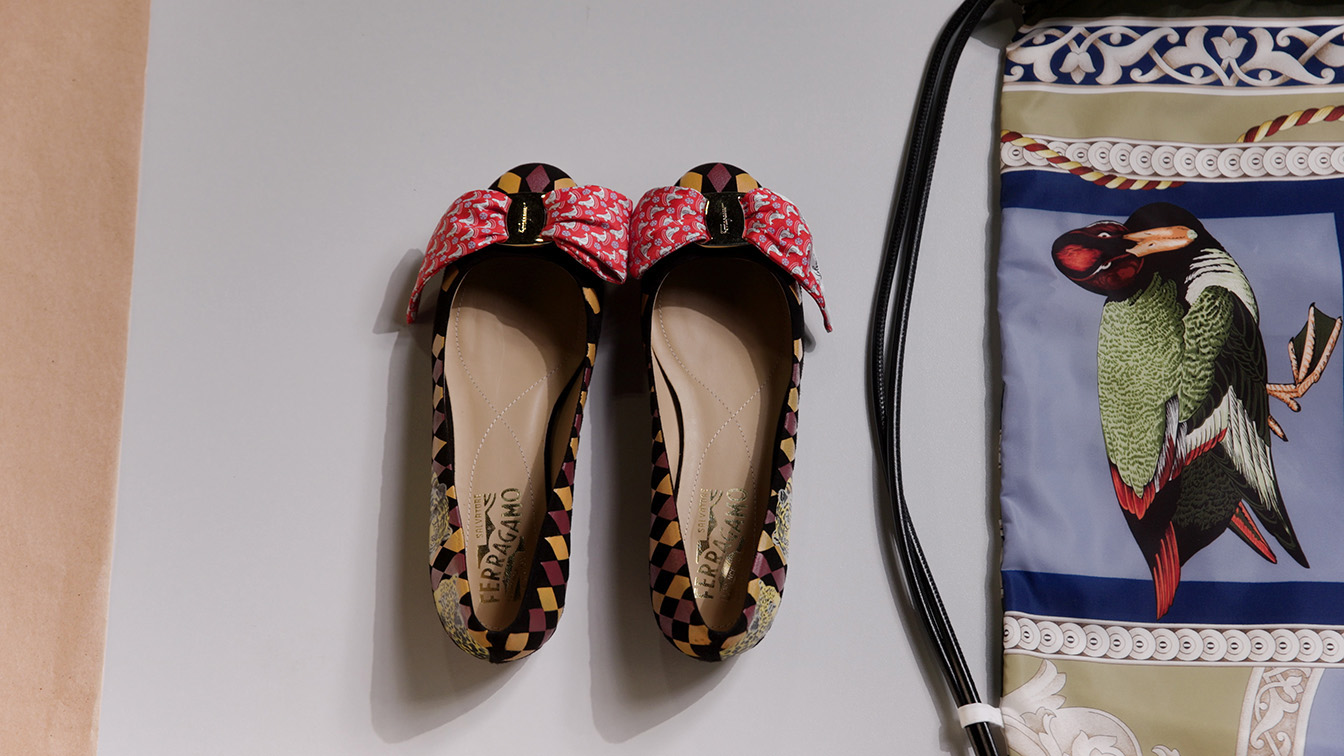 Chaque modèle de cette collection limitée à 300 pièces est unique et comprend, entre autres, des modèles emblématiques de Ferragamo : les escarpins Vara et les ballerines Varina, faits à partir de matières récupérées dans le stock de la Maison. Un sac à cordon recyclé et réutilisable a été conçue pour emballer les accessoires.