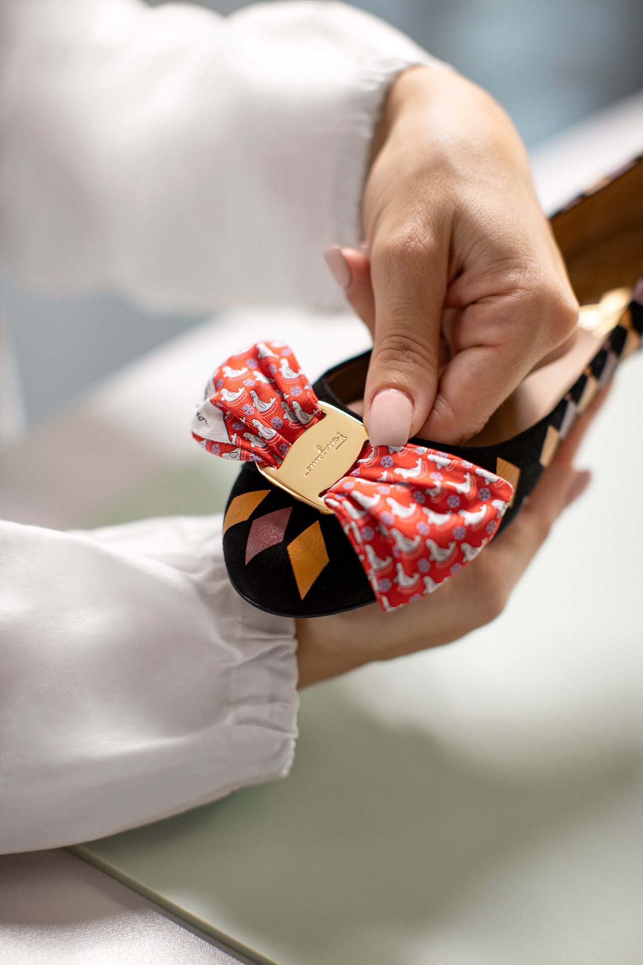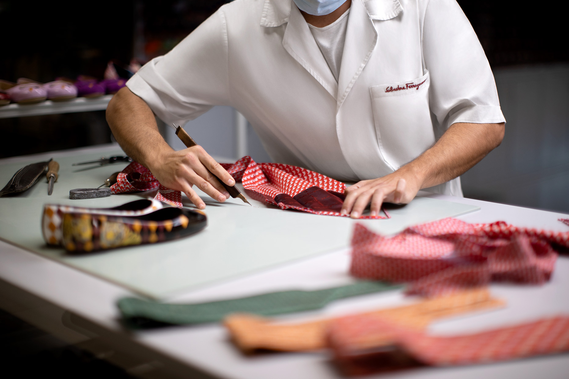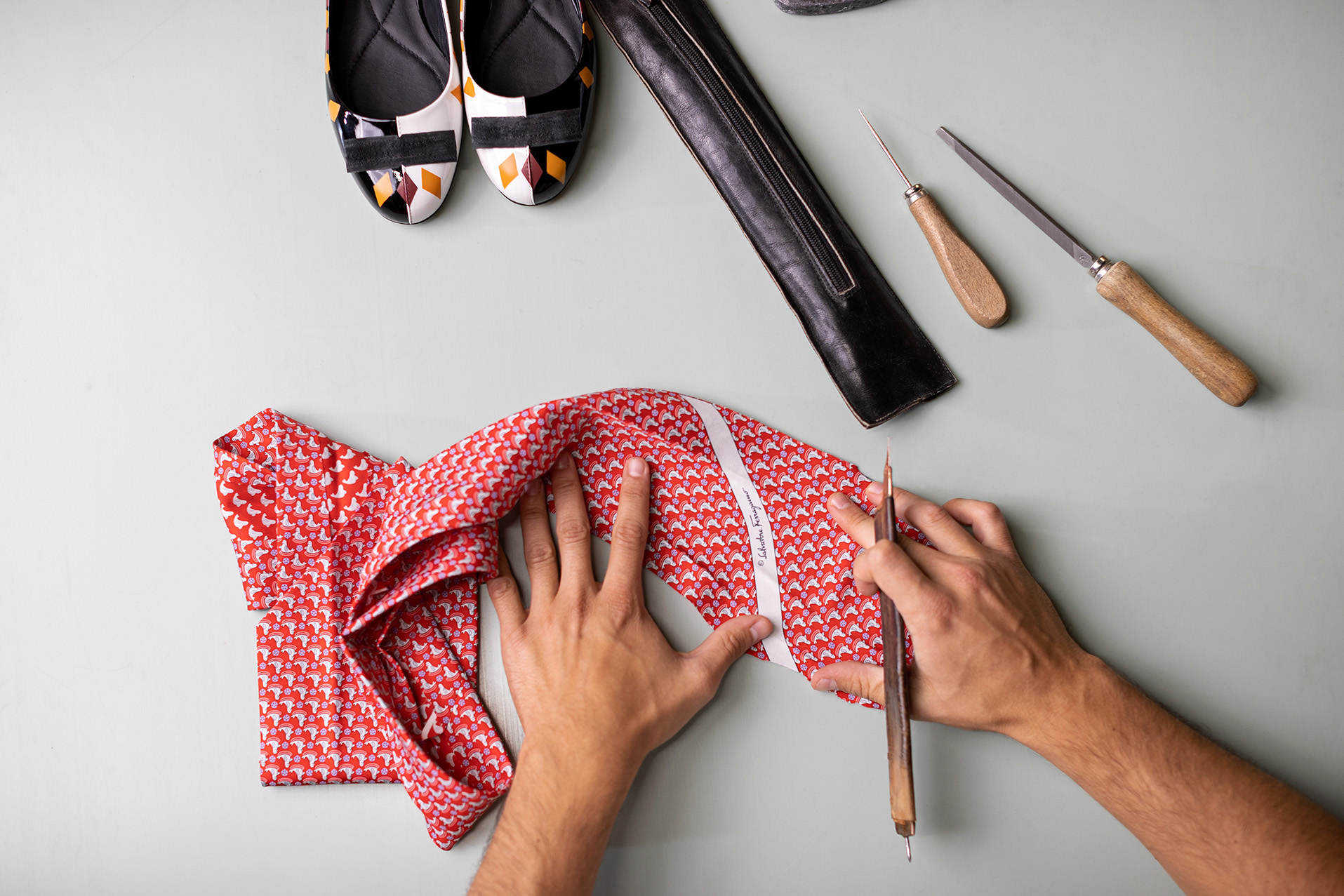 Chaque modèle de cette collection limitée à 300 pièces est unique et comprend, entre autres, des modèles emblématiques de Ferragamo : les escarpins Vara et les ballerines Varina, faits à partir de matières récupérées dans le stock de la Maison. Un sac à cordon recyclé et réutilisable a été conçue pour emballer les accessoires.