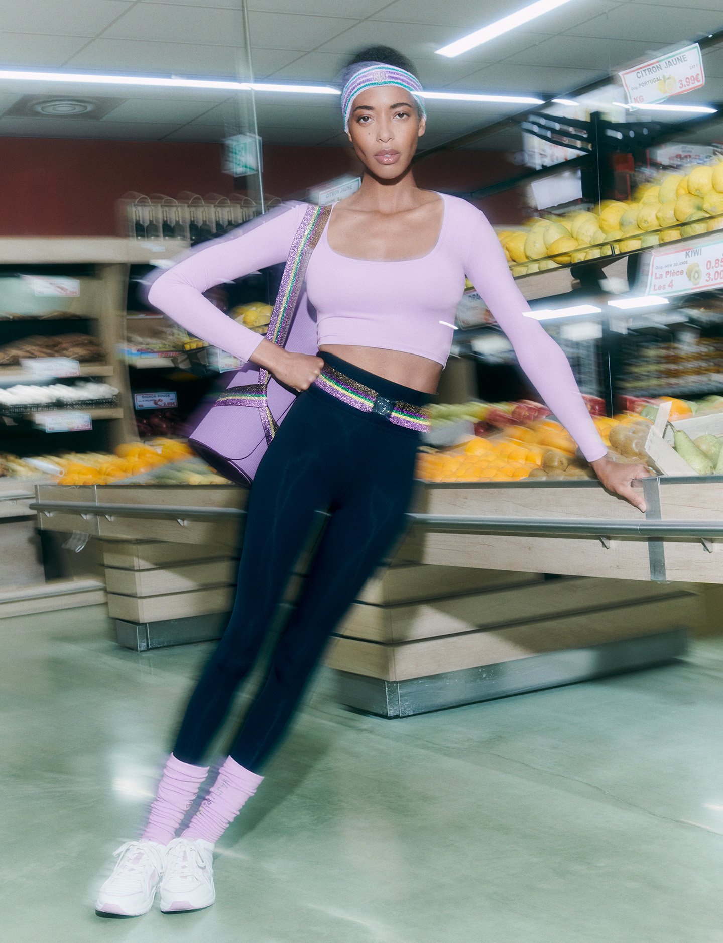 Toute la capsule se construit autour de pièces empruntées au vestiaire fitness. Les looks flirtent avec l’esprit de l’époque. Headbands, fitness socks et leggings s’imaginent en salle de sport comme en ville, sous une veste de tailleur ou ailleurs. Les brassières et les tops reprennent les codes de Maje en utilisant les matières techniques et le savoir-faire de Varley.