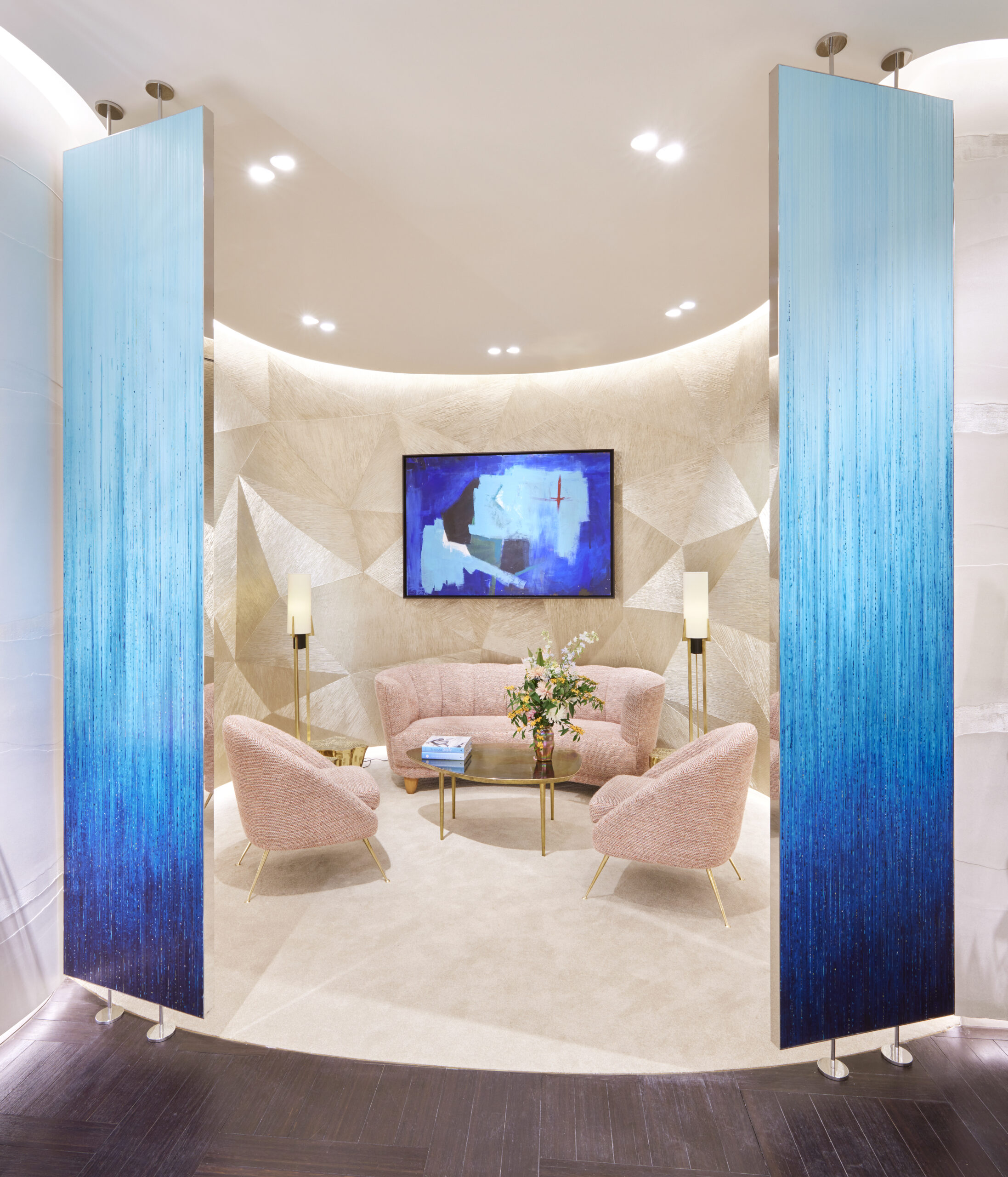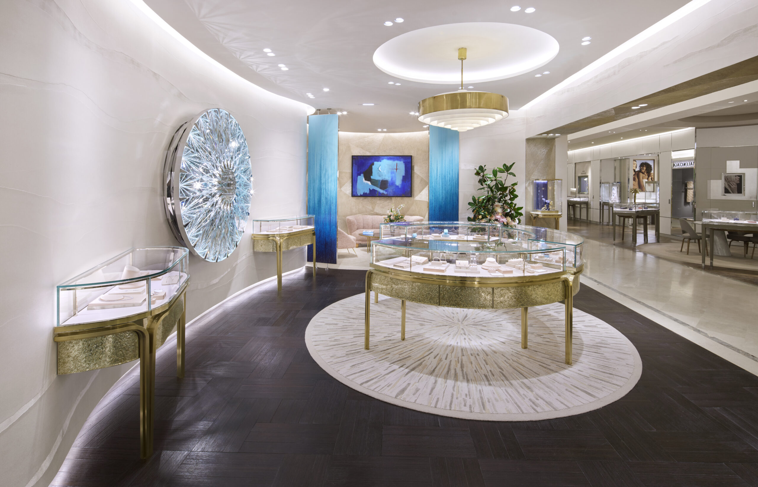 L’univers enchanteur de Tiffany & Co s’exprime avec raffinement dans ce nouvel écrin chaleureux et féminin grâce à l’omniprésence de courbes douces des nuages irisés flottent sur des murs curvilignes aux enduits nacrés. Comme un appel à la rêverie, ces nuages, tout en adressant un clin d’œil discret à la verticalité majestueuse de gratte-ciels qui percent l’azur new-yorkais, contribuent à créer une atmosphère intime, apaisante et chaleureuse