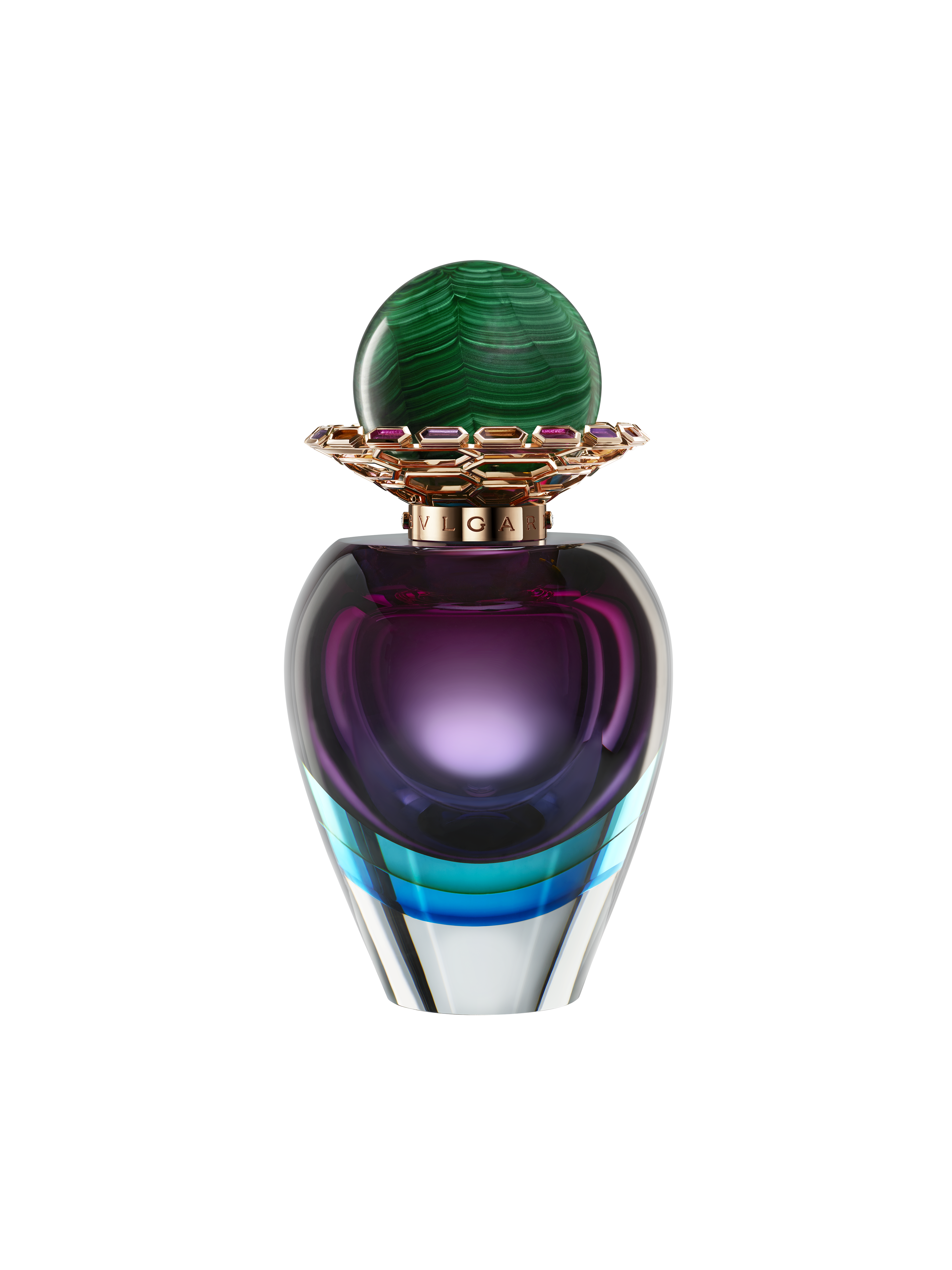 Cet arc-en-ciel de pierres précieuses est surmonté d’une spectaculaire malachite sphérique, lisse et voluptueuse de 2,485 carats, qui rappelle la taille cabochon signature de Bvlgari. Sublime touche finale de cette pièce luxueuse, le logo BVLGARI gravé sur le col du flacon est bordé de chaque côté par un diamant taille brillant. Une association de gemmes vibrantes, sélectionnées et assorties avec audace et exubérance : la création joaillière de Bvlgari repose une fois de plus sur une superposition de couleurs saisissantes et sur la capacité de la Maison à relever de nouveaux défis toujours plus ambitieux.