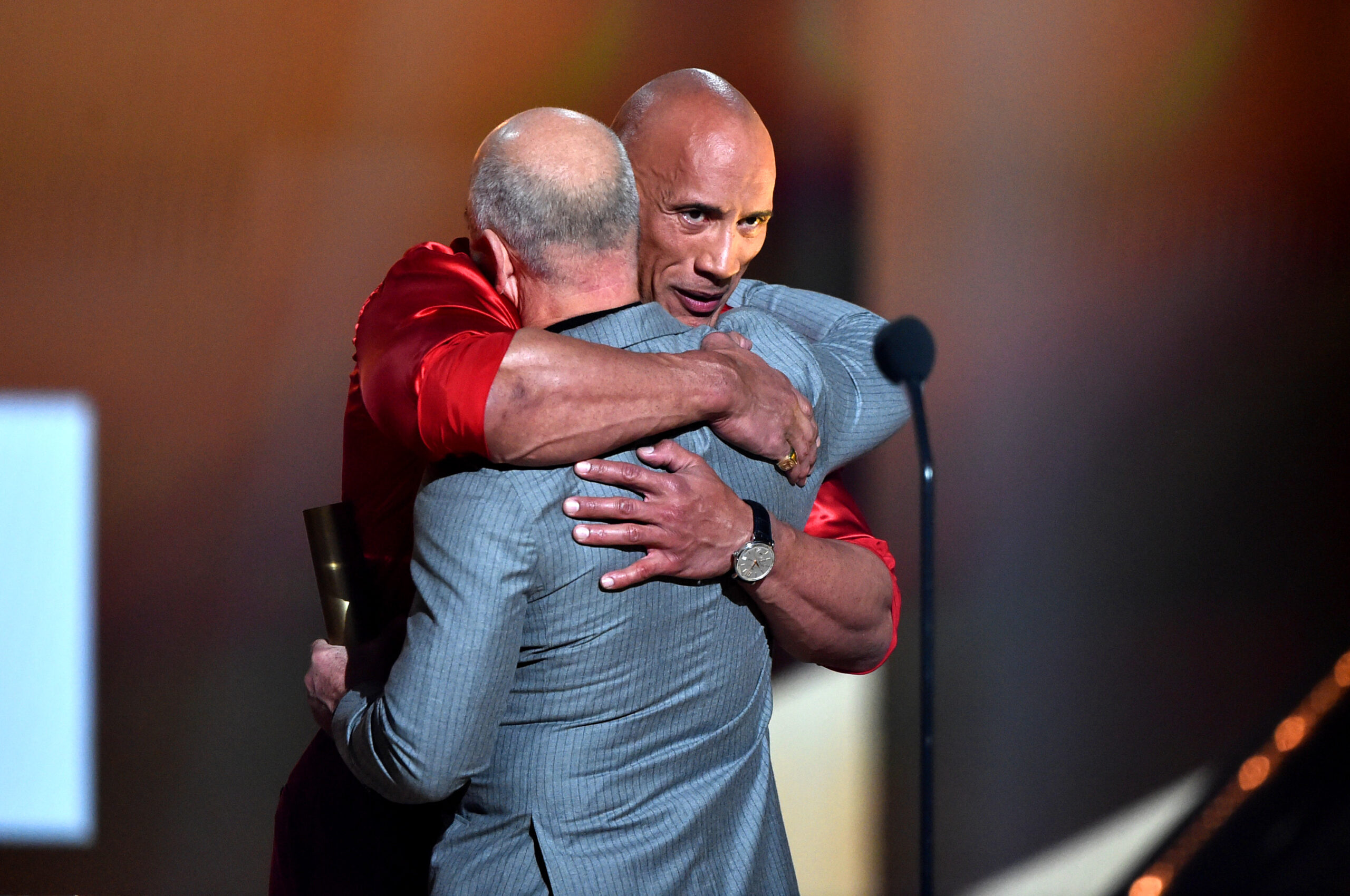 - SANTA MONICA, CALIFORNIA – DECEMBER 07: 2021 PEOPLE’S CHOICE AWARDS — Pictured: (l-r) Honoree Dwayne Johnson accepts The People’s Champion of 2021 award from Jeff Bezos on stage during the 2021 People’s Choice Awards held at Barker Hangar on December 7, 2021 in Santa Monica, California. (Photo by Christopher Polk/E! Entertainment/NBCUniversal/NBCU Photo Bank via Getty Images)
