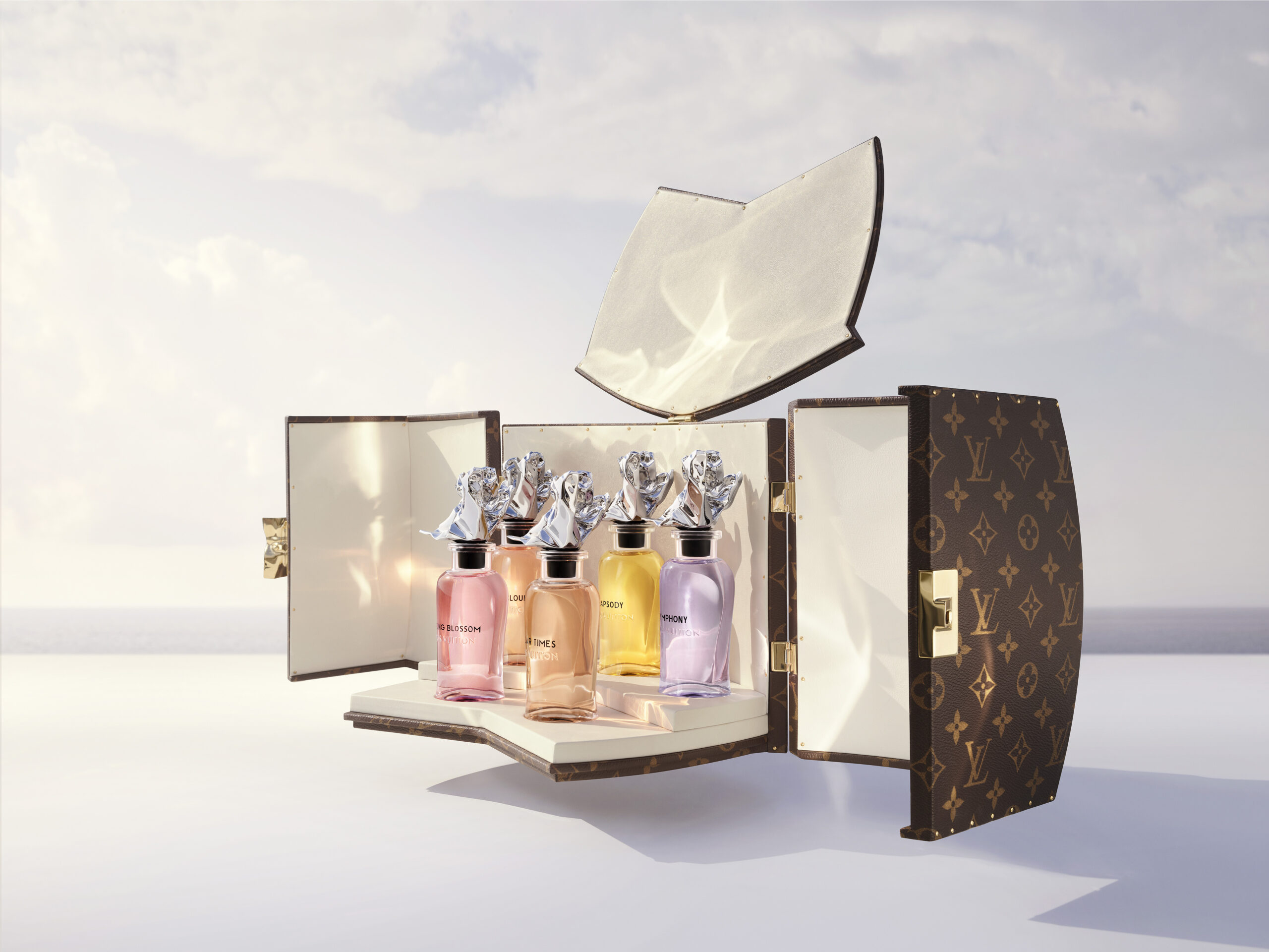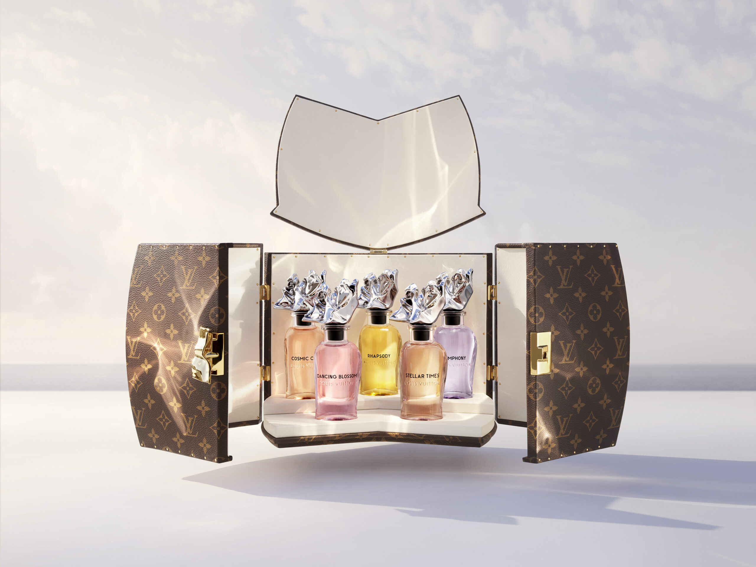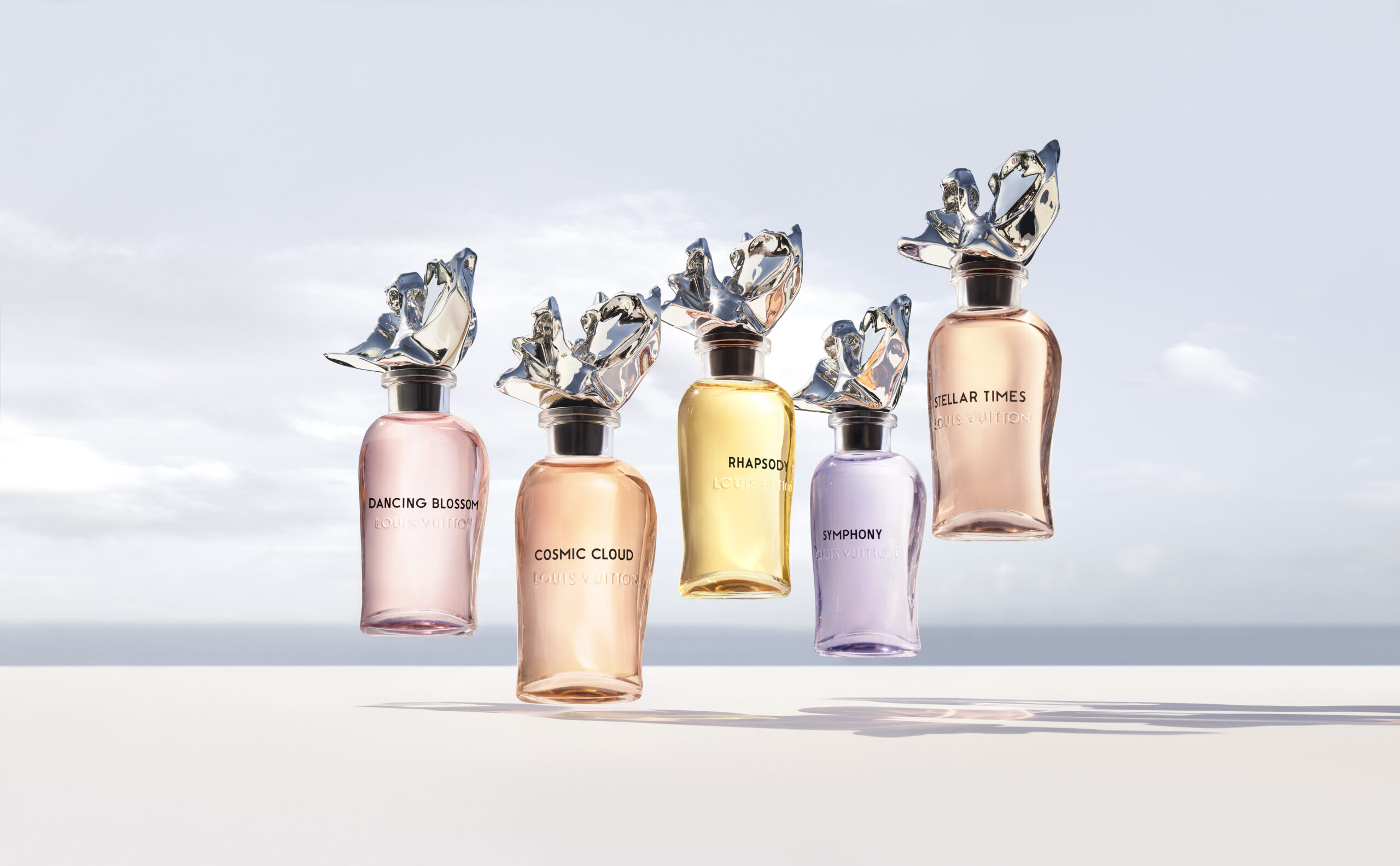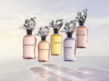 « J’ai eu envie de reprendre les grandes familles du parfum. De les tordre, les étirer, pour en exagérer certaines facettes, révéler une pureté. En revisitant des chapitres, des floraux, des chypres, des ambres, on crée des mouvements, des formes arrondies, caressantes, à chaque fois. J’ai voulu imaginer une fraîcheur qui dure. Et une sensualité qui ne pèse pas. » Cinq parfums sans note de tête, de cœur, de fond, mais pareils à des colonnes olfactives, étirées, arrondies par la houle. La ligne, la lumière, le mouvement se fondent en une sensation pure. Classique et hors du temps. Voici l’esprit d’un mouvement pur, ondoyant dans l’atmosphère, tel un nageur fendant l’écume. Ce rythme céleste que Jacques Cavallier Belletrud, Maître Parfumeur de Louis Vuitton, exalte à travers la palette olfactive d’une collection de cinq extraits.