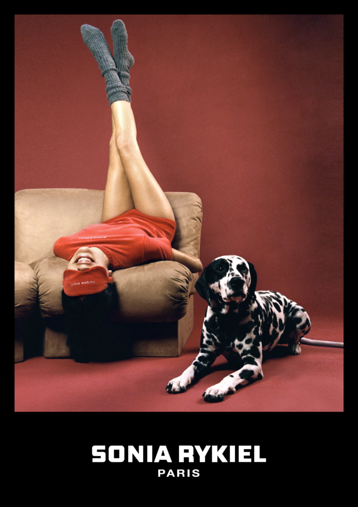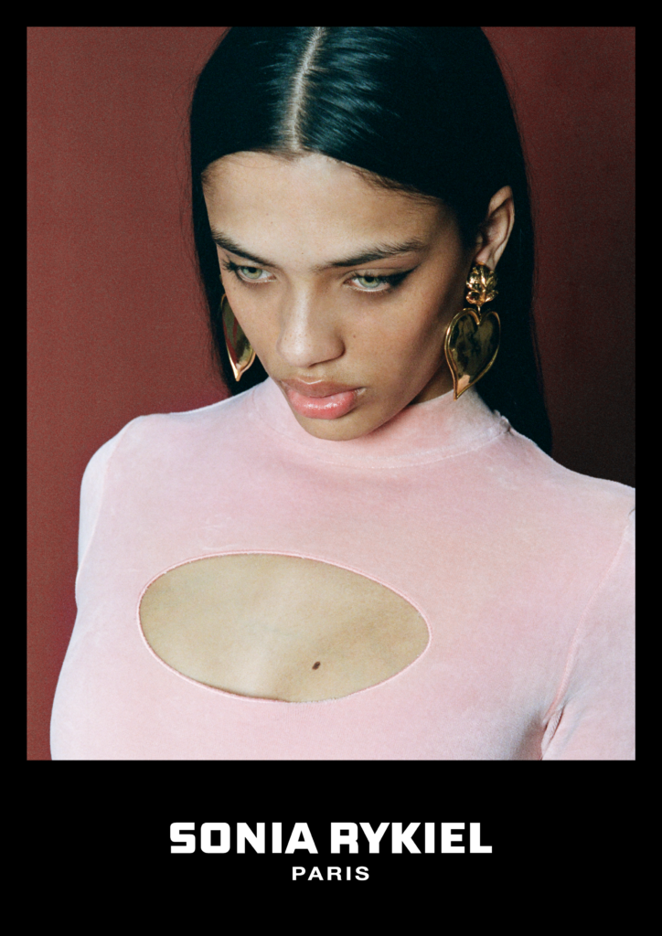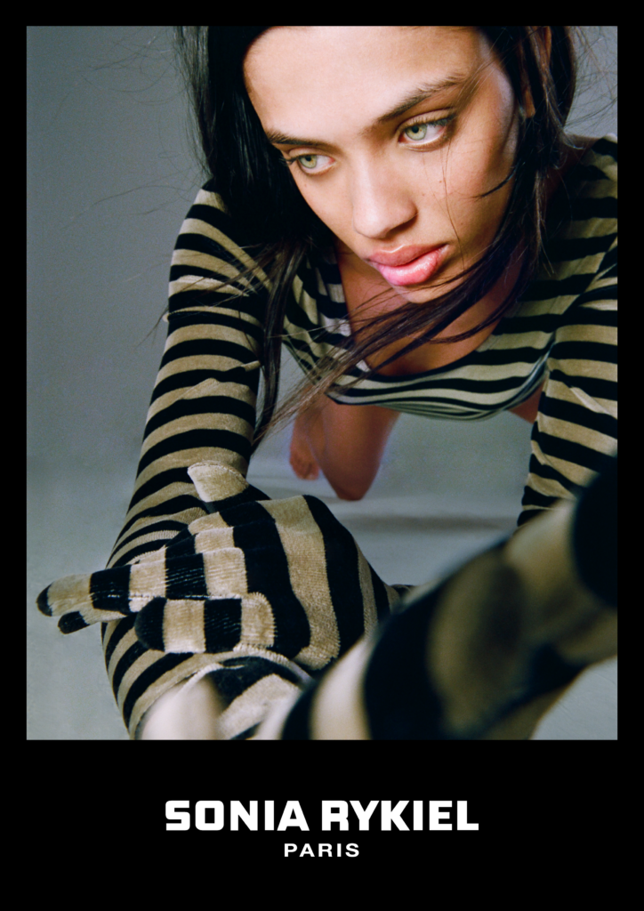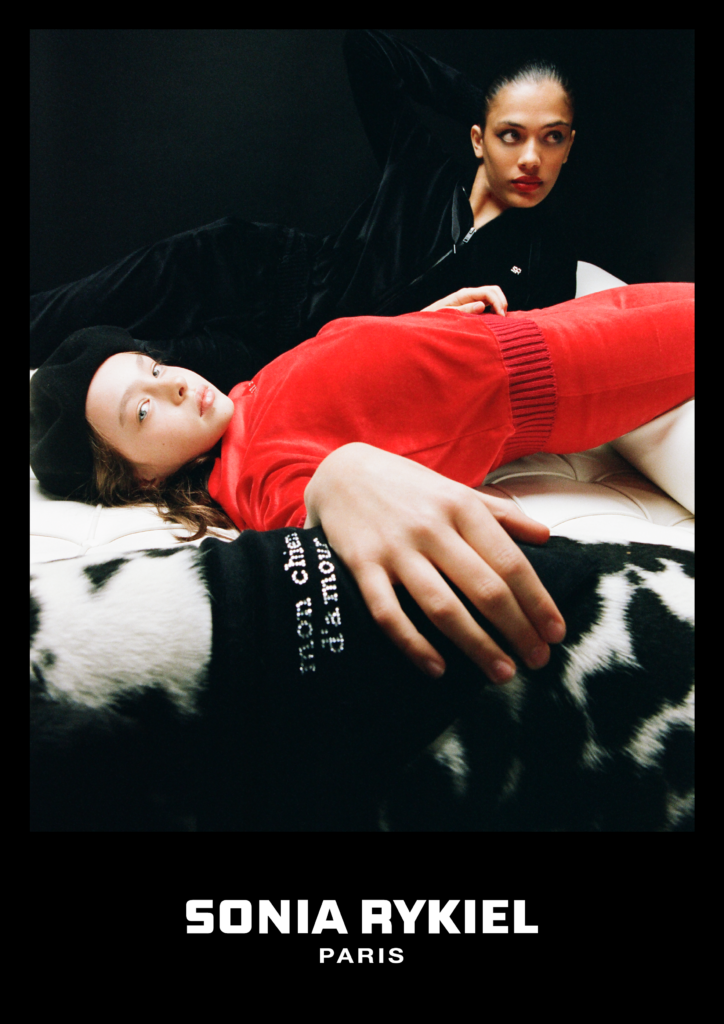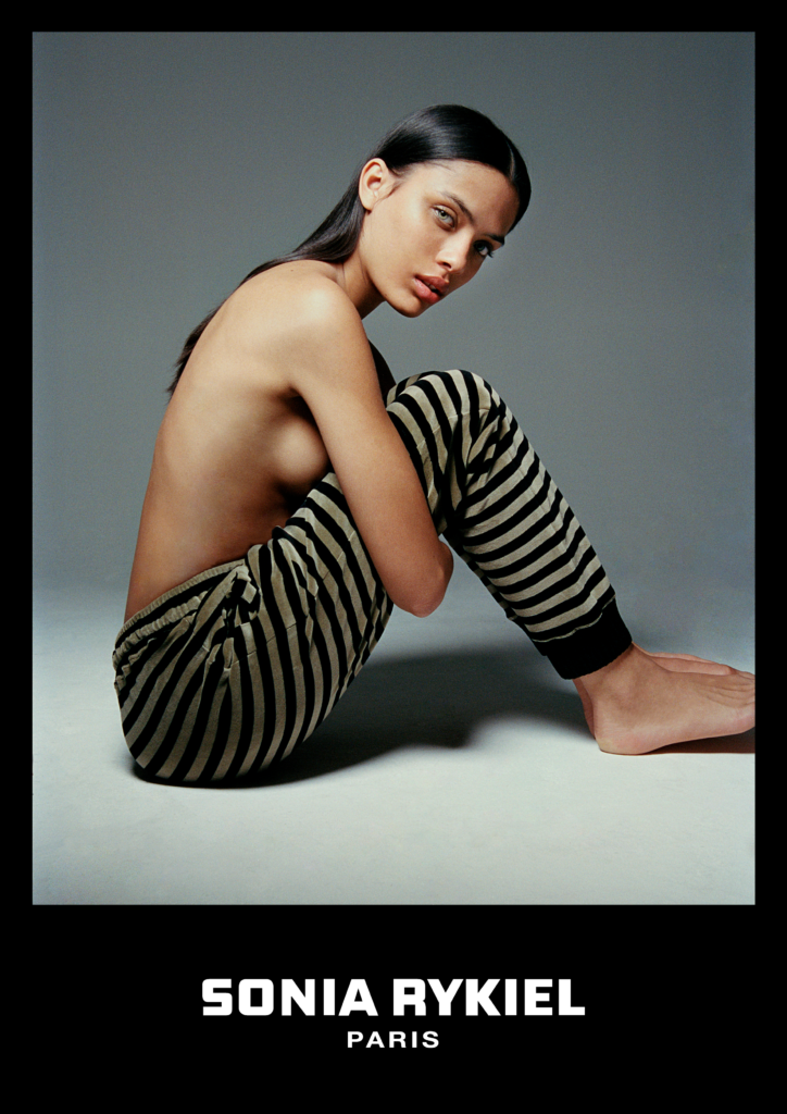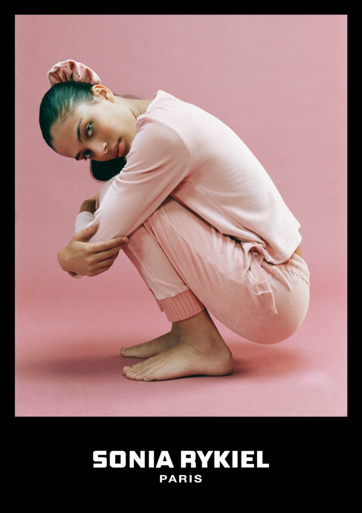 Inspirée par les années 70 qui ont vu naître la maison Sonia Rykiel, cette capsule est l’occasion de revisiter les codes de la marque au travers de coupes contemporaines. En effet, la collection joue avec les volumes en faisant cohabiter ensemble de jogging, pull crewneck et pantalon flare avec des pièces plus près du corps, telles qu’un body avec gants intégrés ou un top à goutte.