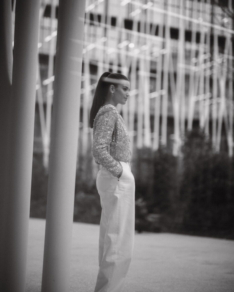 Alma Jodorowsky, ambassadrice Chanel, portait des créoles « coco crush » en or jaune et or blanc 18K et une bague « coco crush » en or jaune et or blanc 18K. CHANEL Joaillerie.