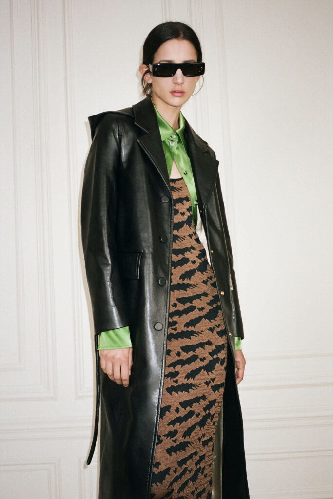 Continuing Nanushka’s long-standing play with juxtaposition, inspired by Sandor’s upbringing in Budapest – a city built on the discourse between east and west – this season celebrates harmony. Contemporary materials meet traditional hand-craft technique, silhouettes are relaxed and comfortable but cut with sharp lines that project statement elegance. Crafty merrow stitching distinguishes signature vegan leather separates. Tubular tie details are used to create draping on slip satin silhouettes. Cut-out shapes, intricate embroidery and upcycled organic cotton patchwork are inspired by traditional Hungarian tablecloths, reworked with refined modernity.