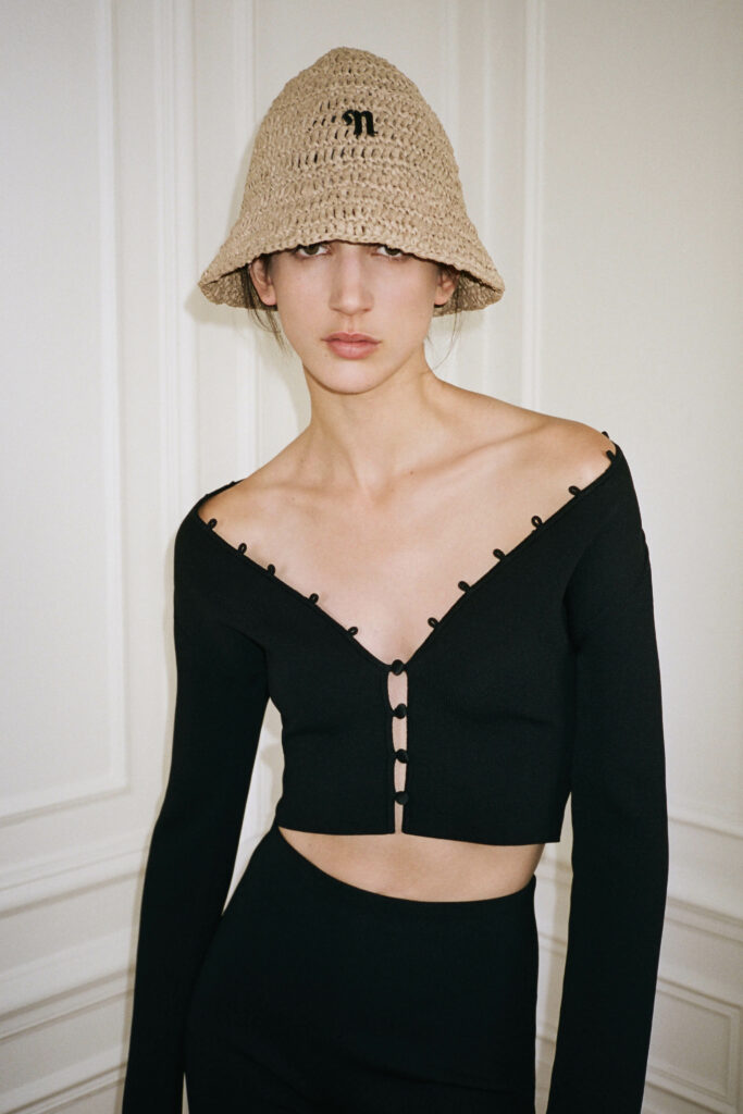 Accessories strengthen the balance of energy for Spring/Summer 2022, creating elevated focal points that are styled into multiple looks. Eggshell and khaki origami-inspired folding box bags in Vegan leather with crochet seam detailing, slouchy sustainable suede hobo bags and hand-crocheted basket bags made from reclaimed off-cuts elaborate on conscious creativity.
