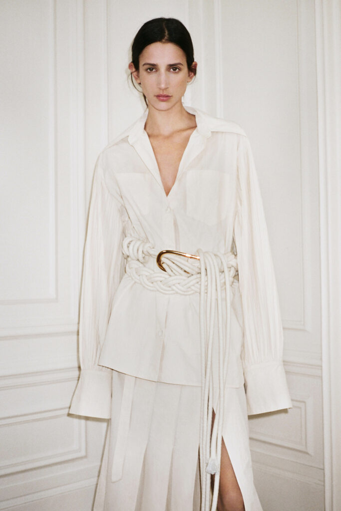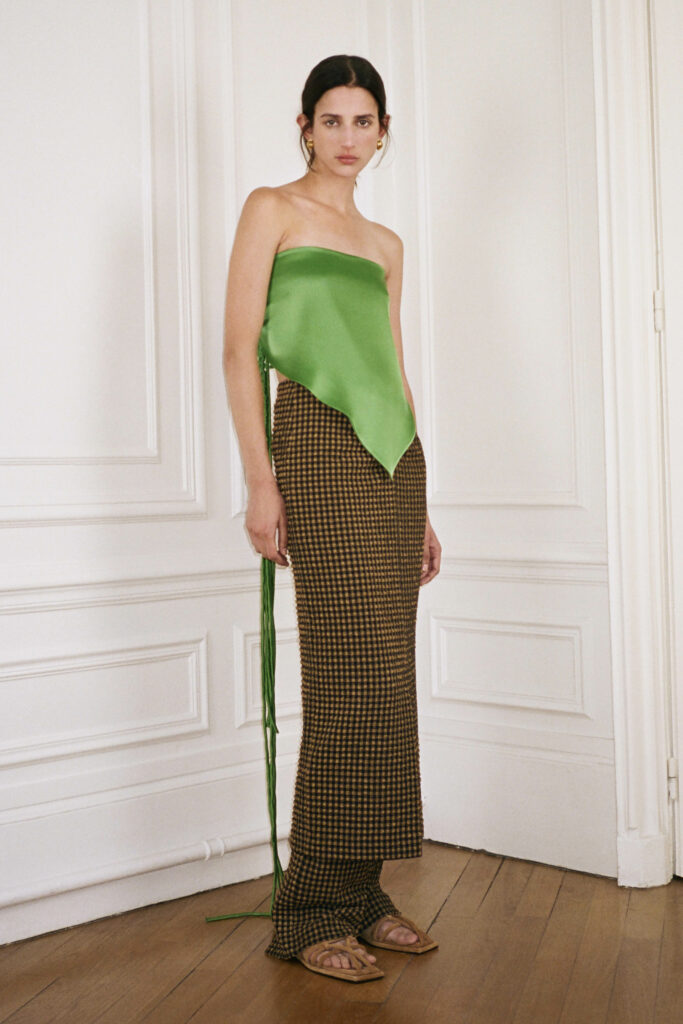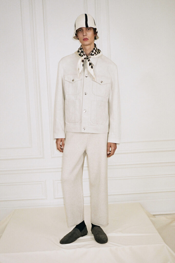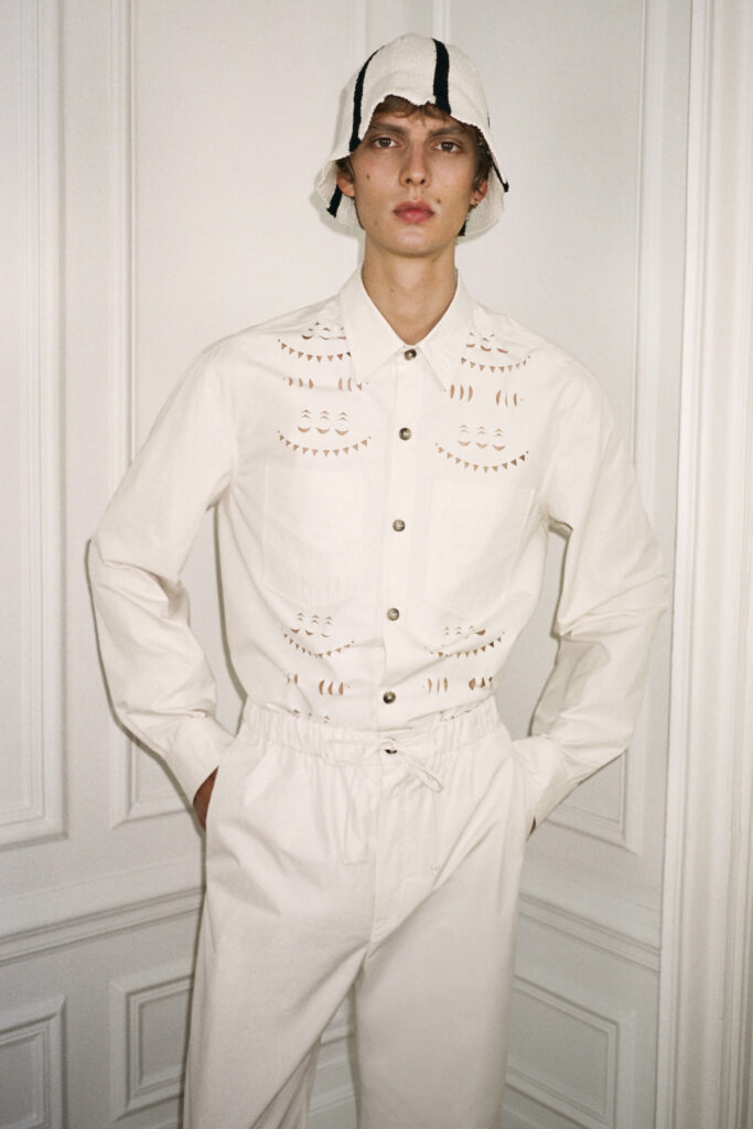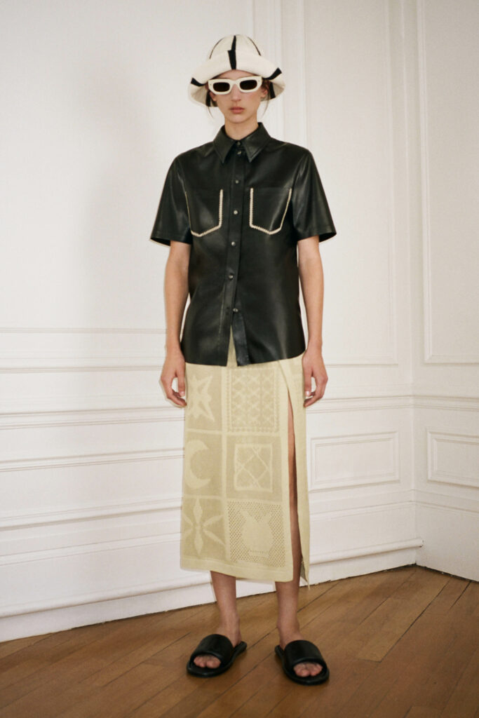 Shape continues to explore the narrative, with fitted tops and dresses layered over voluminous, floor-pooling pants and boxy tailored blazers paired with kick-flare suit trousers. Skirts, pants and shirts are imagined in lightly textured seersucker and tweed that communicate alongside structured regenerated leather. Crochet features throughout, for a homely but luxurious feeling, while pleats are made using heavy poplin.
