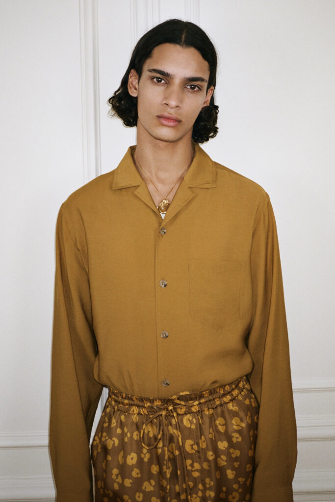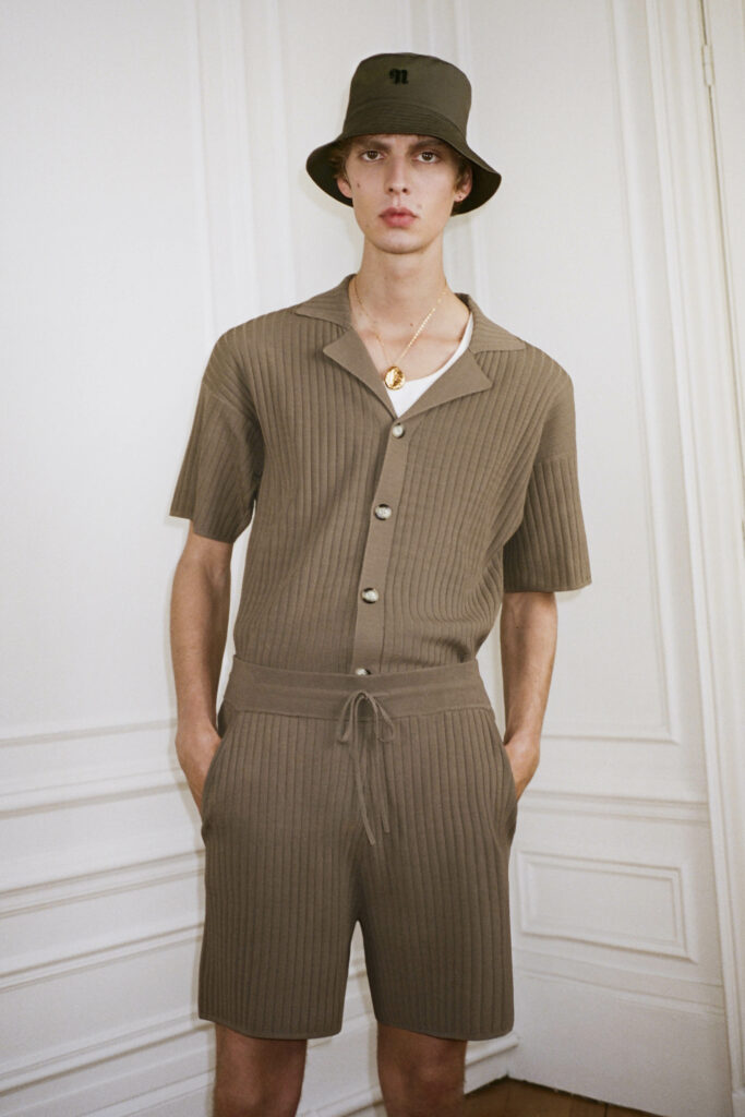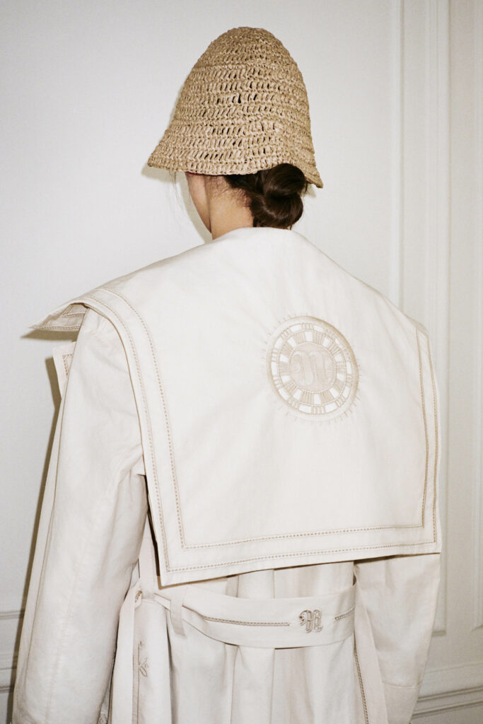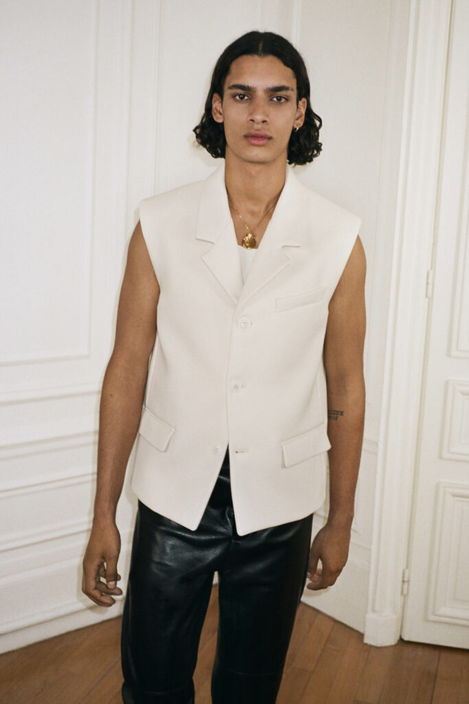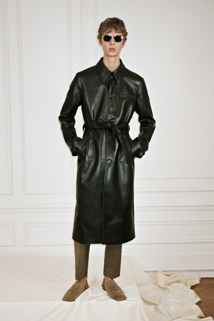 Shape continues to explore the narrative, with fitted tops and dresses layered over voluminous, floor-pooling pants and boxy tailored blazers paired with kick-flare suit trousers. Skirts, pants and shirts are imagined in lightly textured seersucker and tweed that communicate alongside structured regenerated leather. Crochet features throughout, for a homely but luxurious feeling, while pleats are made using heavy poplin.