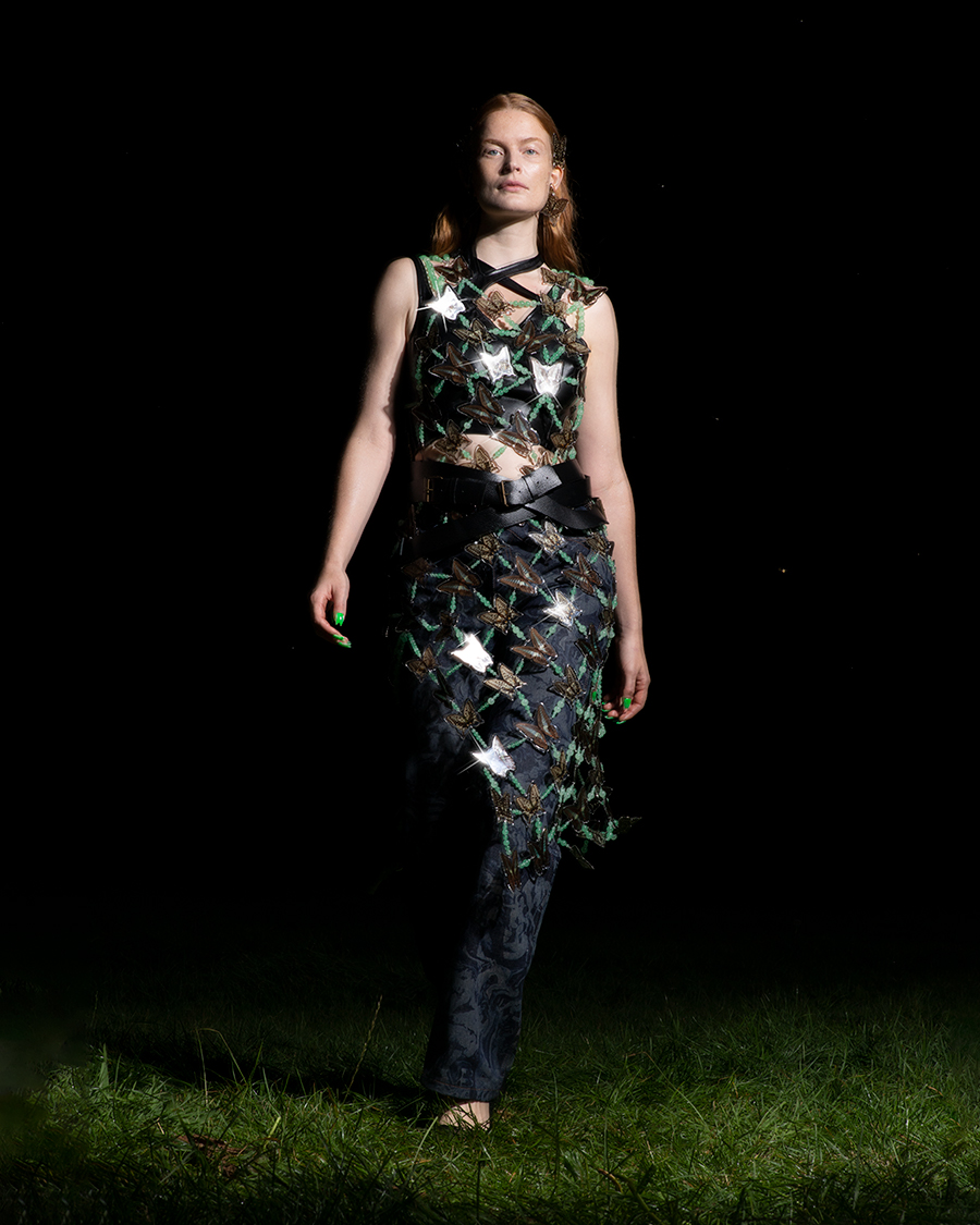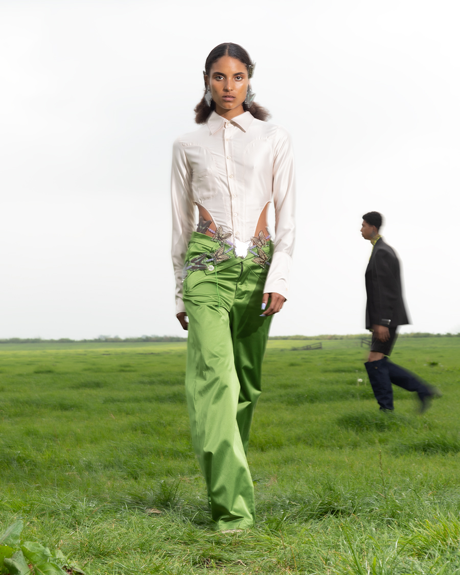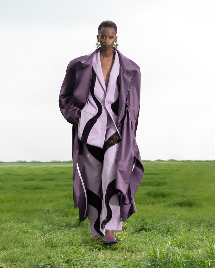 The neutral colours of the collection, applied in leather and satin, are accompanied by a luscious green and a contrasting purple in laces and silky fabrics, as well as goopy prints revealing compositions of sexual indulgences. The collection’s audiovisual piece is inspired by the Swedish midsummer, in which the phallic maypole is stuck in the ground to fertilise the dirt. The film is shot in a lush grass field, with models walking in a choreography that mimics the seasonal ritual. In the background plays Cherry Bomb by The Runaways. The fruit often refers to a person’s ‘virginity’. The punk-rock tune reinterprets the cherry and claims it as a symbol of lust and rock. Ninamounah takes a holistic approach to the social construct that is virginity.