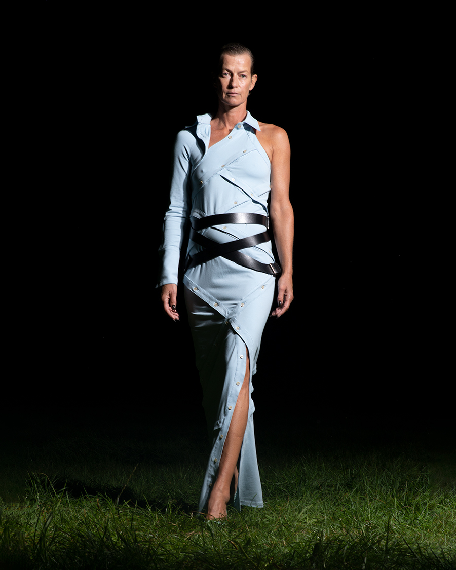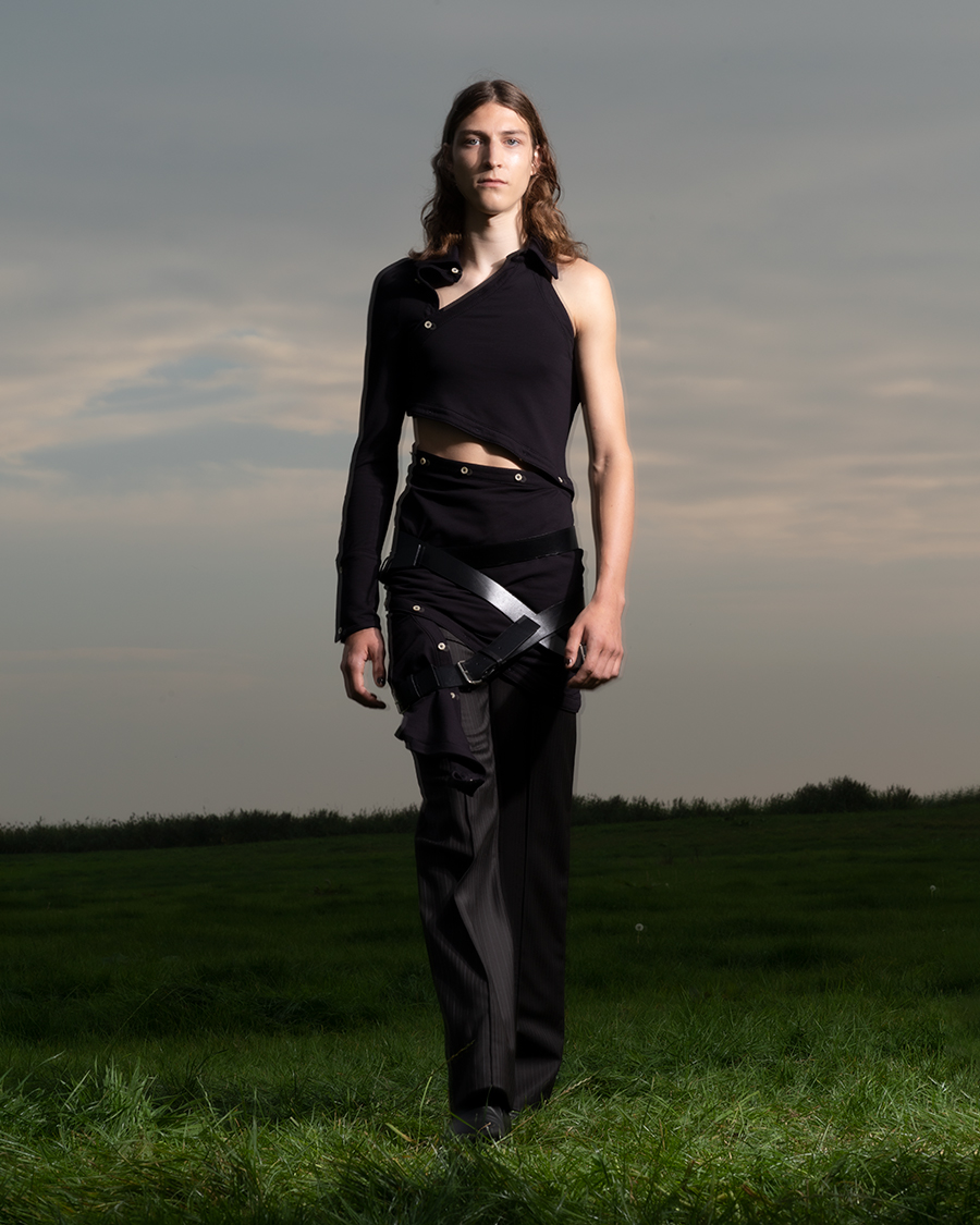 Following this very natural sensuality defined by the designer, other pieces drape and wrap fabrics to fabricate voluptuous impressions resulting in a compelling and appealing visual narrative. Silk garments envelope the waist and strapped tops hold onto the neck and shoulders, featuring swirling slithery lines that take on a feminine spatiality. Tension is created between the flowing garments and the structurality given by leather belts wrapped around hips and limbs.
