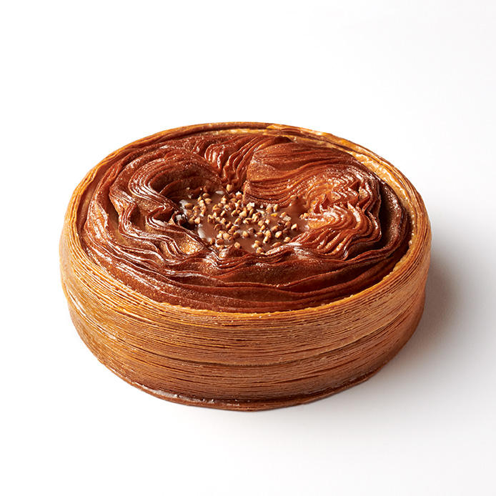 Véritable invitation à la découverte, cette galette est une ascension gustative. La création se compose d’une frangipane moelleuse infusée aux graines de sarrasin, d’une poudre d’amandes brutes et d’une légère touche de rhum ambré, le tout niché au creux d’un feuilletage classique en fines Arlettes. Une savoureuse brioche feuilletée garnie d’une pointe de caramel au sarrasin et de fleur de sel vient couvrir cette frangipane. Sur le dessus, un feuilletage brioché ondulant se dessine et laisse apparaître de fins feuillets caramélisés scintillants à la lumière. Des nuances de textures moelleuses et croustillantes sont au rendez-vous et appellent petits et grands à la dégustation.