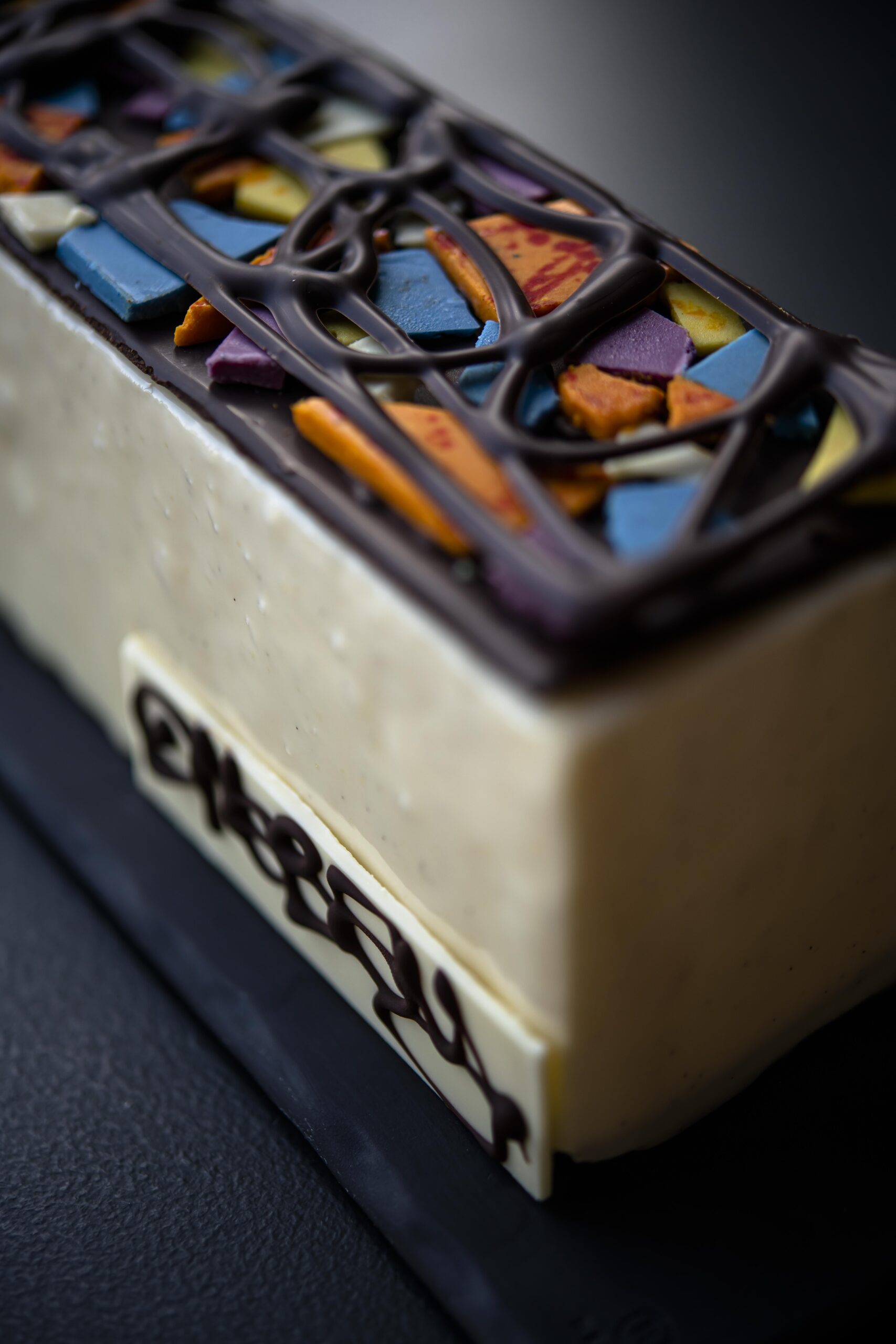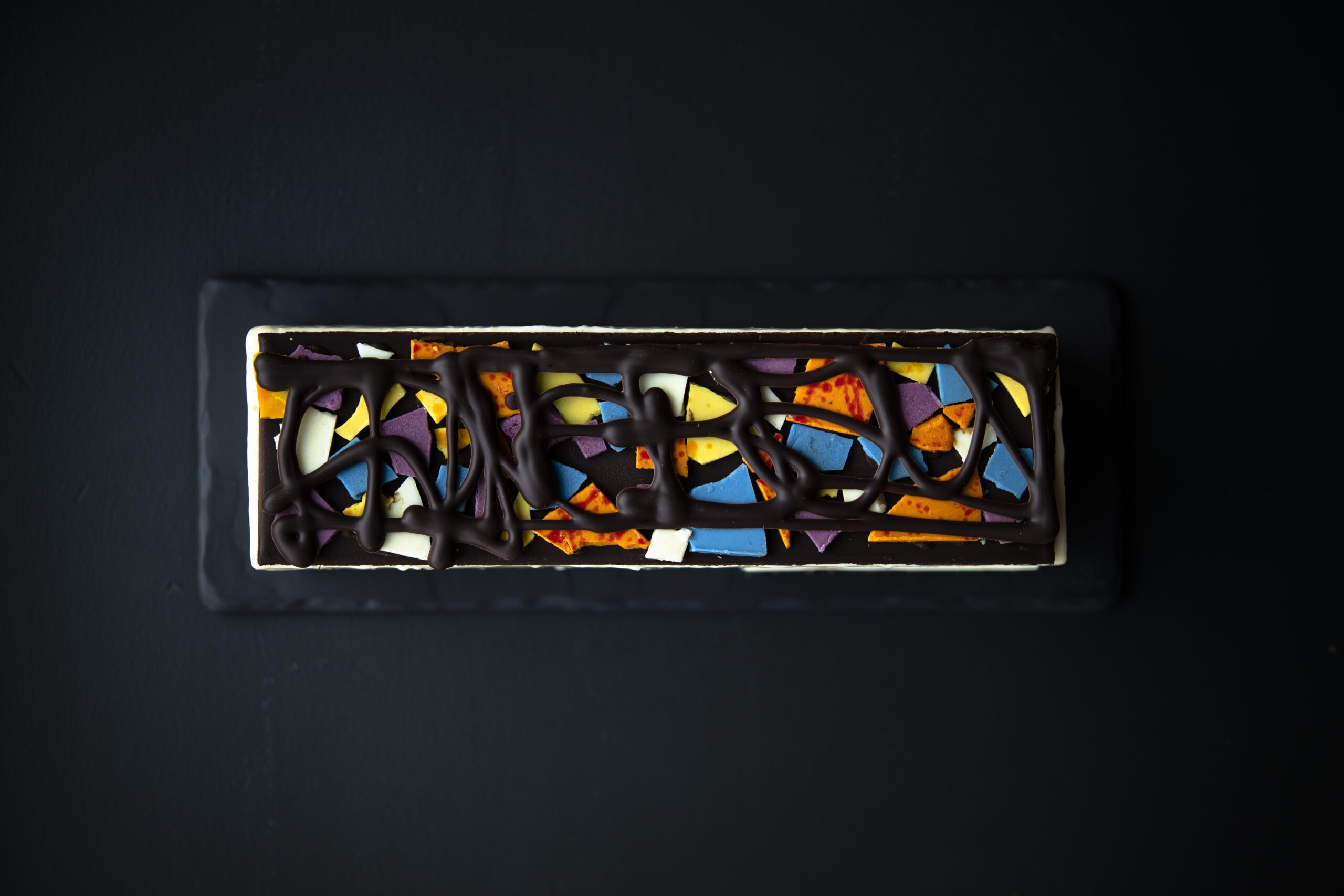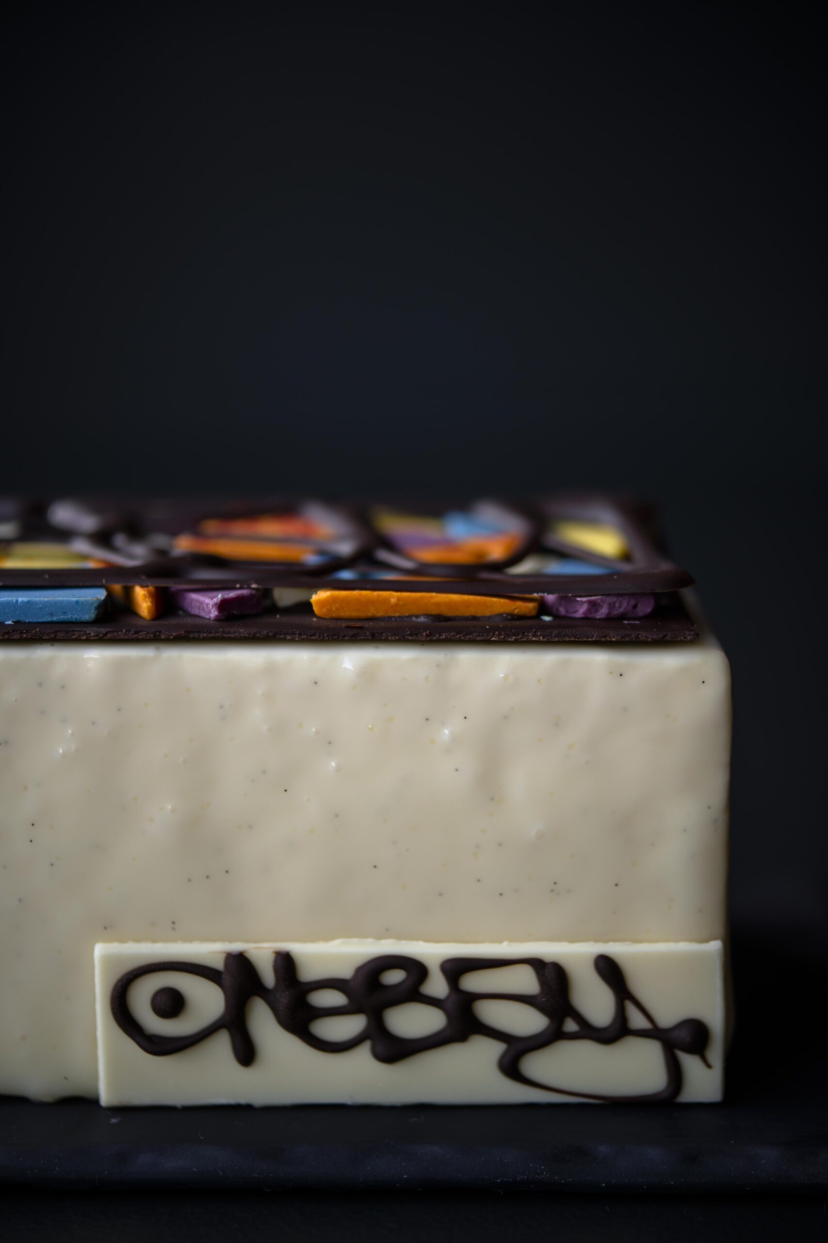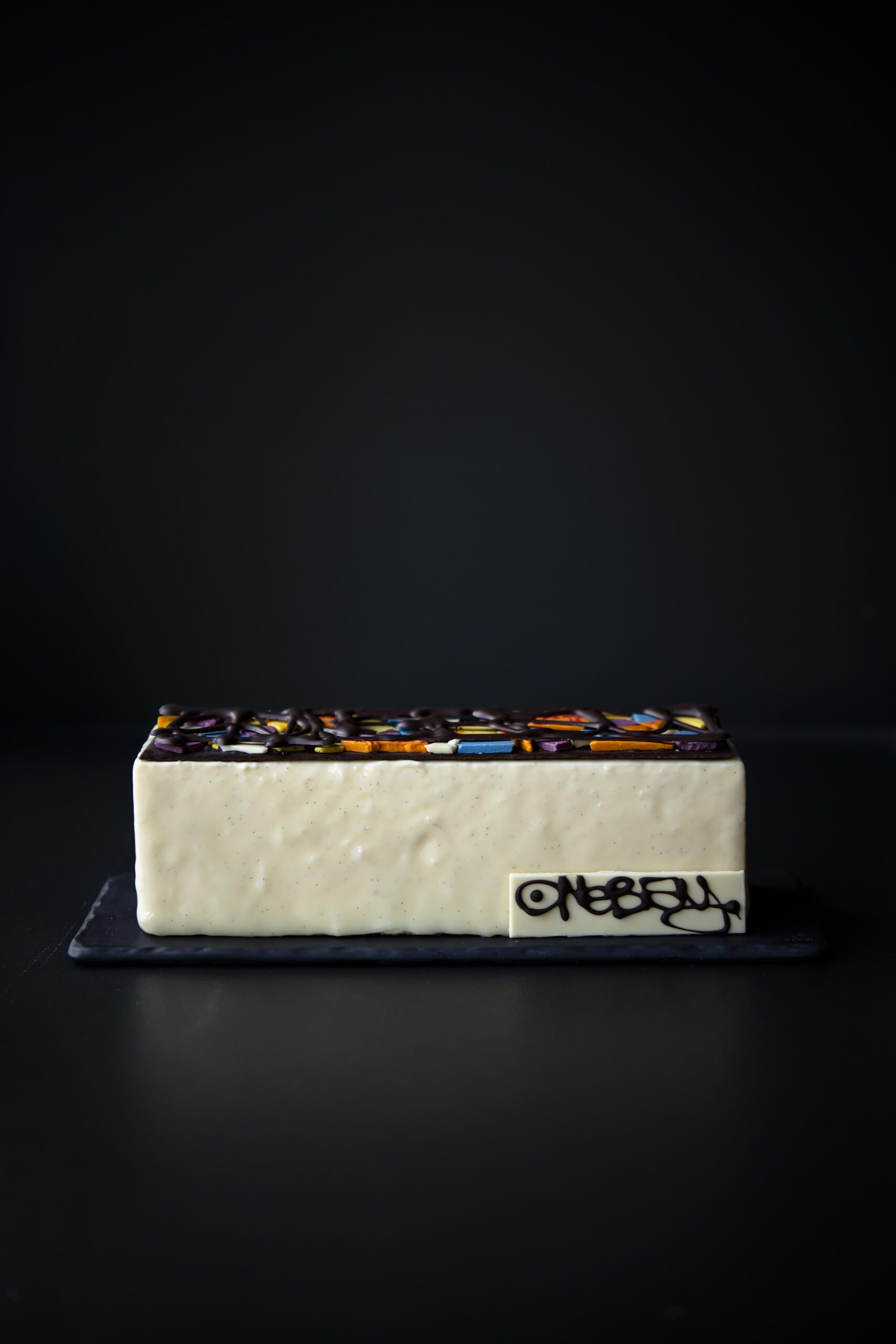 Chacun a pu laisser cours à ses envies créatives pour cette nouvelle création gourmande. Benoit Gressent a marié des saveurs de pommes caramélisées, citron et caramel sur du biscuit, muousse et brunoise. Nebay a sublimé visuellement la création de Benoît en apportant des morceaux de chocolat colorés posés en mosaïque, puis il appose son tag sur le dessus en utilisant la technique du dripping, version chocolat.