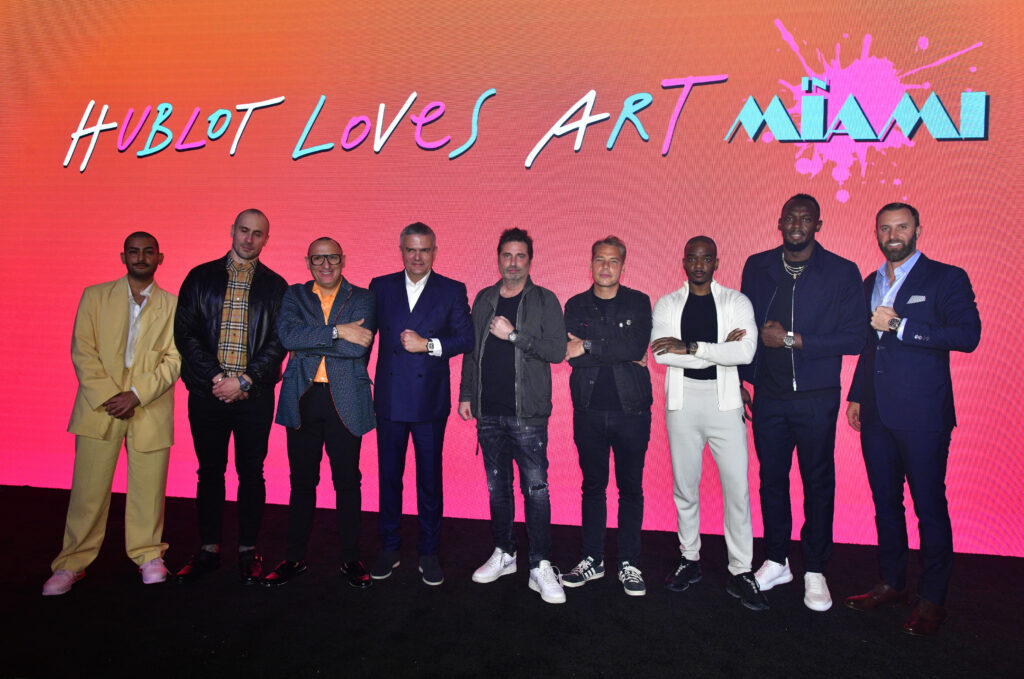 - MIAMI BEACH, FLORIDA – DECEMBER 02: (L-R) Mohammed Fayaz, Maxime P-Buchi, Marc Ferrero, Ricardo Guadalupe, Richard Orlinski, Shepard Fairey, Samuel Ross, Usain Bolt and Dustin Johnson attend Hublot Loves Art Miami at Faena Forum: Art Basel 2021 on December 02, 2021 in Miami Beach, Florida. (Photo by Eugene Gologursky/Getty Images for Hublot)