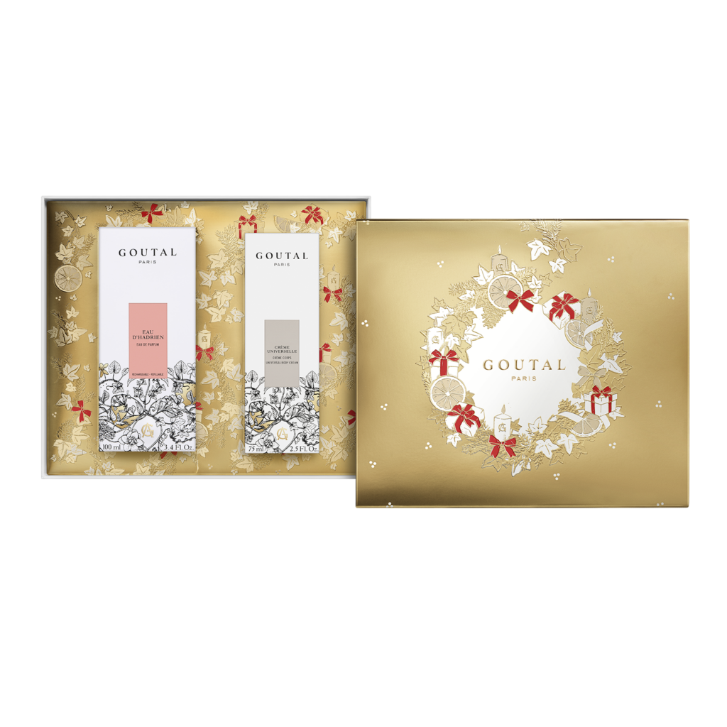 Au pied du sapin, des cadeau x s’amoncellent par dizaines dans leurs paquets colorés, trois mystérieux coffrets dorés brillent comme des trésors. Les emblématiques parfums Eau d’Hadrien, Petite Chérie et Tenue de Soirée s’accompagnent cette année de la Crème Universelle dans un format nomade. Enrichie en beurre de karité, cette crème onctueuse nourrit en profondeur et protège la peau. Ce 1er geste de beauté prépare au parfumage et s’adapte à toutes les créations olfactives de la maison.