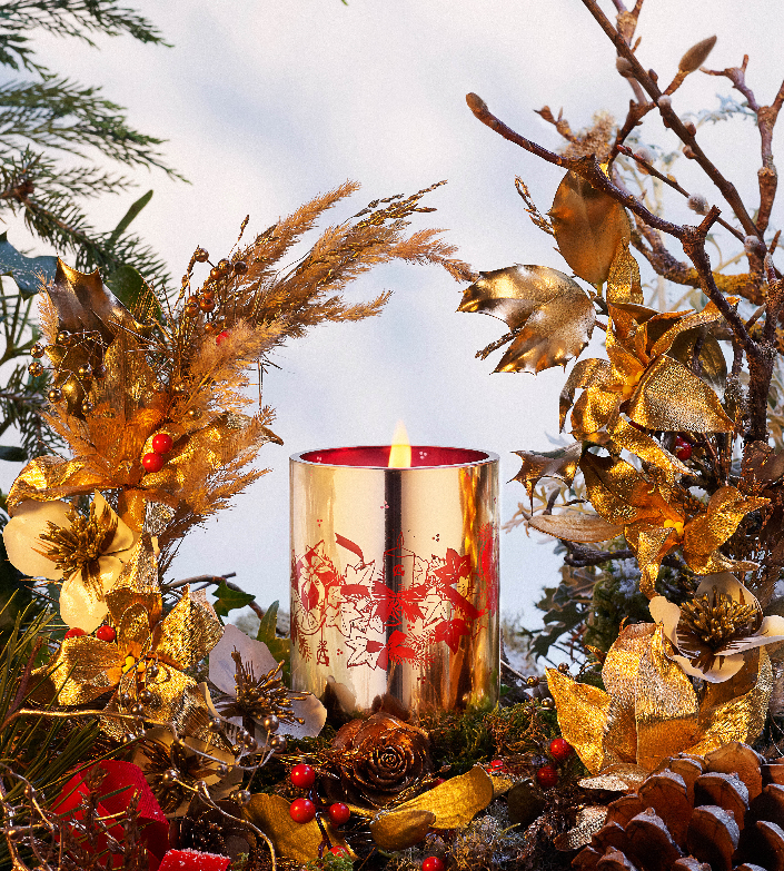 Sur la cheminée, au-dessus d’un feu qui n’en finit plus de brûler, des bougies parfumées illuminent la soirée magique de Noël. Cette senteur iconique imprègne la nuit et se fraye un chemin jusqu’aux petits et grands enfants, qui la respirent avec délice. Toute d’or vêtue, elle étincelle et émerveille tous les regards. Sous son habit de lumière, couronnée de lierre et de nœuds, elle diffuse l’odeur féerique des balades au milieu de la forêt, perdus entre les sapins recouverts de leur grand manteau blanc, des mandarines et des oranges fraîches dans les poches pour les goûters d’hiver.