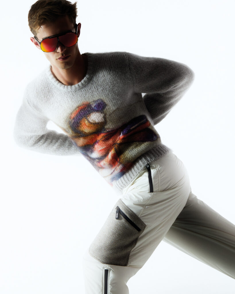 Pour la saison automne/hiver 21/22, la collection Giorgio Armani Neve pour le ski et l’après-ski propose aux femmes une garde-robe composée de parkas jacquard, de blousons et vestes tricotés, de ponchos matelassés, de pantalons et de pulls en laine, et d’une palette de couleurs qui mêle tons pastel et noir essentiel. Pour les hommes, la garde-robe comprend des parkas et des vestes en cachemire ou en denim laine déperlantes, des blousons réversibles et des pulls et sweats en cachemire uni, le tout dans des tons bleus, gris et neutres avec des imprimés effet aquarelle ou des graphismes jacquard de skieurs.